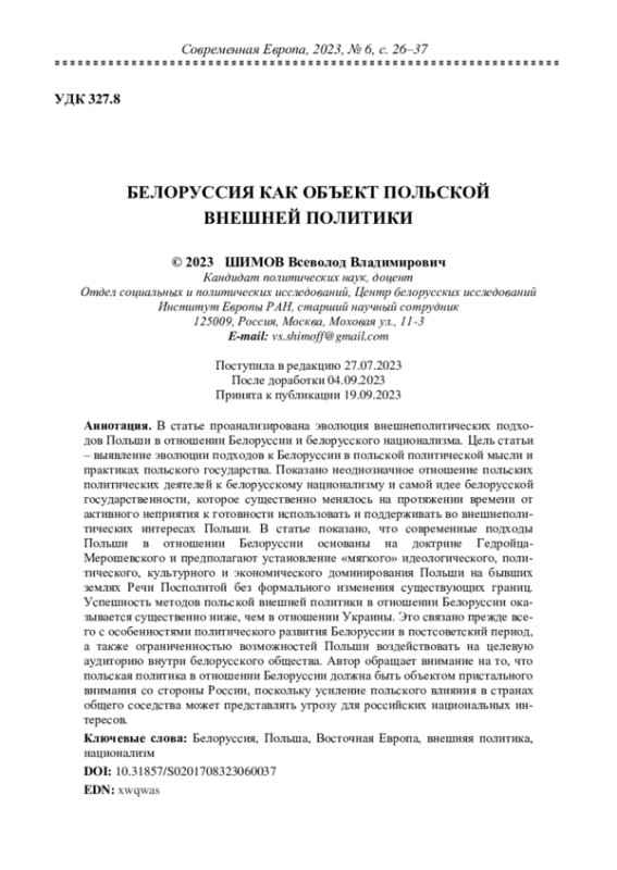 В статье проанализирована эволюция внешнеполитических подходов Польши в отношении Белоруссии и белорусского национализма. Цель статьи – выявление эволюции подходов к Белоруссии в польской политической мысли и практиках польского государства. Показано неоднозначное отношение польских политических деятелей к белорусскому национализму и самой идее белорусской государственности, которое существенно менялось на протяжении времени от активного неприятия к готовности использовать и поддерживать во внешнеполитических интересах Польши. В статье показано, что современные подходы Польши в отношении Белоруссии основаны на доктрине ГедройцаМерошевского и предполагают установление «мягкого» идеологического, политического, культурного и экономического доминирования Польши на бывших землях Речи Посполитой без формального изменения существующих границ. Успешность методов польской внешней политики в отношении Белоруссии оказывается существенно ниже, чем в отношении Украины. Это связано прежде всего с особенностями политического развития Белоруссии в постсоветский период, а также ограниченностью возможностей Польши воздействовать на целевую аудиторию внутри белорусского общества. Автор обращает внимание на то, что польская политика в отношении Белоруссии должна быть объектом пристального внимания со стороны России, поскольку усиление польского влияния в странах общего соседства может представлять угрозу для российских национальных интересов