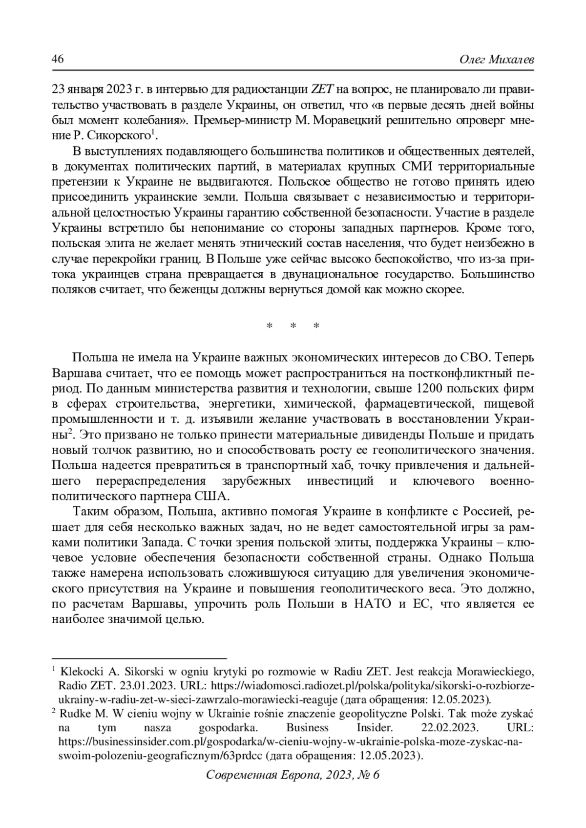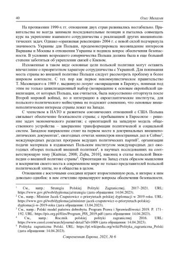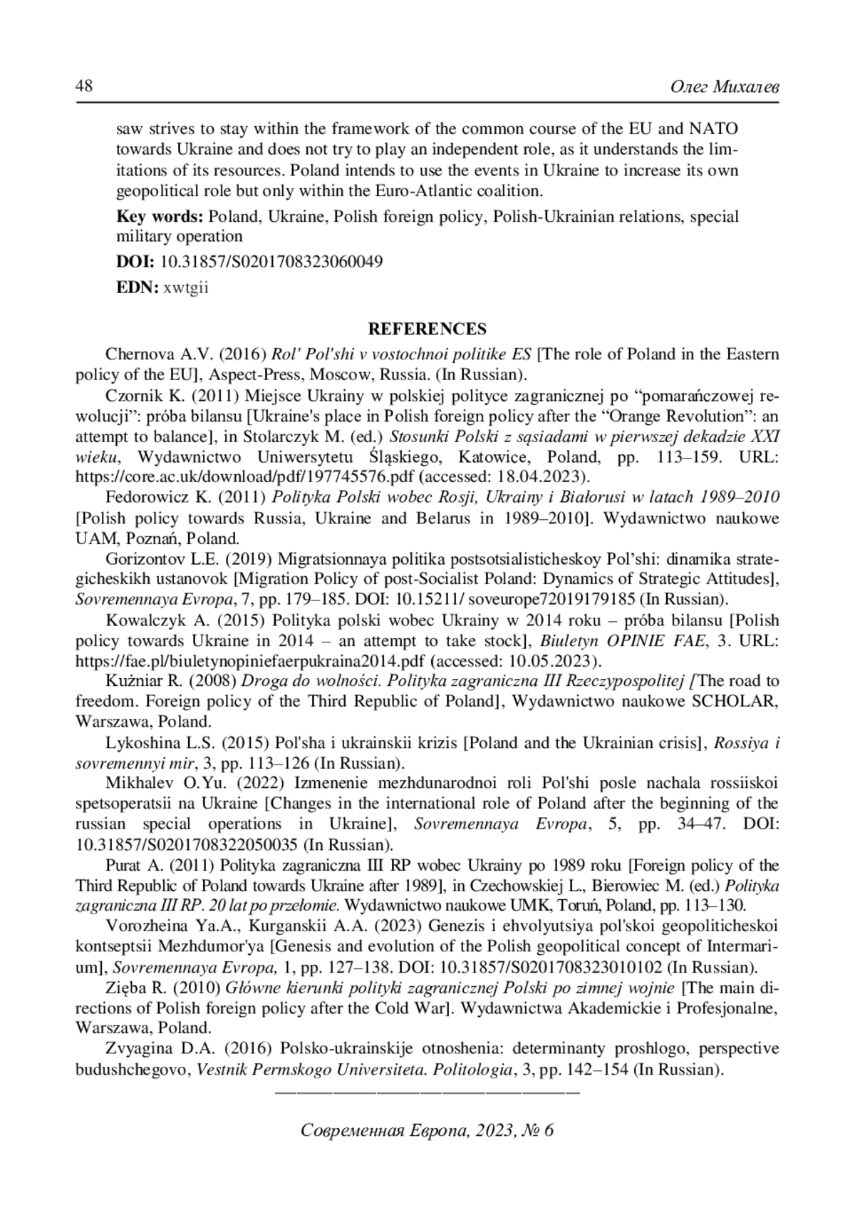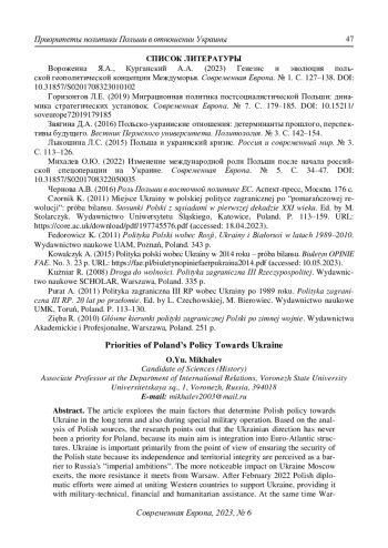 5. Михалев О.Ю. (2022) Изменение международной роли Польши после начала российской спецоперации на Украине. Современная Европа. № 5. С. 34-47. DOI: 10.31857/S0201708322050035 EDN: GLOIUA