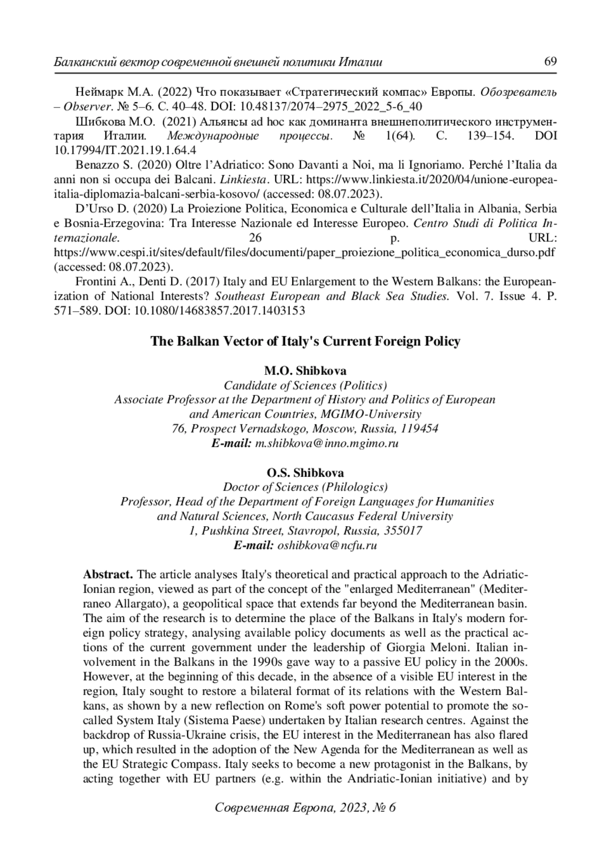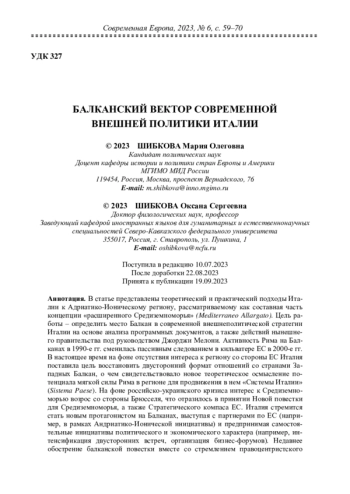 В статье представлены теоретический и практический подходы Италии к Адриатико-Ионическому региону, рассматриваемому как составная часть концепции «расширенного Средиземноморья» (Mediterraneo Allargato). Цель работы – определить место Балкан в современной внешнеполитической стратегии Италии на основе анализа программных документов, а также действий нынешнего правительства под руководством Джорджи Мелони. Активность Рима на Балканах в 1990-е гг. сменилась пассивным следованием в кильватере ЕС в 2000-е гг. В настоящее время на фоне отсутствия интереса к региону со стороны ЕС Италия поставила цель восстановить двусторонний формат отношений со странами Западных Балкан, о чем свидетельствовало новое теоретическое осмысление потенциала мягкой силы Рима в регионе для продвижения в нем «Системы Италии» (Sistema Paese). На фоне российско-украинского кризиса интерес к Средиземноморью возрос со стороны Брюсселя, что отразилось в принятии Новой повестки для Средиземноморья, а также Стратегического компаса ЕС. Италия стремится стать новым протагонистом на Балканах, выступая с партнерами по ЕС (например, в рамках Андриатико-Ионической инициативы) и предпринимая самостоятельные инициативы политического и экономического характера (например, интенсификация двусторонних встреч, организация бизнес-форумов). Недавнее обострение балканской повестки вместе со стремлением правоцентристского правительства к общей активизации внешней политики, а также поискам дополнительных рынков сбыта и бизнес-партнеров среди ближайших соседей открывают новые возможности для итальянской дипломатии