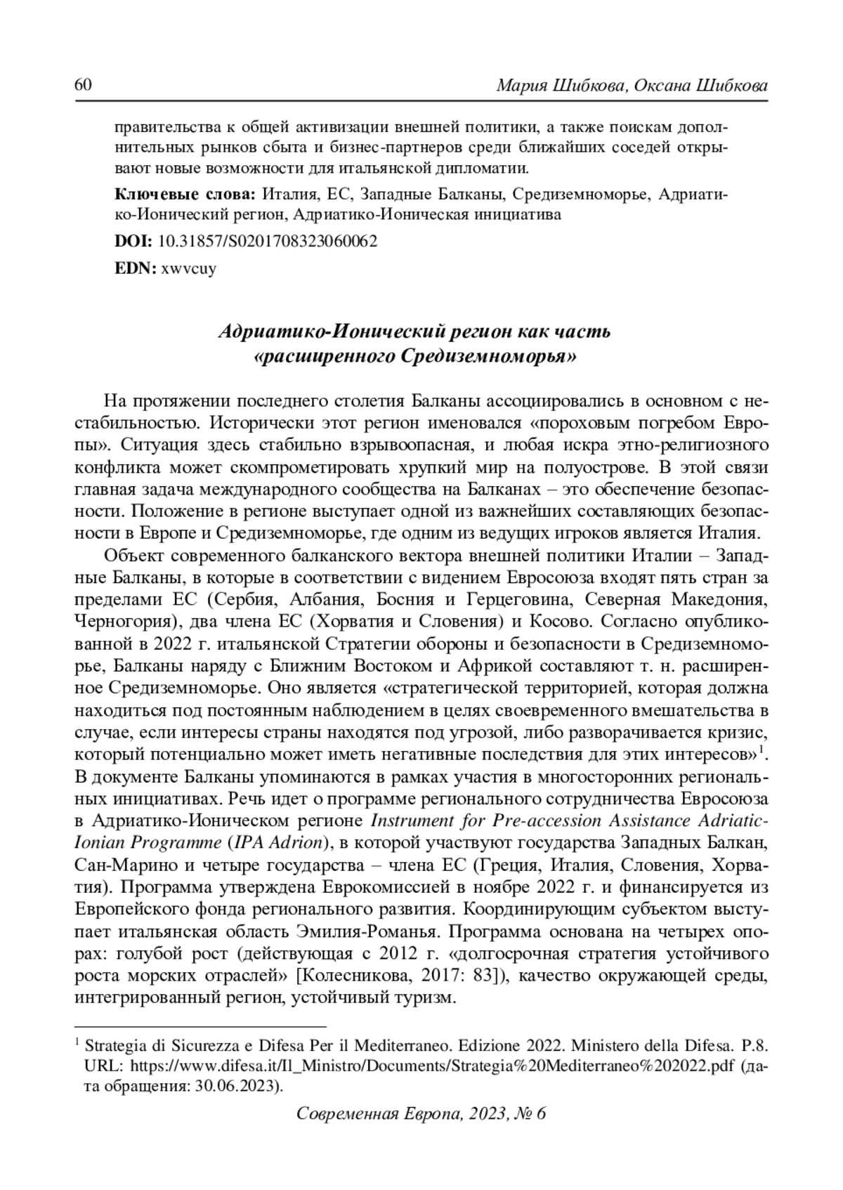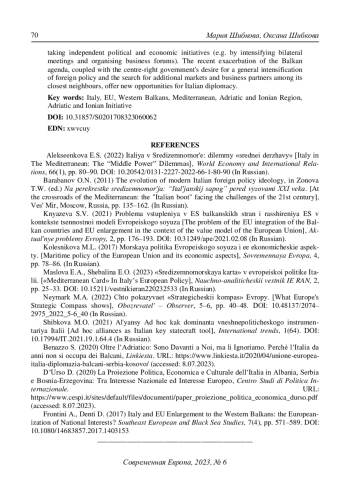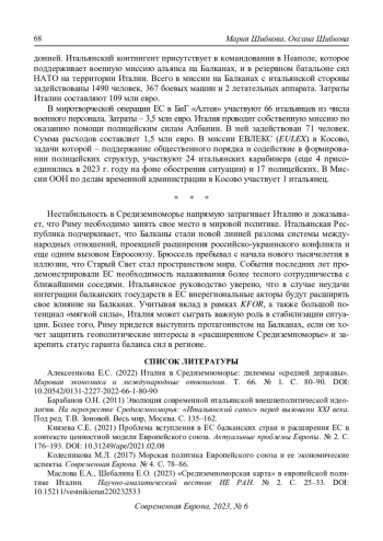5. Маслова Е.А., Шебалина Е.О. (2023) “Средиземноморская карта” в европейской политике Италии. Научно-аналитический вестник ИЕ РАН. № 2. С. 25-33. DOI: 10.15211/vestnikieran220232533 EDN: YPMMWY