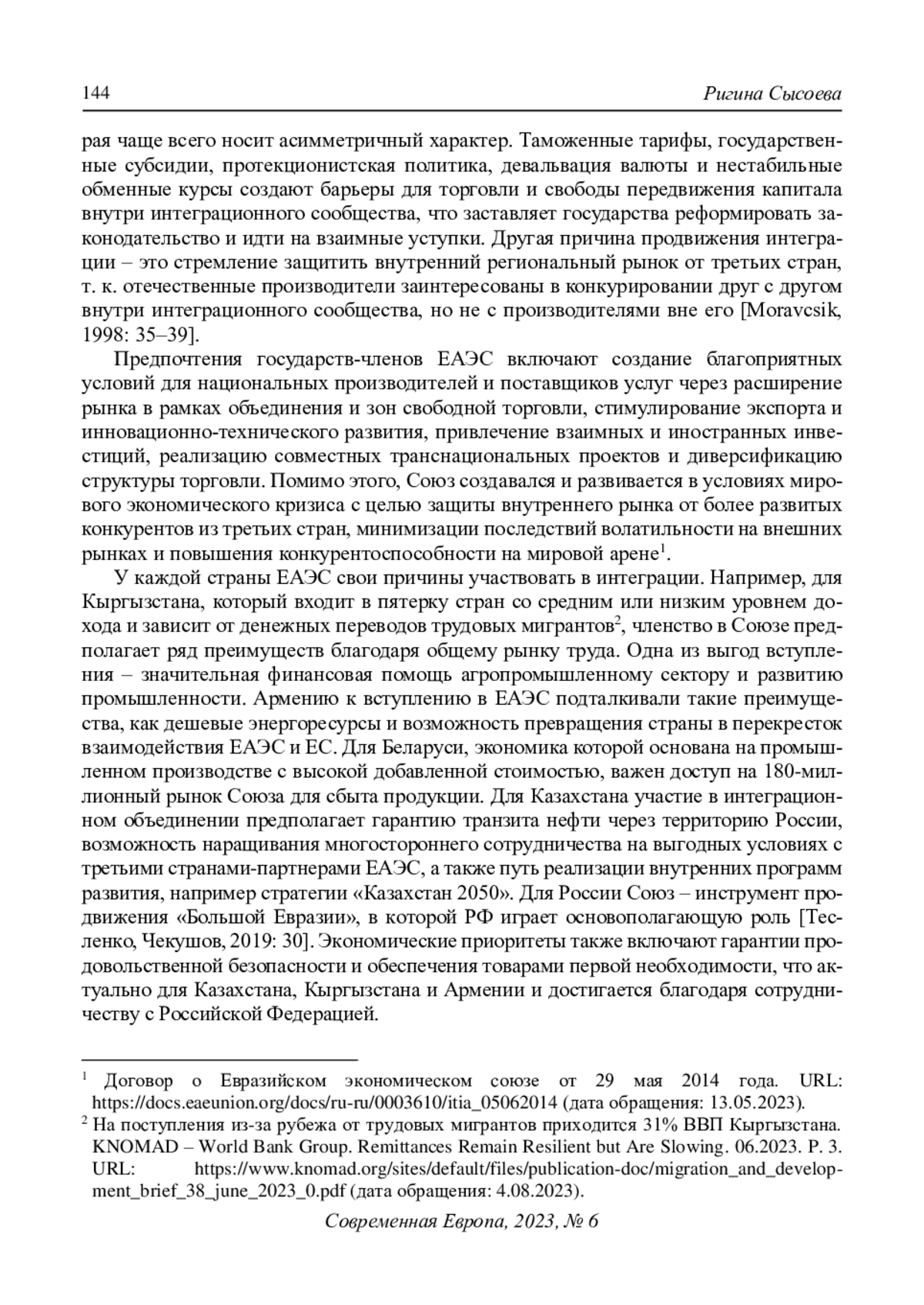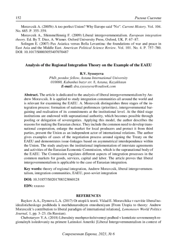 Статья посвящена анализу Евразийского экономического союза (ЕАЭС) через призму либерального интерговернментализма Эндрю Моравчика. Использование этой теории внесет вклад в исследования ЕАЭС, т. к. этот подход используется для анализа интеграционных сообществ по всему миру. Э. Моравчик выделяет три этапа интеграционного процесса: формирование национальных предпочтений (приоритетов), межправительственные переговоры и реализация договоренностей на институциональном уровне. На третьем этапе институты наделяются наднациональными полномочиями, что становится возможным за счет объединения или делегирования суверенитетов. Посредством применения этой теоретической модели описаны причины, по которым страны делают выбор в пользу интеграции, такие как общая потребность в развитии транснациональной кооперации, расширение рынка для местных производителей, защита от третьих стран и позиционирование Союза как самостоятельного актора на мировой арене. В статье приведены примеры кейсов переговорного процесса при подписании Договора о ЕАЭС и объединении вопросов, которые связываются на основе асимметричной взаимозависимости внутри интеграционного объединения. Кроме того, сделан анализ институциональной имплементации межгосударственных договоренностей и деятельности Евразийской экономической комиссии, которая наделена полномочиями по регулированию различных аспектов интеграционных процессов на общих рынках товаров, услуг, капитала и труда. Исследование доказывает, что либеральный интерговернментализм применим для изучения евразийской интеграции