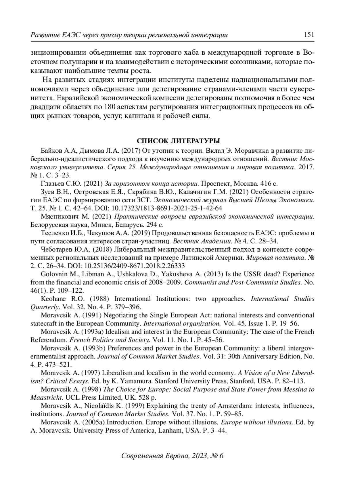 1. Байков A.A, Дымова Л.А. (2017) От утопии к теории. Вклад Э. Моравчика в развитие либерально-идеалистического подхода к изучению международных отношений. Вестник Московского университета. Серия 25. Международные отношения и мировая политика. 2017. №1. C. 3-23. EDN: ZHRBCH