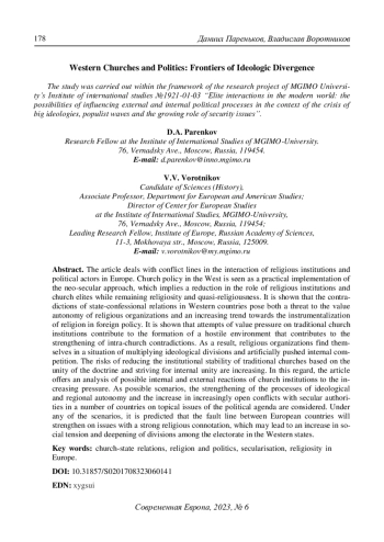 В статье проанализированы конфликтные линии во взаимодействии религиозных институтов и политических акторов в Европе. Политика в отношении церквей на Западе рассматривается как практическая реализация неосекулярного подхода, который подразумевает снижение роли религиозных институтов и церковных элит при сохраняющейся религиозности и квазирелигиозности. Показано, что противоречия государственно-конфессиональных отношений в странах Запада несут в себе как угрозу ценностной автономии религиозных организаций, так и усиление тренда на инструментализацию религии во внешней политике. Показано, что попытки ценностного давления на традиционные церковные институты способствуют формированию враждебной среды, способствующей усилению внутрицерковных противоречий. В результате религиозные организации оказываются в ситуации множащихся идейных размежеваний и искусственно подталкиваемой внутренней конкуренции. Возрастают риски снижения институциональной устойчивости традиционных церквей, опирающихся на единство вероучения и стремящихся к внутреннему единству. В этой связи в статье дан анализ возможных внутренних и внешних реакций церковных институтов на усиливающееся давление. В качестве возможных сценариев рассматриваются усиление процессов идейно-региональной автономизации и нарастание все более открытых конфликтов со светскими властями в ряде стран по актуальным вопросам политической повестки дня. При любом из сценариев прогнозируется усиление линии разломов между европейскими странами в вопросах, имеющих сильную религиозную окраску, что может привести к росту социального напряжения и углублению размежеваний среди электората в странах Запада