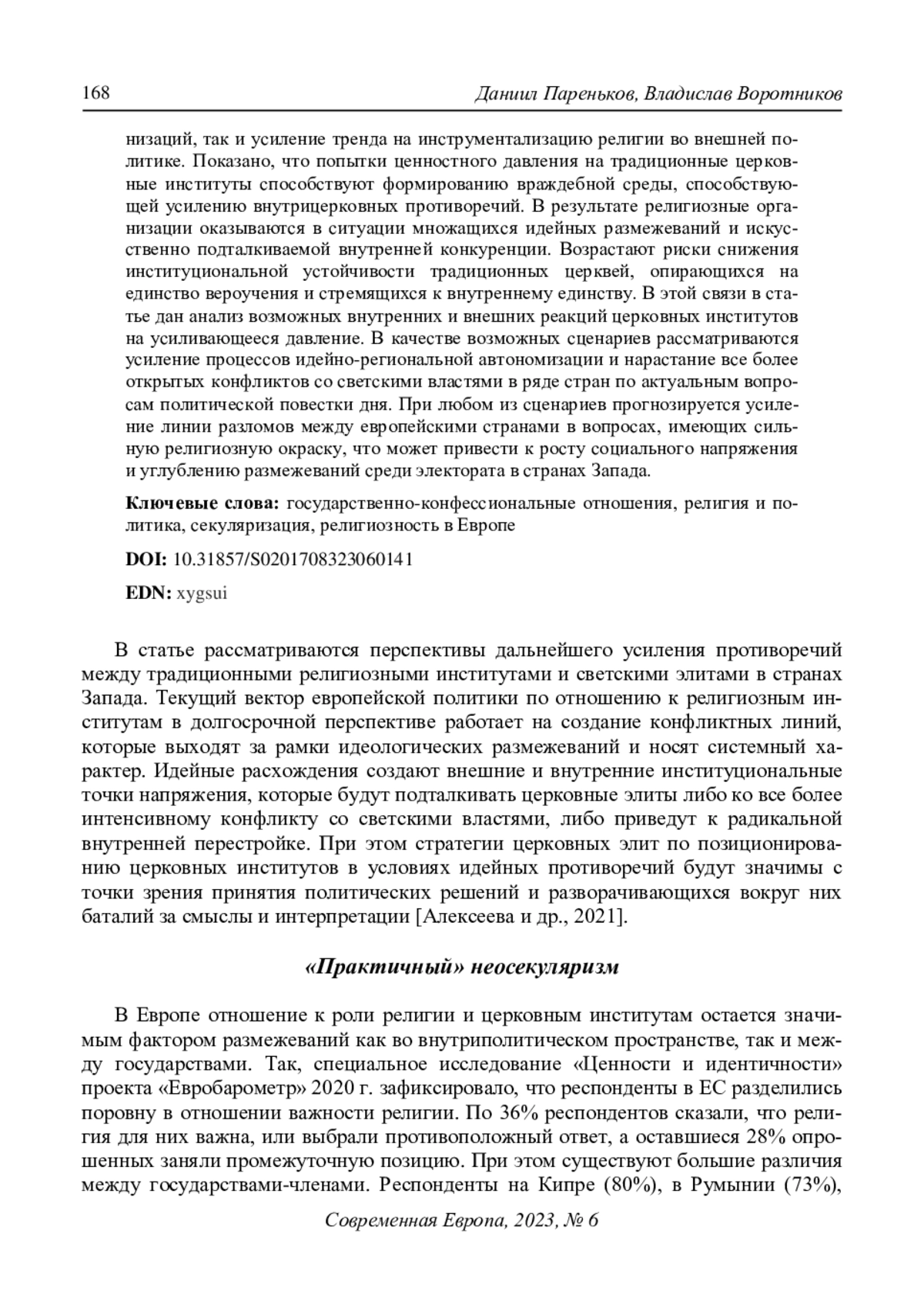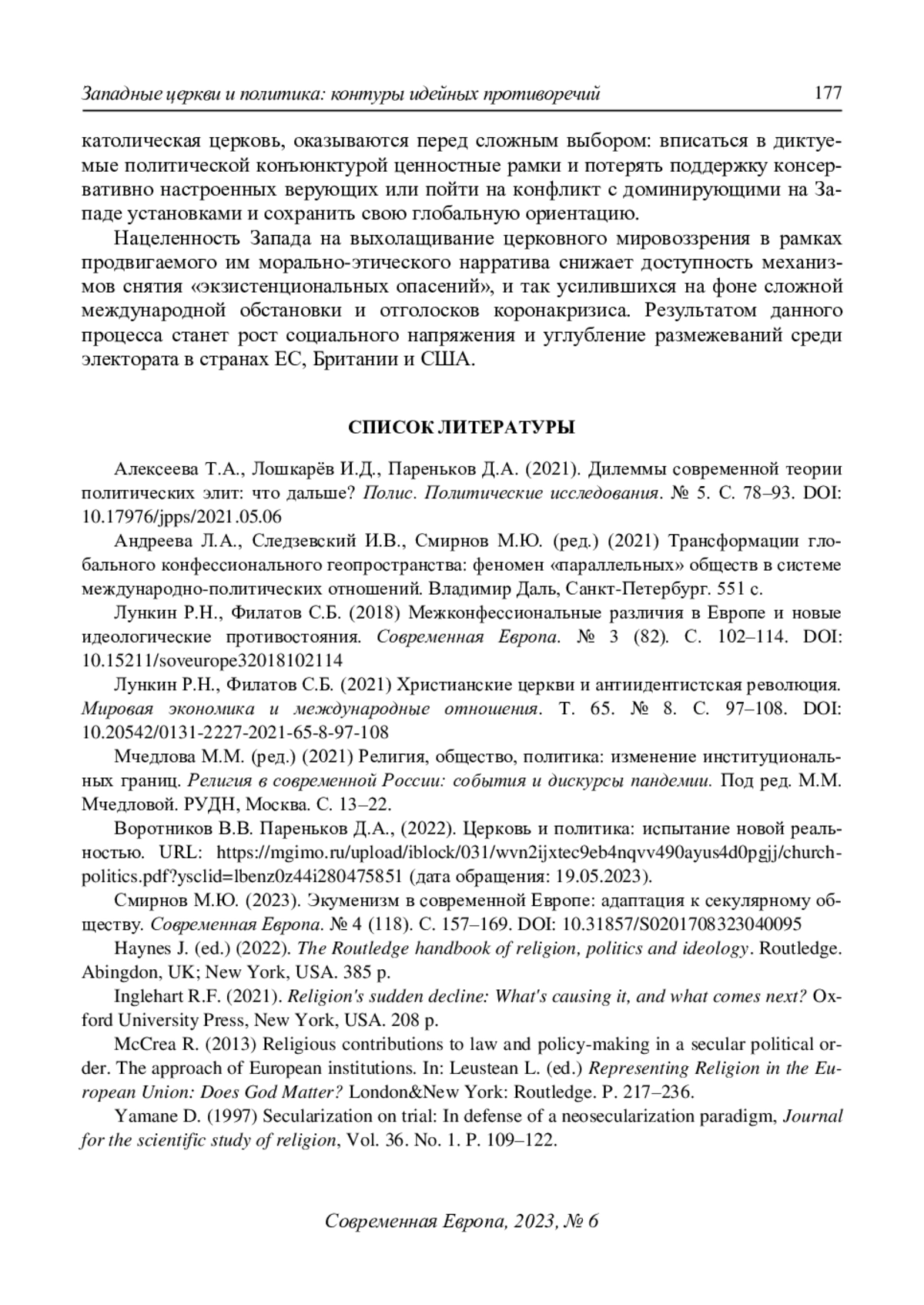 6. Воротников В.В. Пареньков Д.А., (2022). Церковь и политика: испытание новой реальностью. URL: https://mgimo.ru/upload/iblock/031/wvn2ijxtec9eb4nqvv490ayus4d0pgjj/church-politics.pdf?ysclid=lbenz0z44i280475851 (дата обращения: 19.05.2023). EDN: TFPWVF