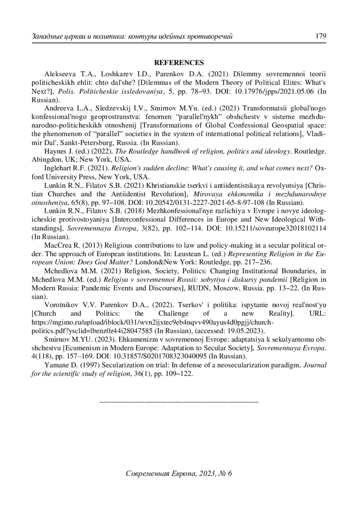 4. Лункин Р.Н., Филатов С.Б. (2021) Христианские церкви и антиидентистская революция. Мировая экономика и международные отношения. Т. 65. № 8. С. 97-108. DOI: 10.20542/0131-2227-2021-65-8-97-108 EDN: SVFDRH