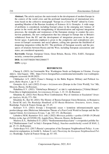 2. Колотаев Ю.Ю. (2021) Европа и Европейский союз в контексте информационных угроз постковидного мира. Современная Европа. № 7. С. 143-151. DOI: 10.15211/soveurope72021135143 EDN: QBBWYA