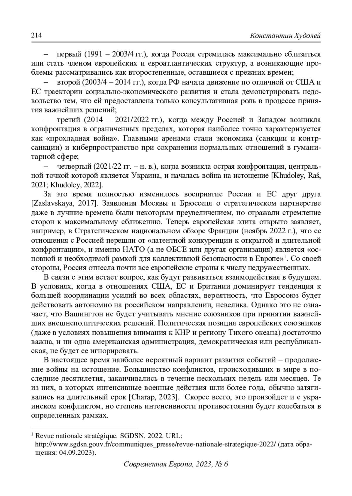 8. Khudoley K. (2022) New Russia-West Confrontation: War of Attrition or Escalation? Strate-gic Analysis. Vol. 46. No. 6. P. 571-584. DOI: 10.1080/09700161.2022.2149980 EDN: QXZPIW