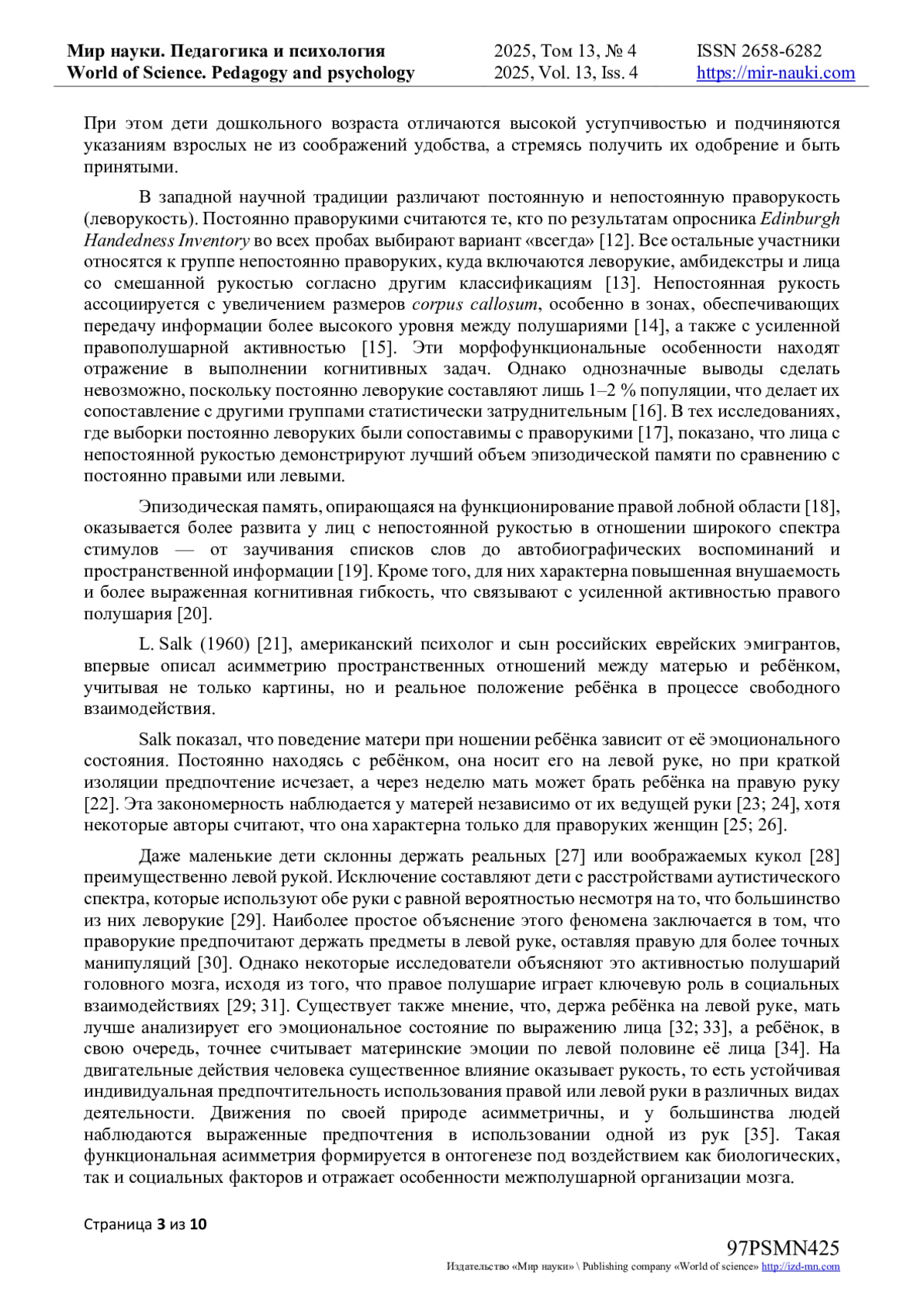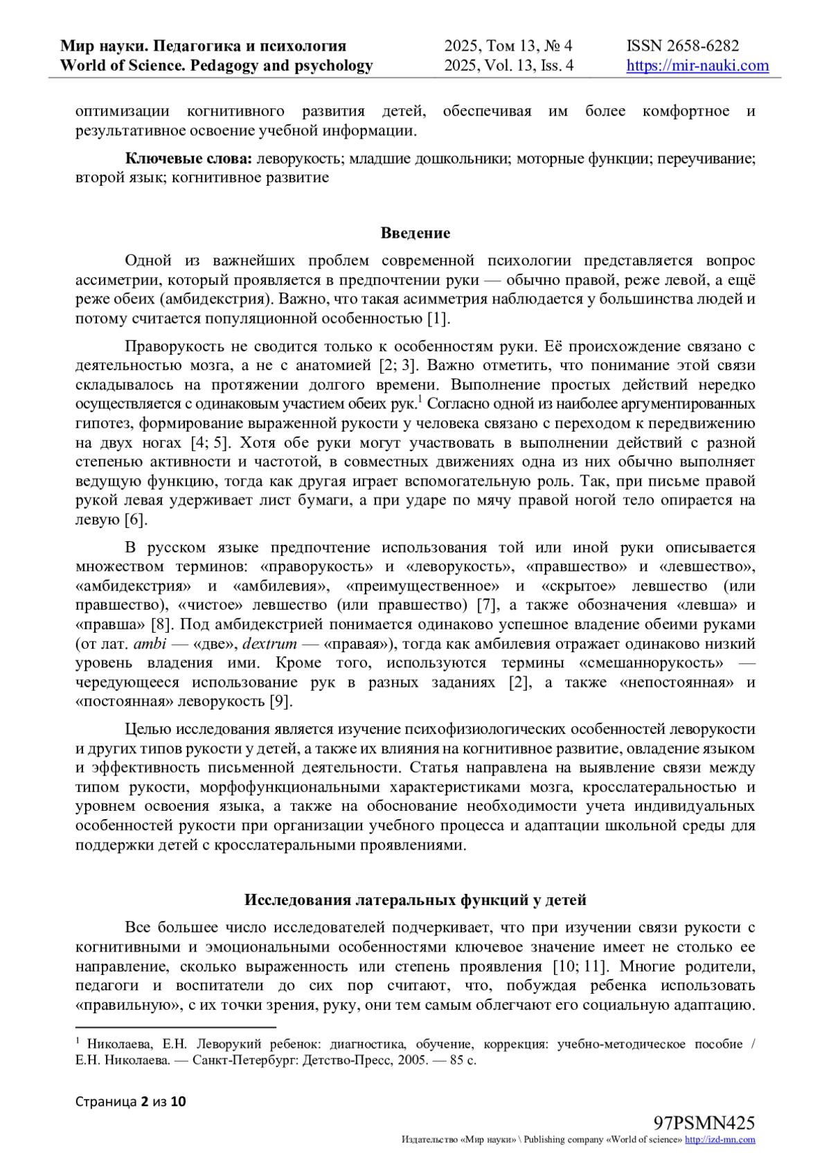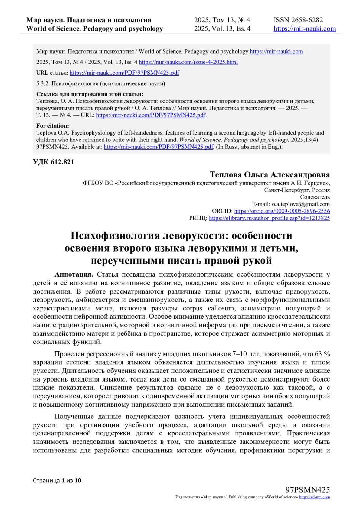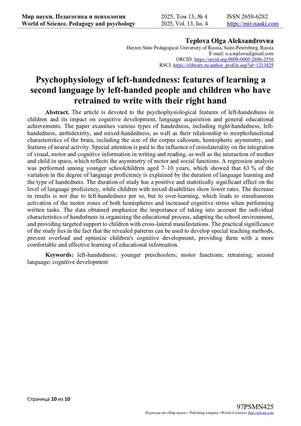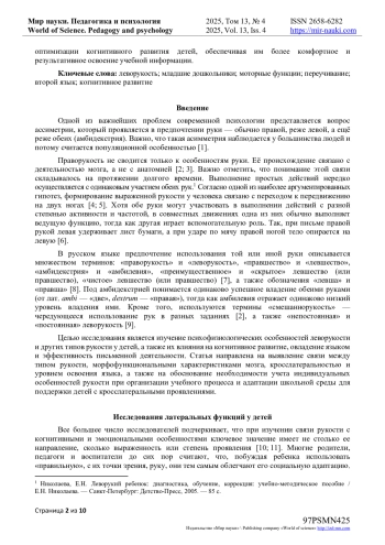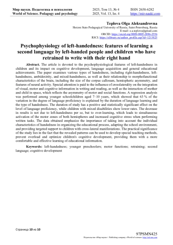Статья посвящена психофизиологическим особенностям леворукости у детей и её влиянию на когнитивное развитие, овладение языком и общие образовательные достижения. В работе рассматриваются различные типы рукости, включая праворукость, леворукость, амбидекстрия и смешаннорукость, а также их связь с морфофункциональными характеристиками мозга, включая размеры corpus callosum, асимметрию полушарий и особенности нейронной активности. Особое внимание уделяется влиянию кросслатеральности на интеграцию зрительной, моторной и когнитивной информации при письме и чтении, а также взаимодействию матери и ребёнка в пространстве, которое отражает асимметрию моторных и социальных функций.