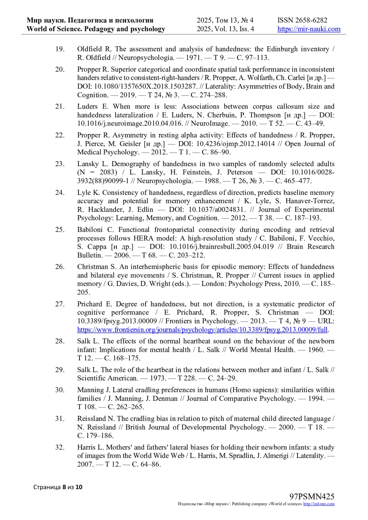 27. Prichard E. Degree of handedness, but not direction, is a systematic predictor of cognitive performance / E. Prichard, R. Propper, S. Christman - // Frontiers in Psychology. - 2013. - Т 4, № 9 - URL: https://www.frontiersin.org/journals/psychology/articles//full. DOI: 10.3389/fpsyg.2013.00009