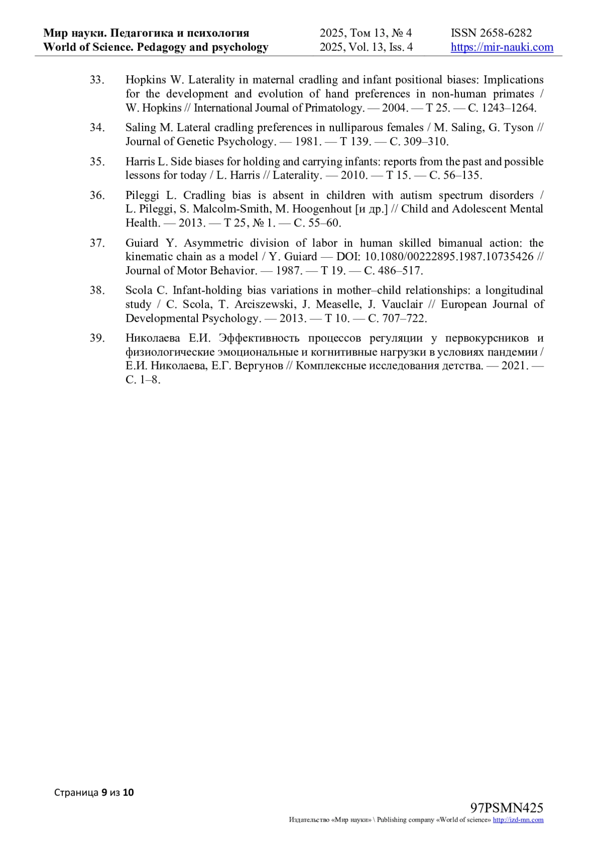 30. Manning J. Lateral cradling preferences in humans (Homo sapiens): similarities within families / J. Manning, J. Denman // Journal of Comparative Psychology. - 1994. - Т 108. - С. 262-265. EDN: HIJDTX
