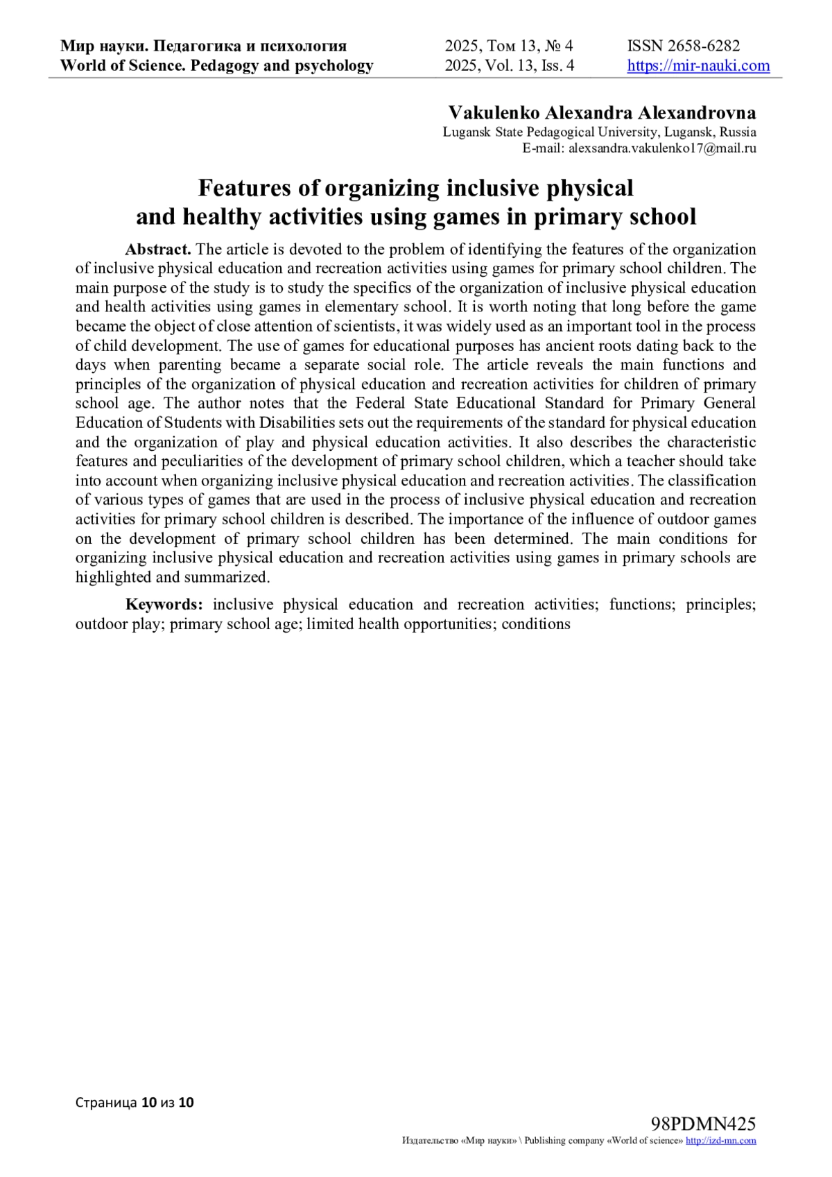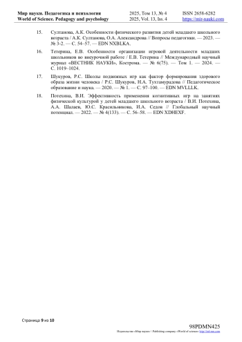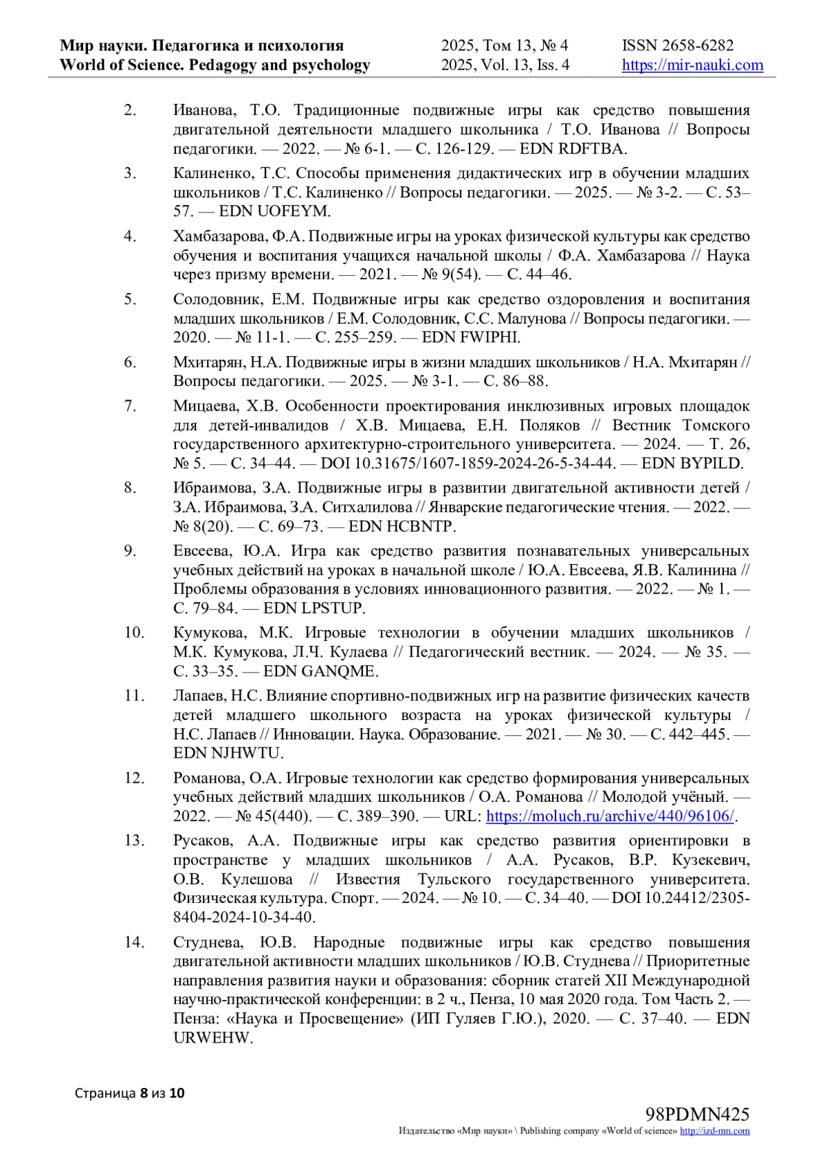 6. Мхитарян, Н.А. Подвижные игры в жизни младших школьников / Н.А. Мхитарян // Вопросы педагогики. - 2025. - № 3-1. - С. 86-88. EDN: IWVXEC