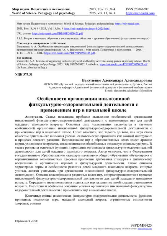 Статья посвящена проблеме выявлению особенностей организации инклюзивной физкультурно-оздоровительной деятельности с применением игр для детей младшего школьного возраста.