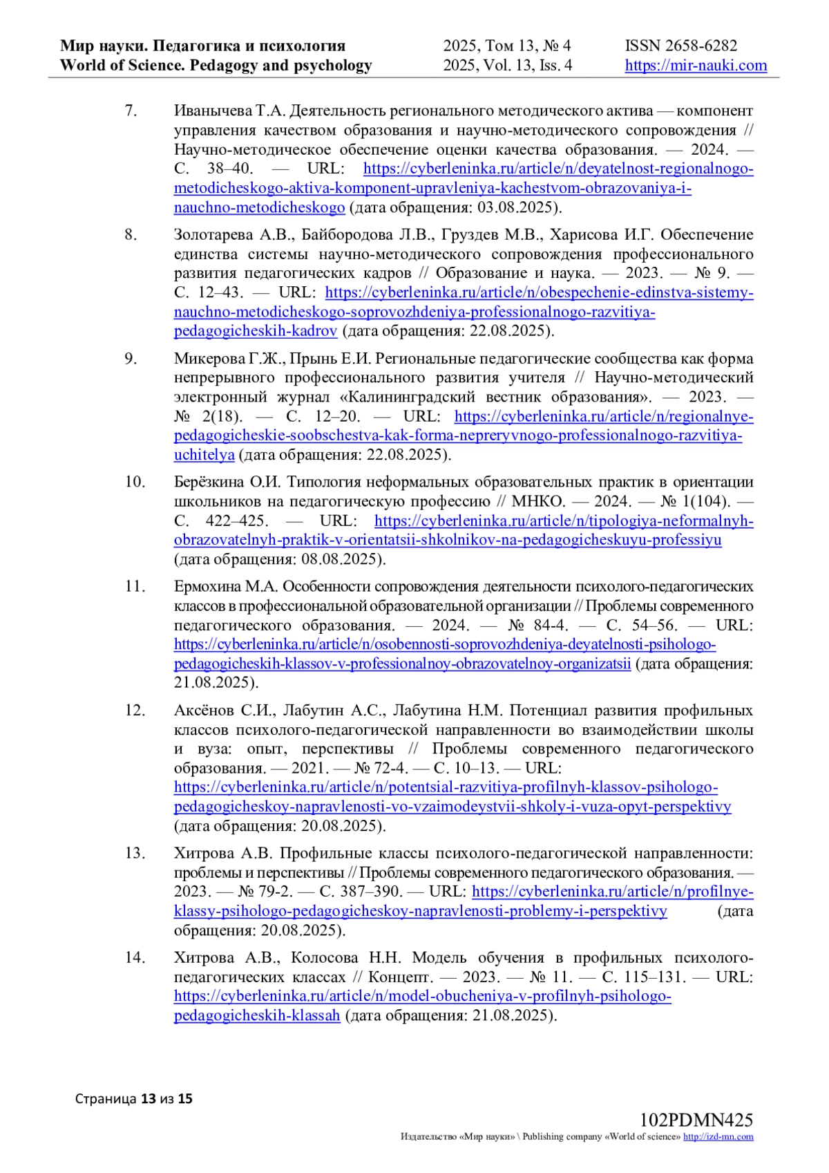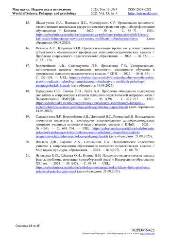 14. Хитрова А.В., Колосова Н.Н. Модель обучения в профильных психолого-педагогических классах // Концепт. - 2023. - № 11. - С. 115-131. - URL: https://cyberleninka.ru/article/n/model-obucheniya-v-profilnyh-psihologo-pedagogicheskih-klassah (дата обращения: 21.08.2025).