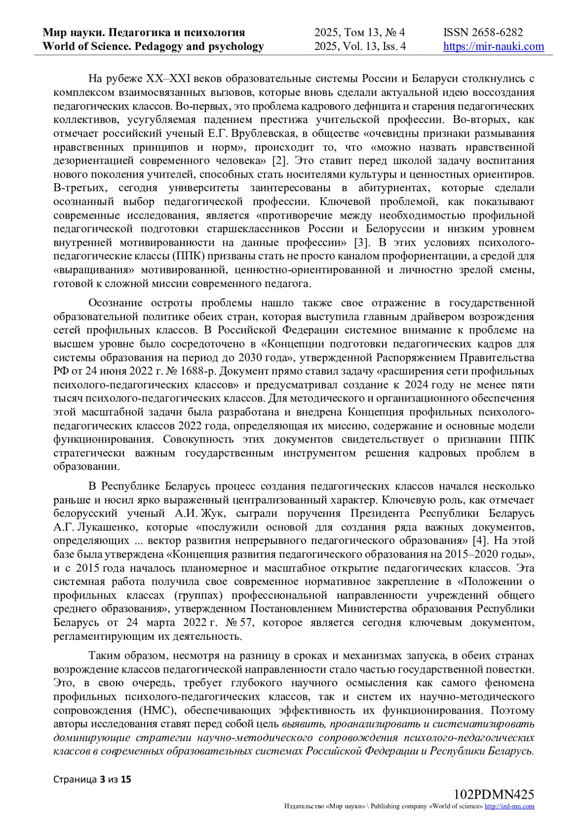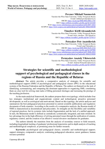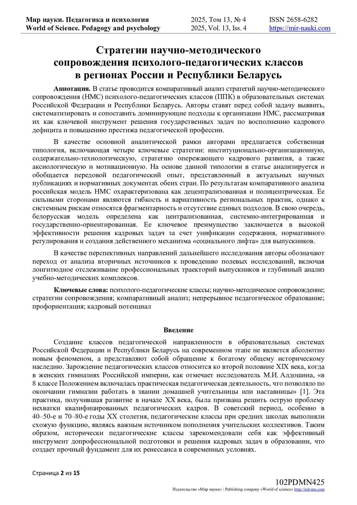 В статье проводится компаративный анализ стратегий научно-методического сопровождения (НМС) психолого-педагогических классов (ППК) в образовательных системах Российской Федерации и Республики Беларусь. Авторы ставят перед собой задачу выявить, систематизировать и сопоставить доминирующие подходы к организации НМС, рассматривая их как ключевой инструмент решения государственных задач по восполнению кадрового дефицита и повышению престижа педагогической профессии.