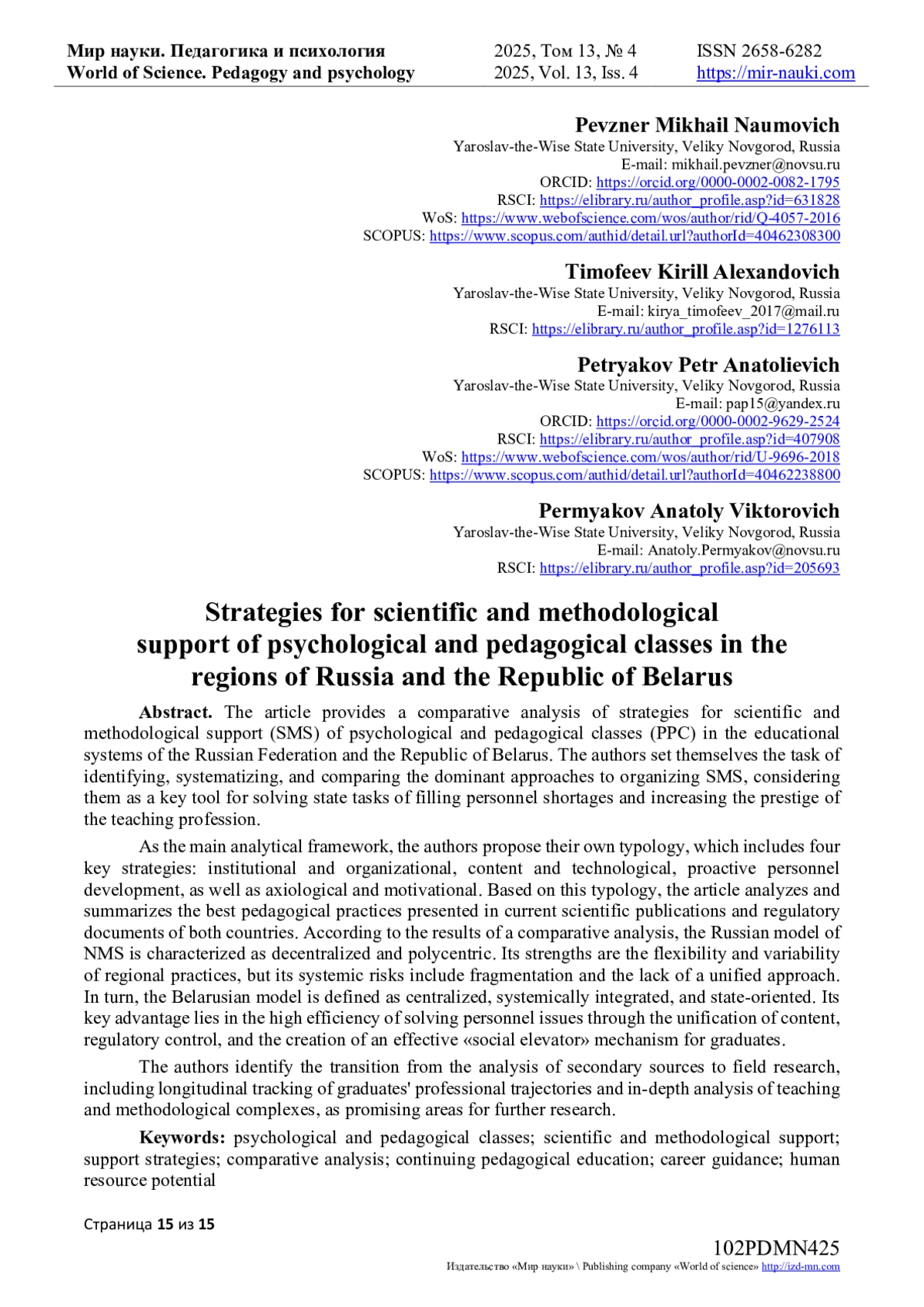 В качестве основной аналитической рамки авторами предлагается собственная типология, включающая четыре ключевые стратегии: институционально-организационную, содержательно-технологическую, стратегию опережающего кадрового развития, а также аксиологическую и мотивационную. На основе данной типологии в статье анализируется и обобщается передовой педагогический опыт, представленный в актуальных научных публикациях и нормативных документах обеих стран. По результатам компаративного анализа российская модель НМС охарактеризована как децентрализованная и полицентрическая. Ее сильными сторонами являются гибкость и вариативность региональных практик, однако к системным рискам относятся фрагментарность и отсутствие единых подходов. В свою очередь, белорусская модель определена как централизованная, системно-интегрированная и государственно-ориентированная. Ее ключевое преимущество заключается в высокой эффективности решения кадровых задач за счет унификации содержания, нормативного регулирования и создания действенного механизма «социального лифта» для выпускников.