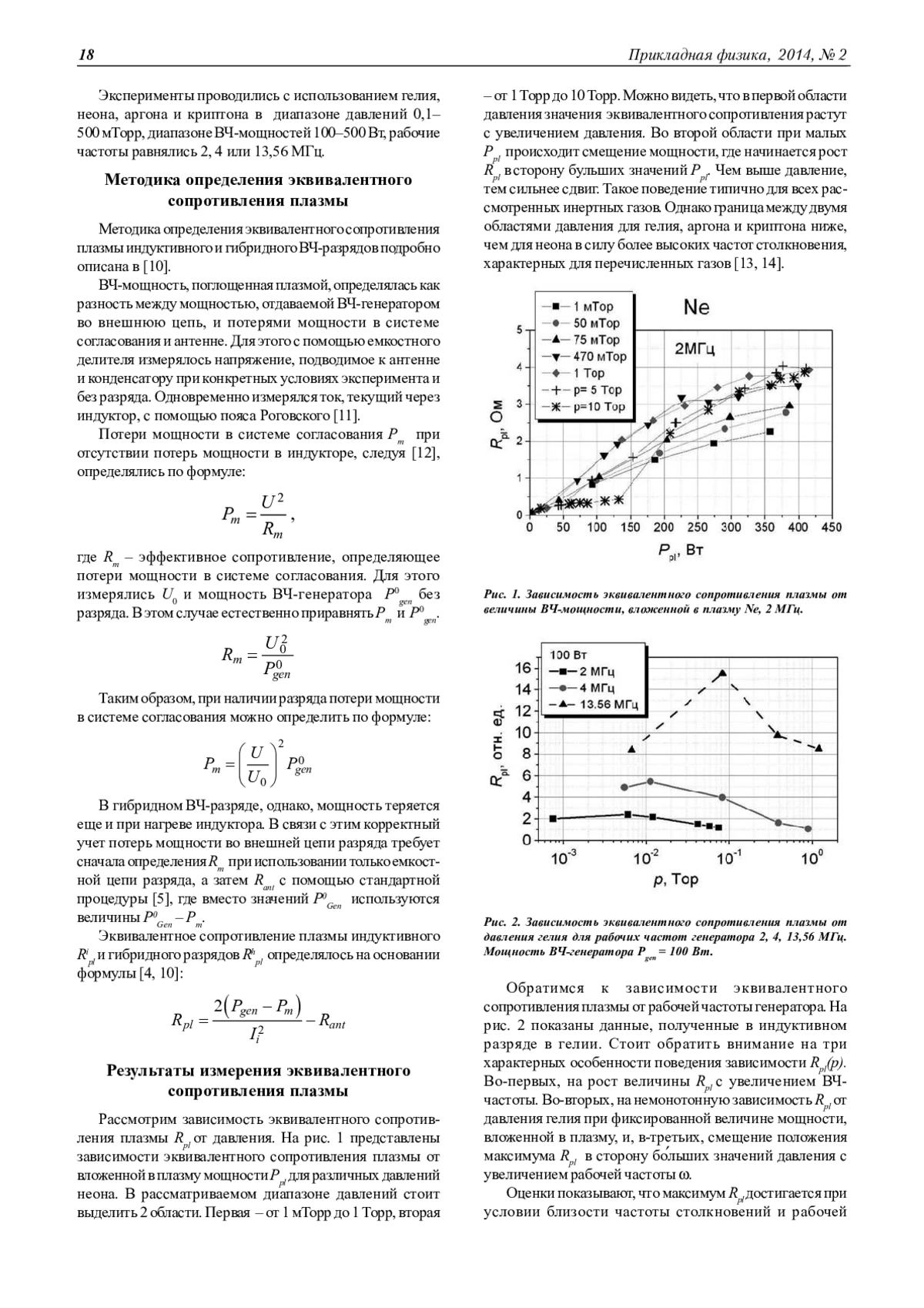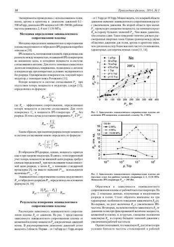 В работе представлены результаты измерения эквивалентного сопротивления плазмы, являющегося мерой способности плазмы поглощать ВЧ-мощность. Рассмотрен индуктивный ВЧ-разряд в инертных газах в диапазоне давлений 1 мТорр - 10 Торр. Показано, что при частотах упругих столкновений, не превышающих 3 ·107 с-1, значения эквивалентного сопротивления различных газов в пределах ошибки эксперимента «ложатся» на одну кривую. При частотах столкновений более 3 ·107 с-1 значительный вклад в поглощение вносит емкостная составляющая разряда.