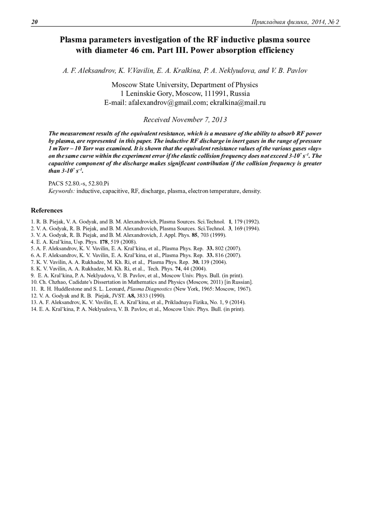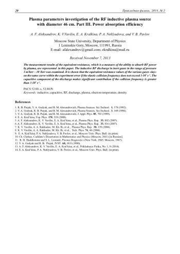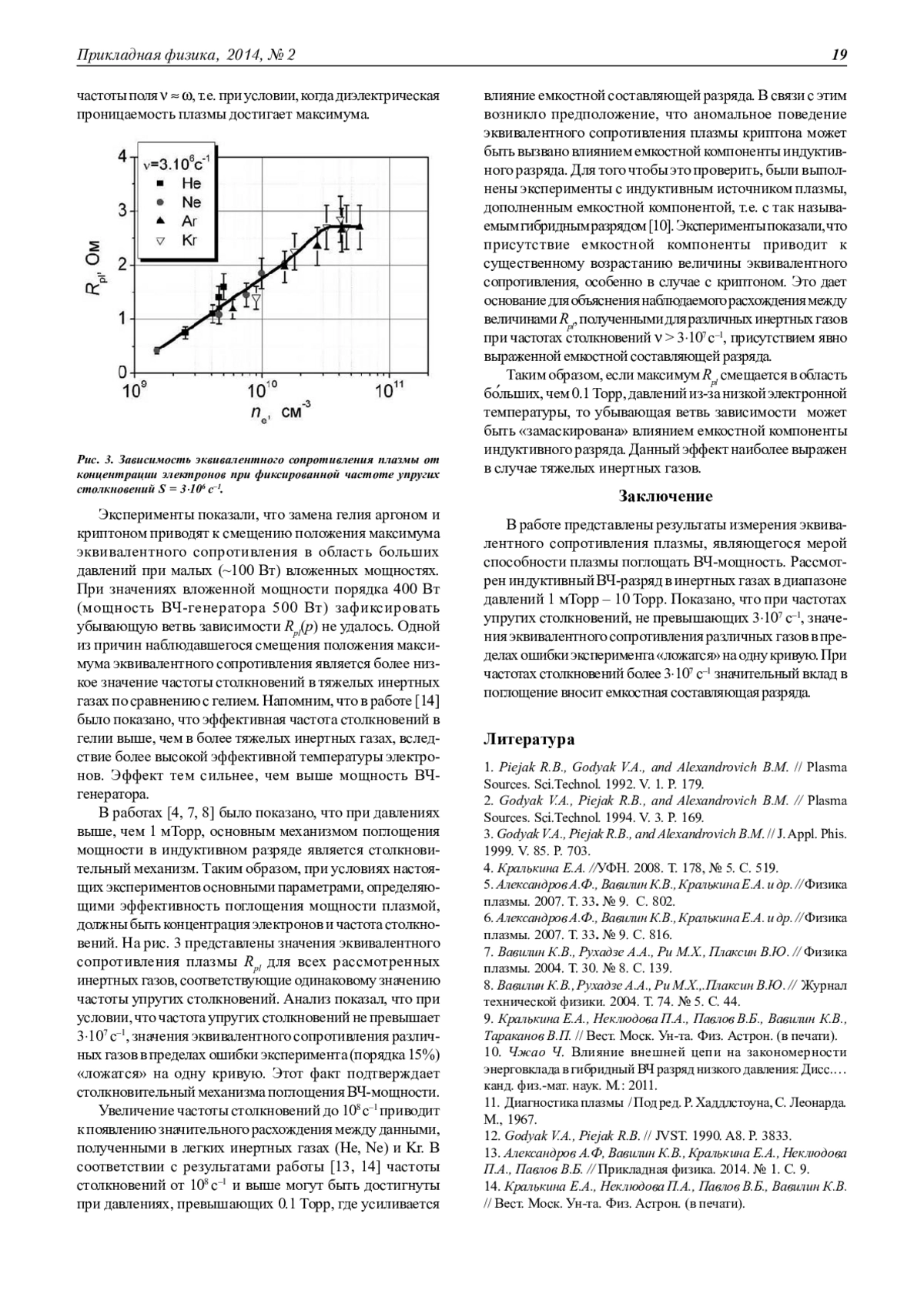 В работе представлены результаты измерения эквивалентного сопротивления плазмы, являющегося мерой способности плазмы поглощать ВЧ-мощность. Рассмотрен индуктивный ВЧ-разряд в инертных газах в диапазоне давлений 1 мТорр - 10 Торр. Показано, что при частотах упругих столкновений, не превышающих 3∙107 с-1, значения эквивалентного сопротивления различных газов в пределах ошибки эксперимента «ложатся» на одну кривую. При частотах столкновений более 3∙107 с-1 значительный вклад в поглощение вносит емкостная составляющая разряда.