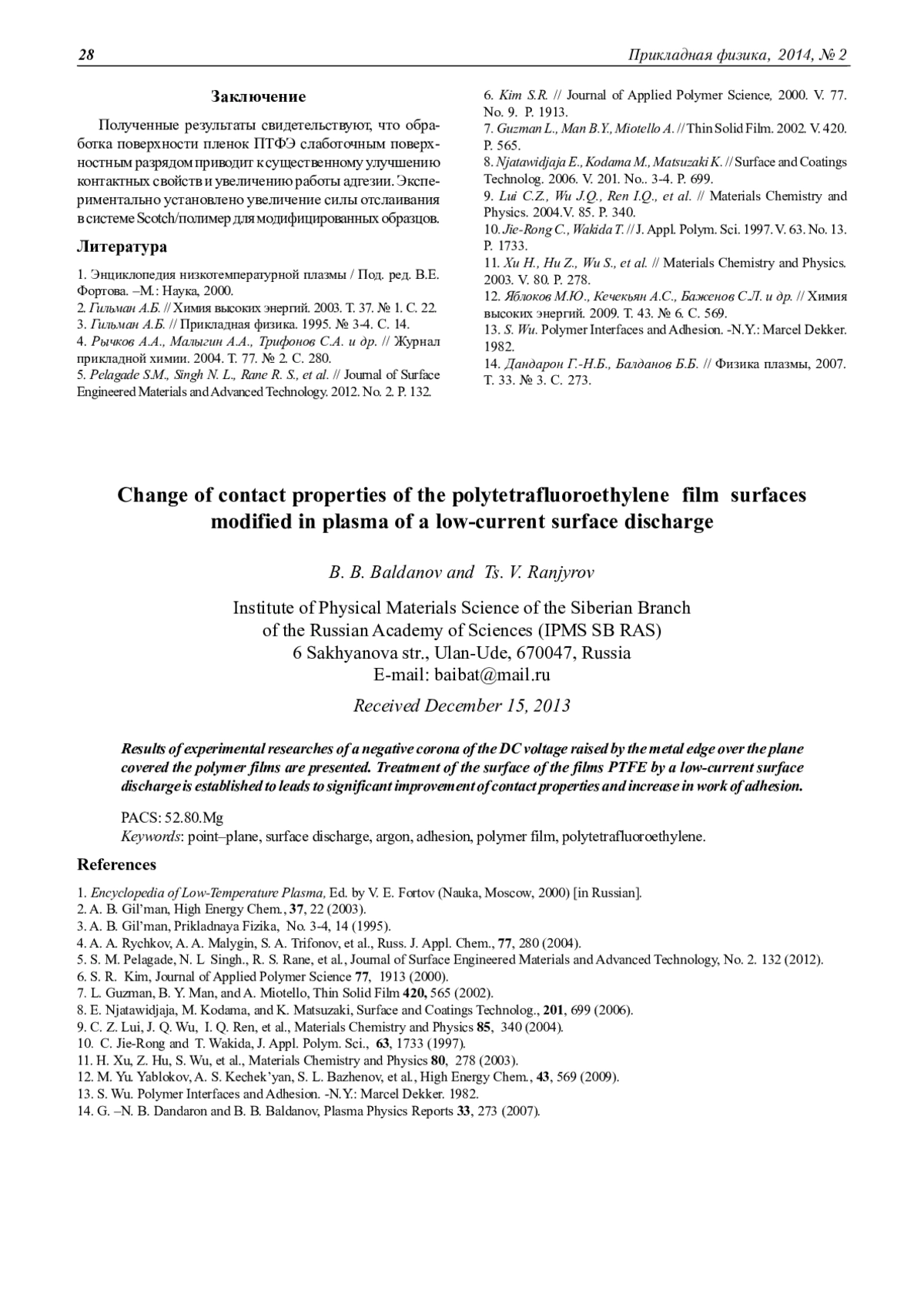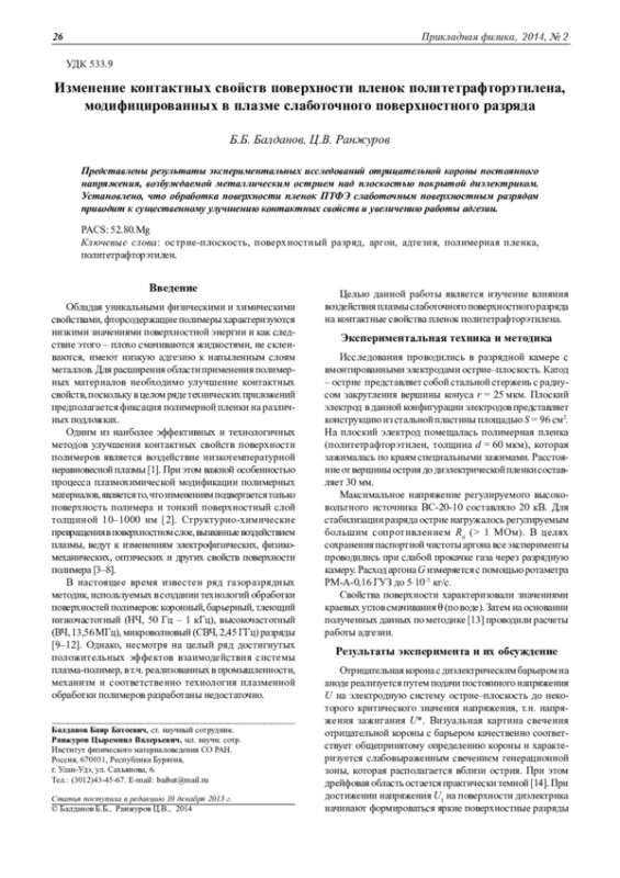 Полученные результаты свидетельствуют, что обработка поверхности пленок ПТФЭ слаботочным поверхностным разрядом приводит к существенному улучшению контактных свойств и увеличению работы адгезии. Экспериментально установлено увеличение силы отслаивания в системе Scotch/полимер для модифицированных образцов.