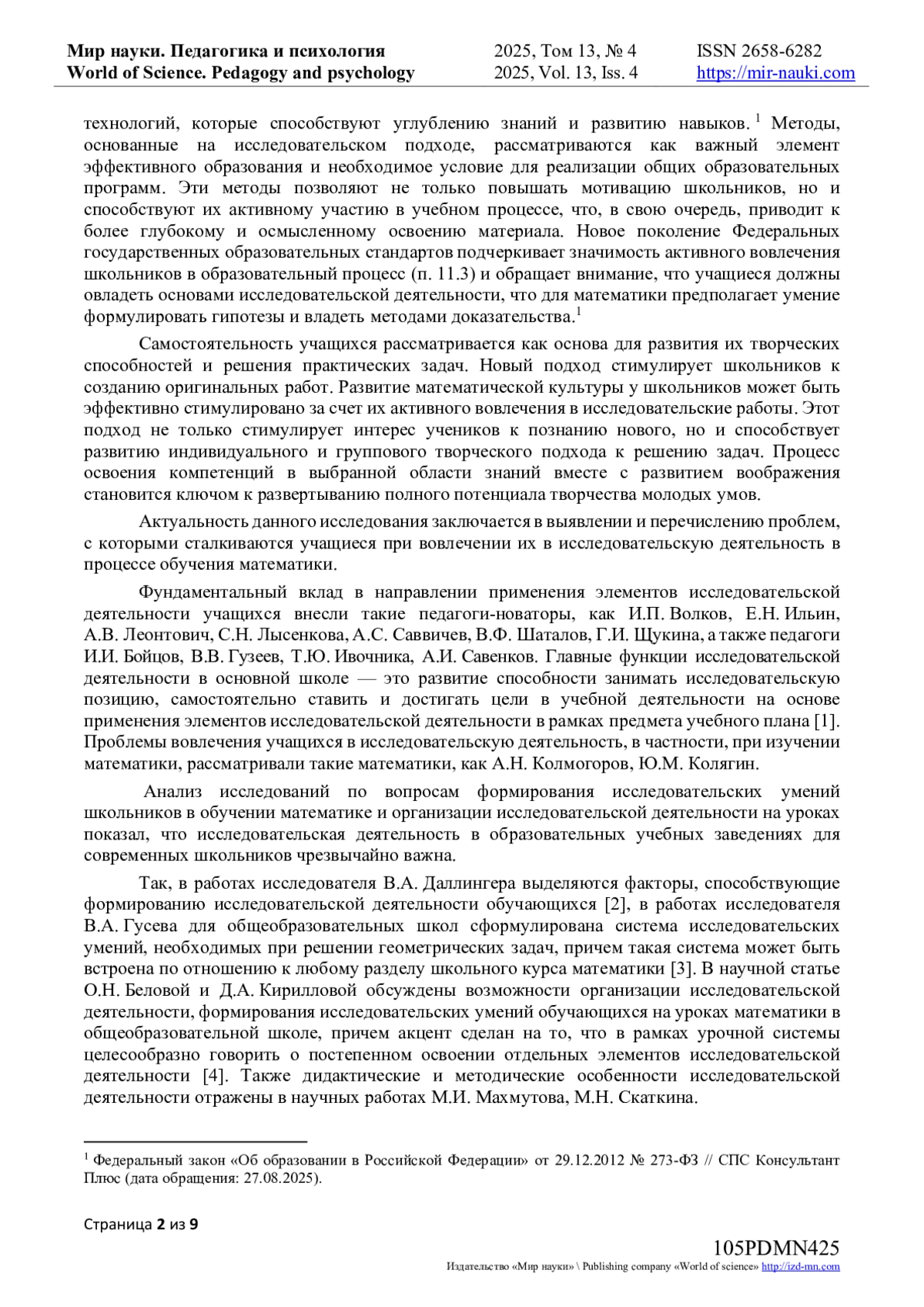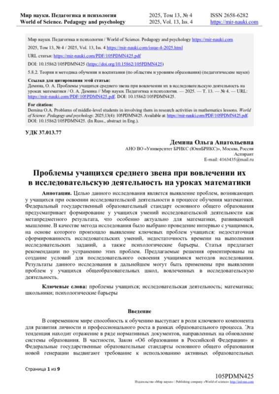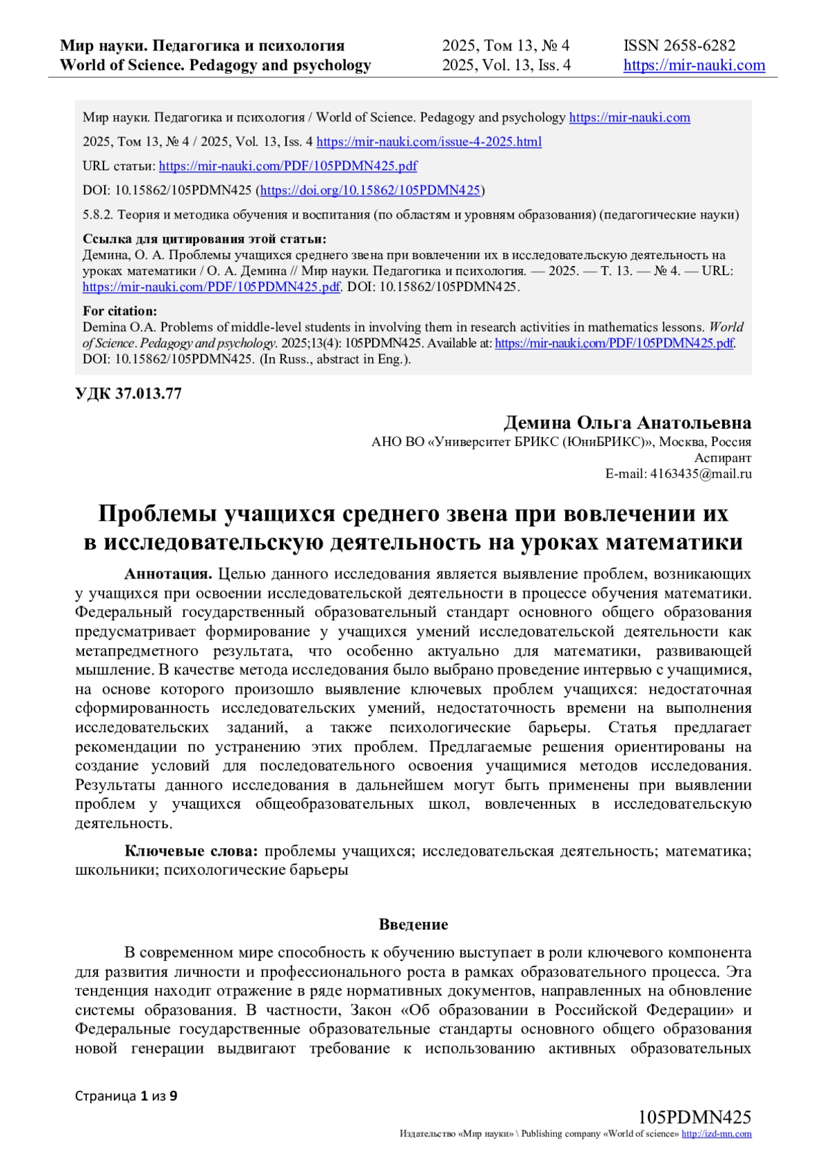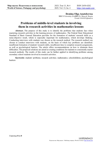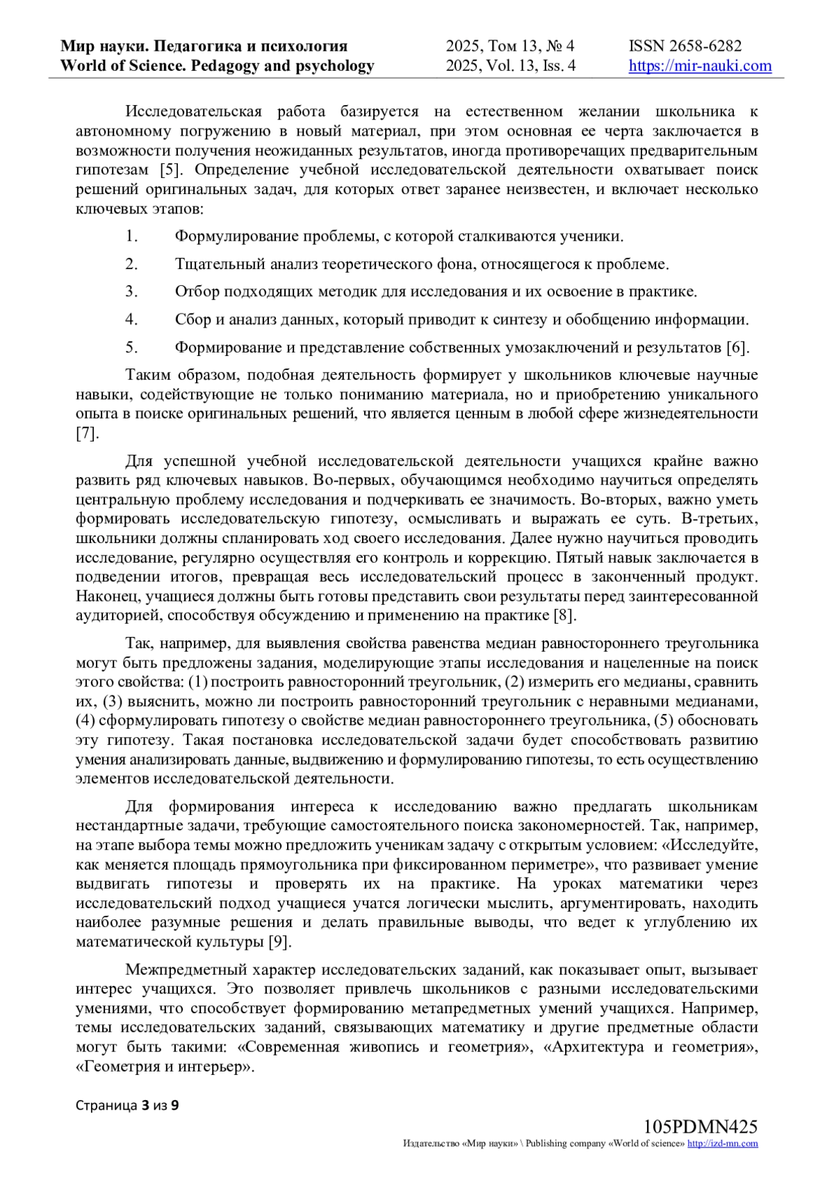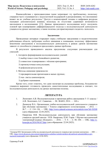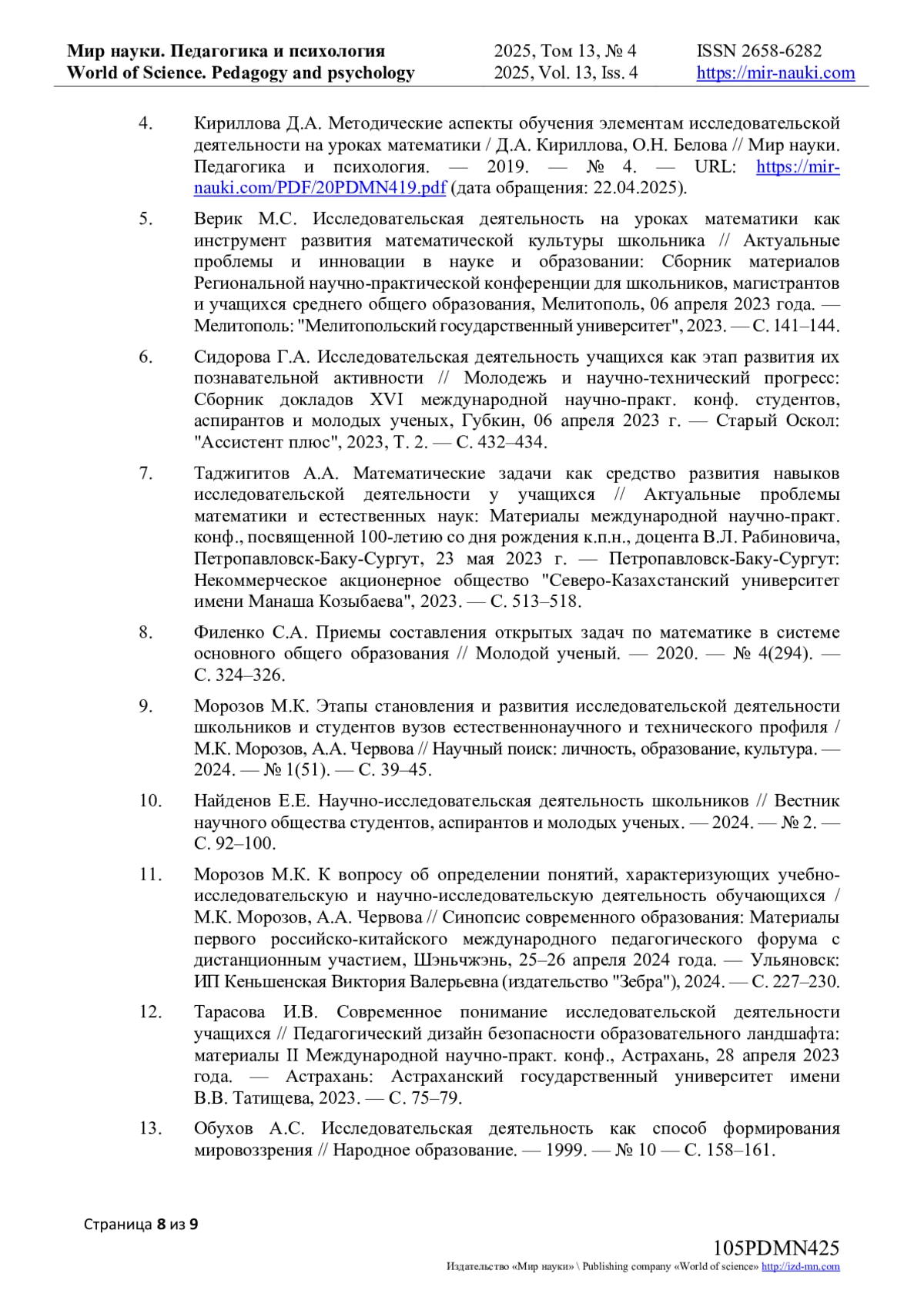 4. Кириллова Д.А. Методические аспекты обучения элементам исследовательской деятельности на уроках математики / Д.А. Кириллова, О.Н. Белова // Мир науки. Педагогика и психология. - 2019. - № 4. - URL: https://mir-nauki.com/PDF/20PDMN419.pdf (дата обращения: 22.04.2025).
