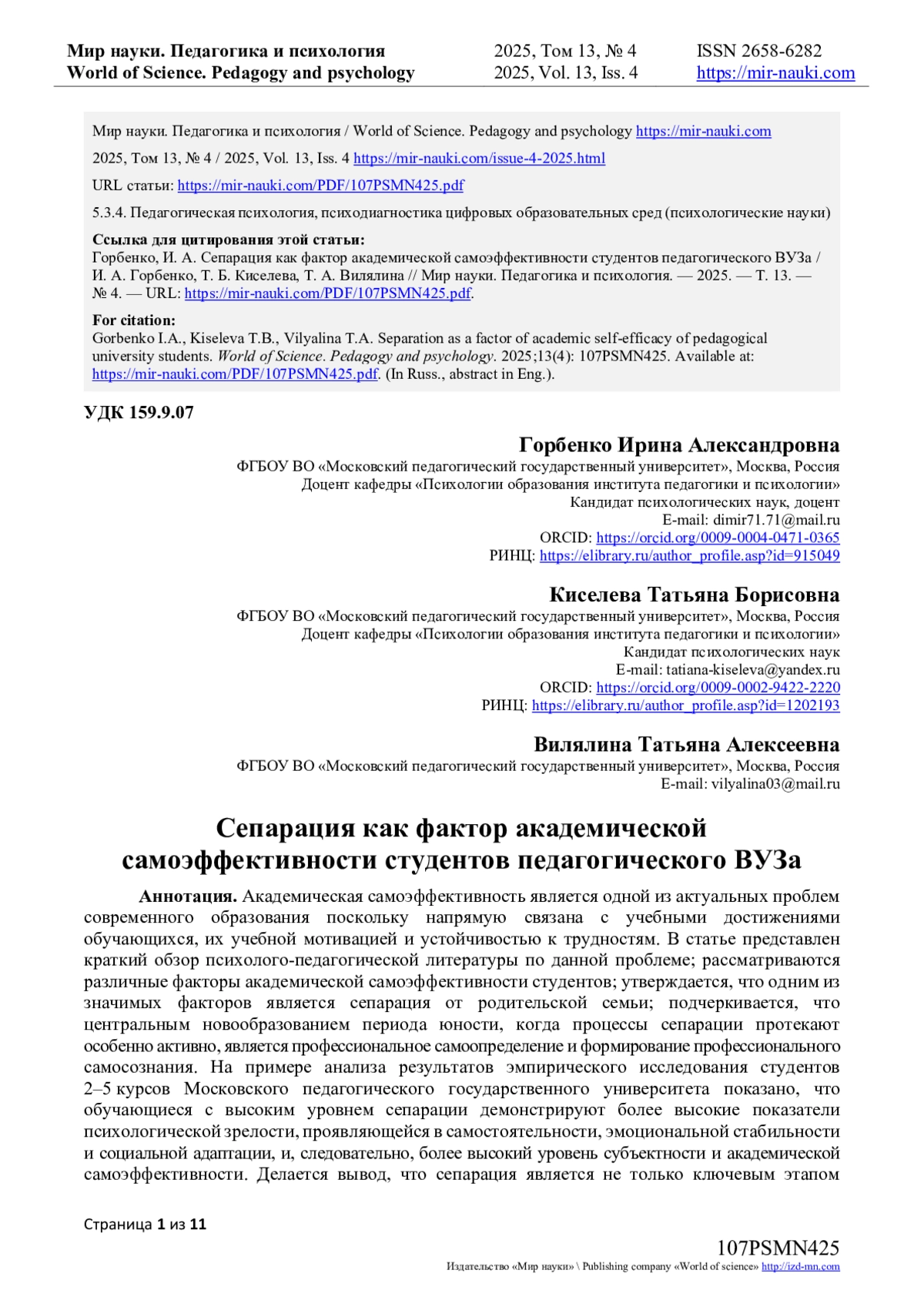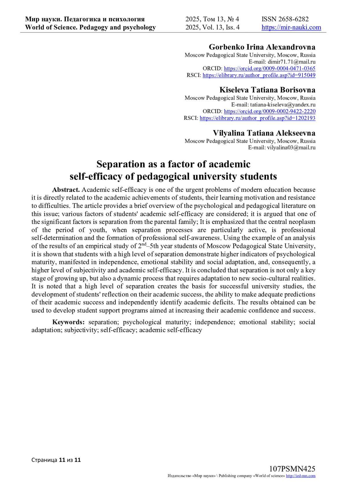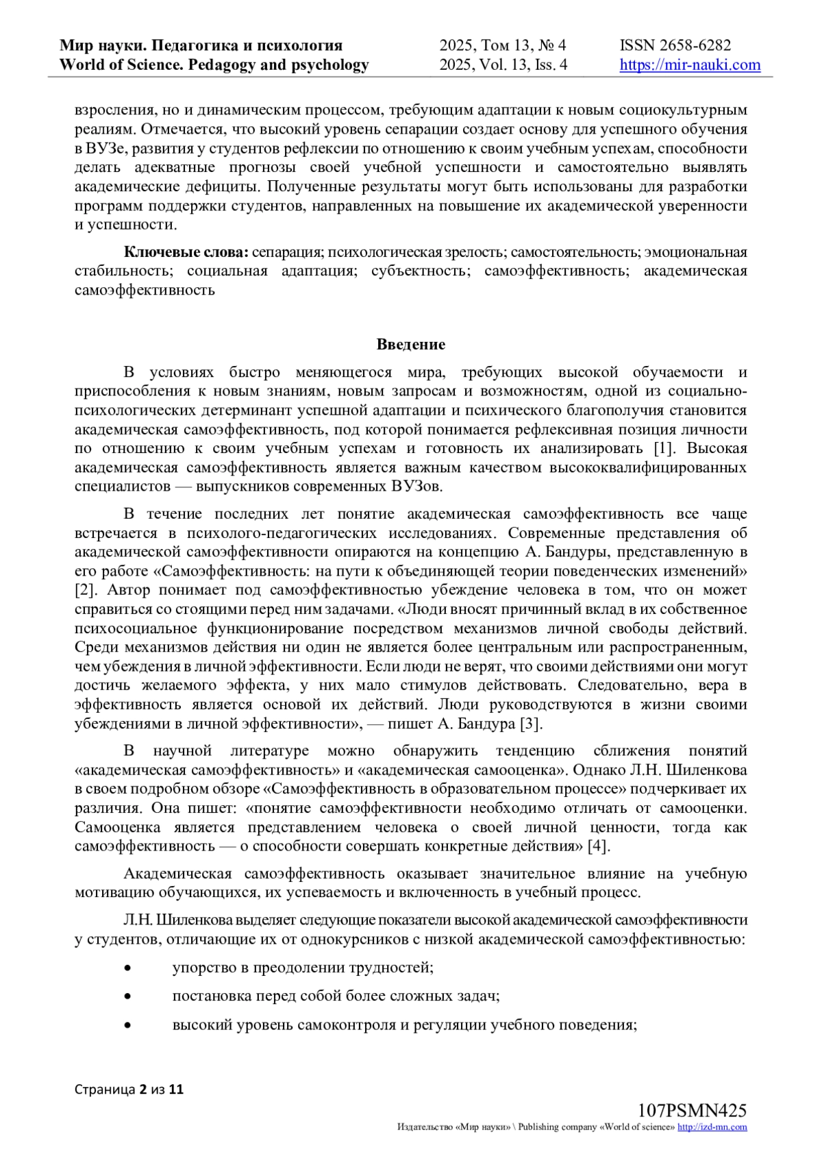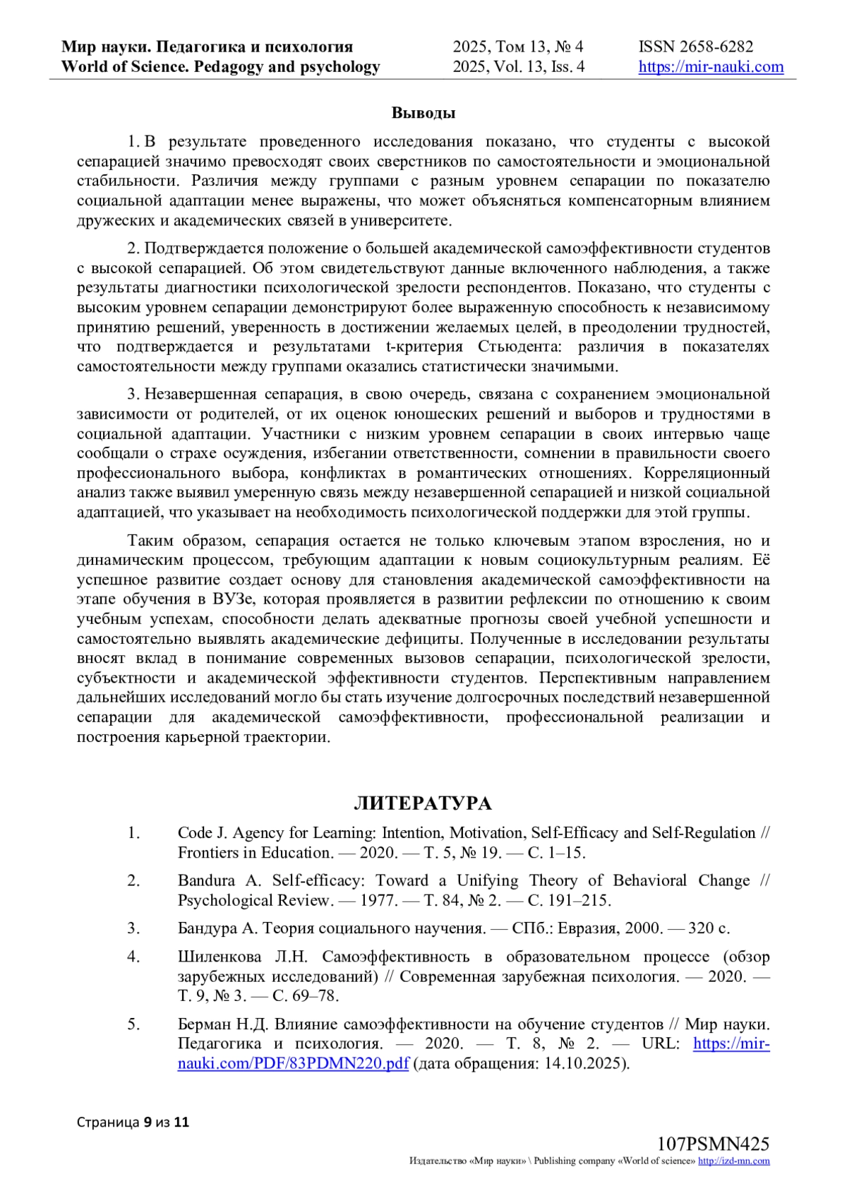 Делается вывод, что сепарация является не только ключевым этапом взросления, но и динамическим процессом, требующим адаптации к новым социокультурным реалиям. Отмечается, что высокий уровень сепарации создает основу для успешного обучения в ВУЗе, развития у студентов рефлексии по отношению к своим учебным успехам, способности делать адекватные прогнозы своей учебной успешности и самостоятельно выявлять академические дефициты. Полученные результаты могут быть использованы для разработки программ поддержки студентов, направленных на повышение их академической уверенности и успешности.