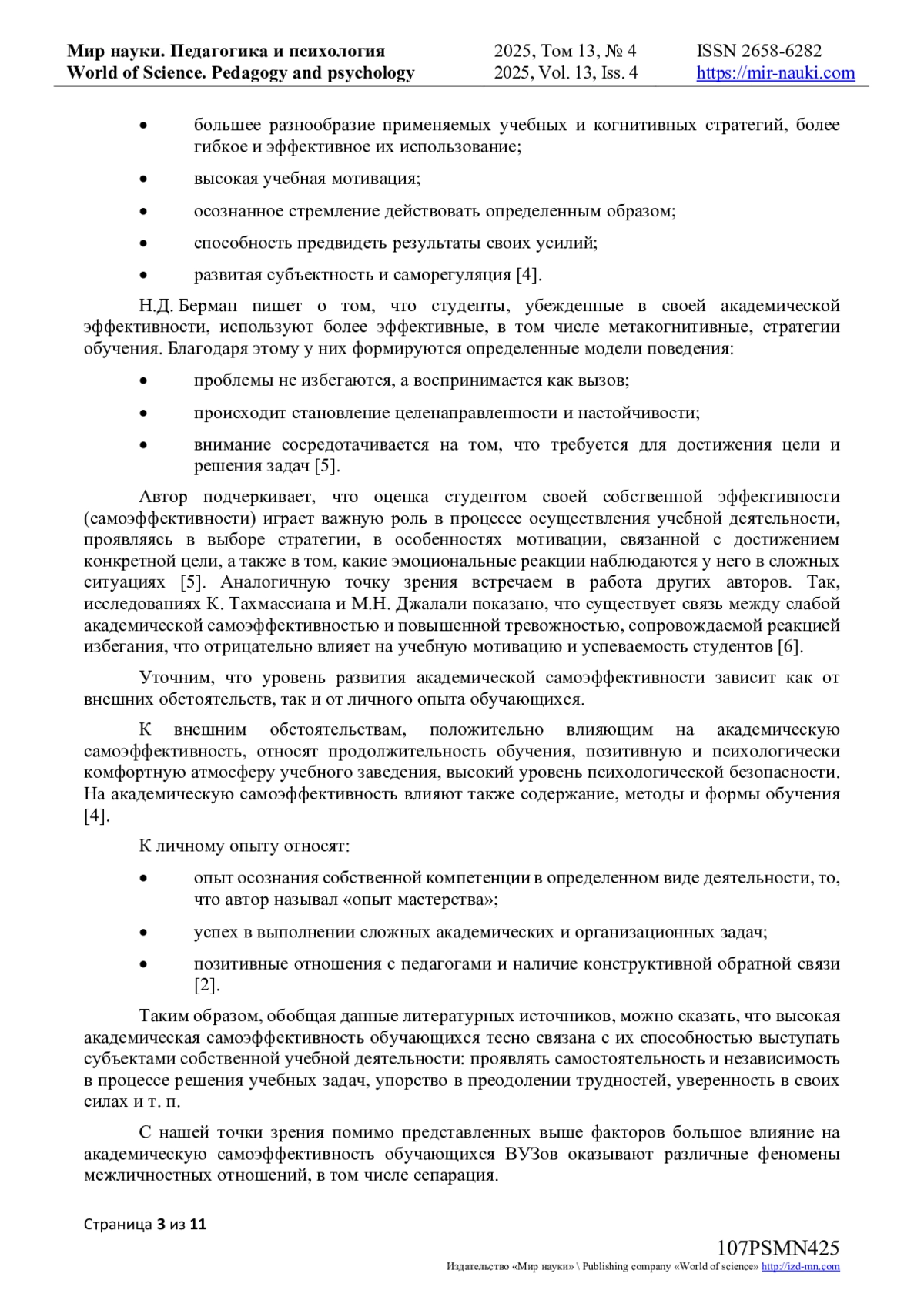5. Берман Н.Д. Влияние самоэффективности на обучение студентов // Мир науки. Педагогика и психология. - 2020. - Т. 8, № 2. - URL: https://mir-nauki.com/PDF/83PDMN220.pdf (дата обращения: 14.10.2025). EDN: LUXXOU