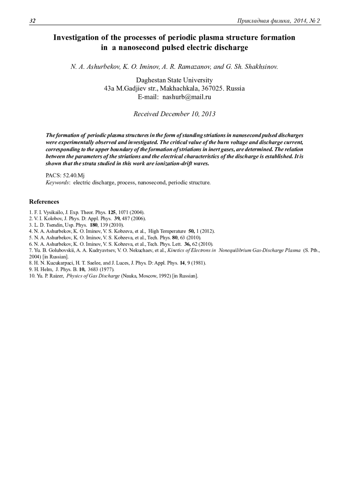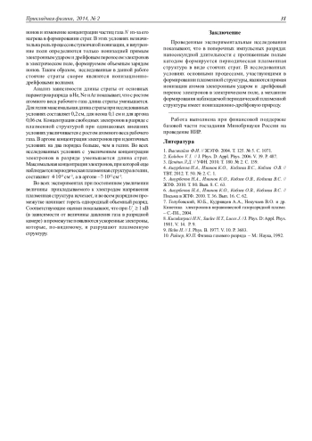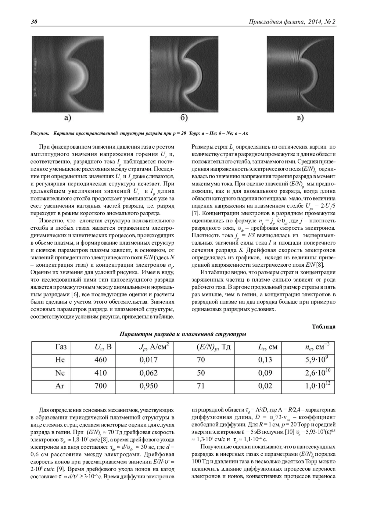 Проведенные экспериментальные исследования показывают, что в поперечных импульсных разрядах наносекундной длительности с протяженным полым катодом формируется периодическая плазменная структура в виде стоячих страт. В исследованных условиях основными процессами, участвующими в формировании плазменной структуры, являются прямая ионизация атомов электронным ударом и дрейфовый перенос электронов в электрическом поле, а механизм формирования наблюдаемой периодической плазменной структуры имеет ионизационно-дрейфовую природу.