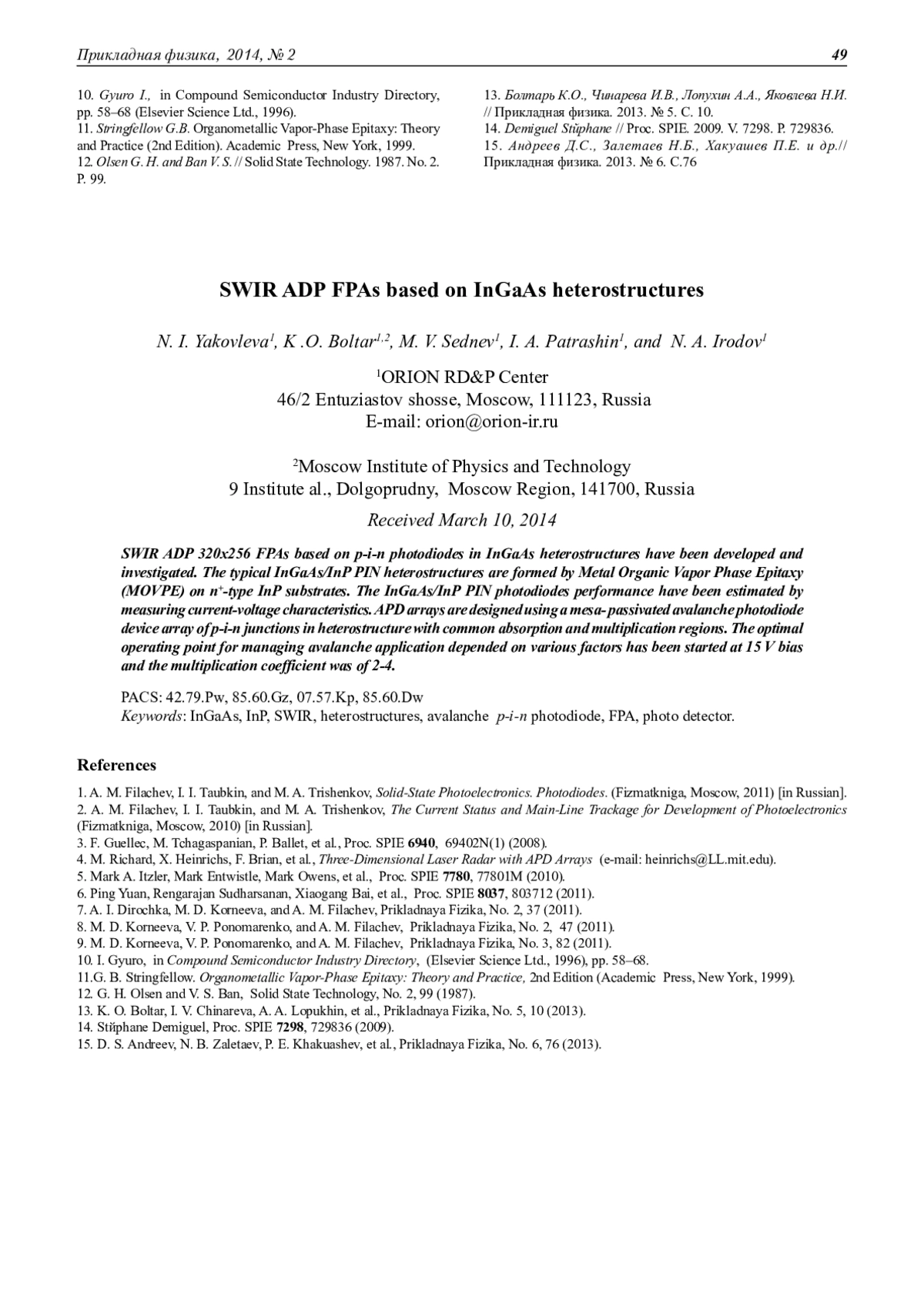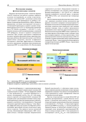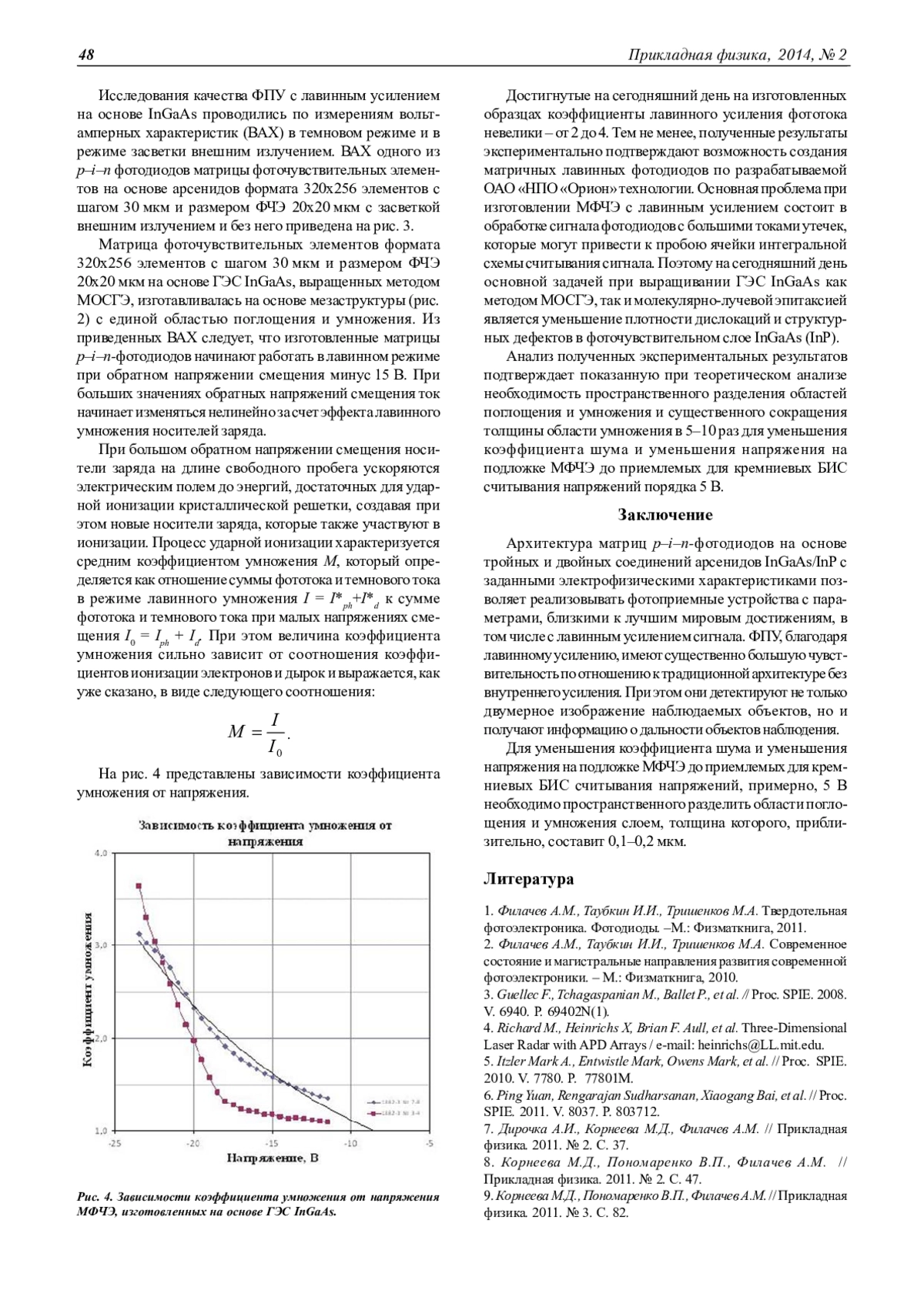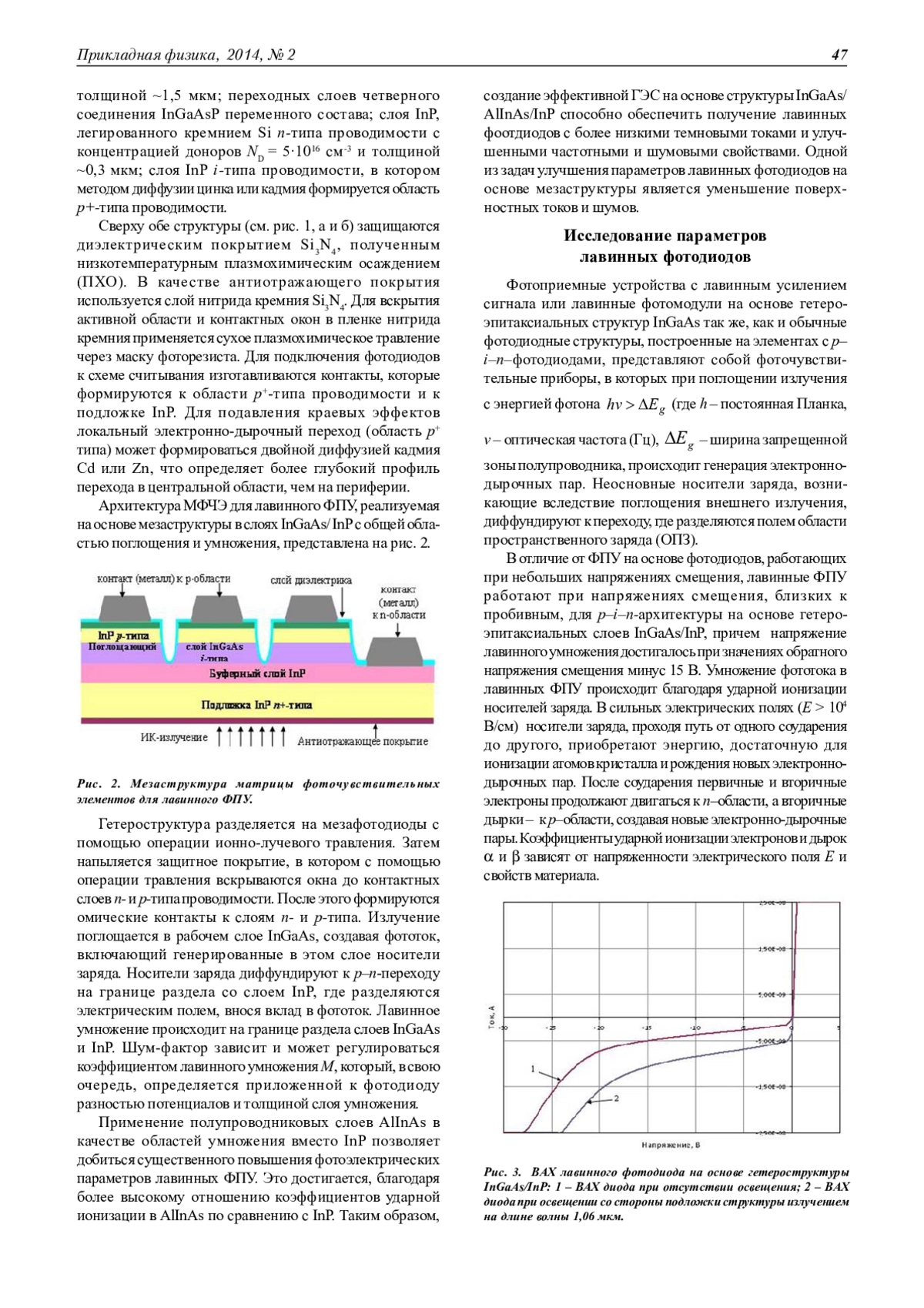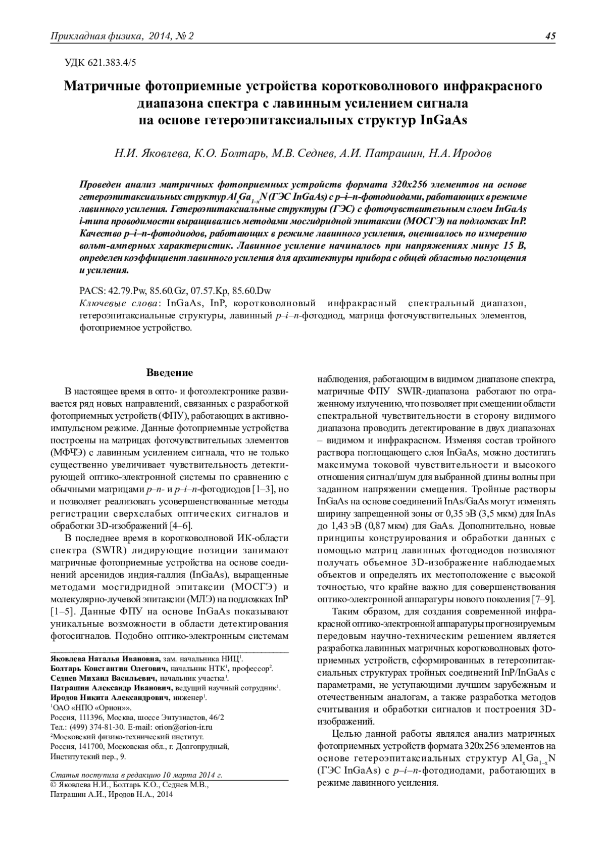 Проведен анализ матричных фотоприемных устройств формата 320х256 элементов на основе гетероэпитаксиальных структур AlxGa1-xN (ГЭС InGaAs) с p─i─n-фотодиодами, работающих в режиме лавинного усиления. Гетероэпитаксиальные структуры (ГЭС) с фоточувствительным слоем InGaAs i-типа проводимости выращивались методами мосгидридной эпитаксии (МОСГЭ) на подложках InP. Качество p─i─n-фотодиодов, работающих в режиме лавинного усиления, оценивалось по измерению вольт-амперных характеристик. Лавинное усиление начиналось при напряжениях минус 15 В, определен коэффициент лавинного усиления для архитектуры прибора с общей областью поглощения и усиления.