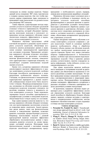 2. Wang F., Wua S., Zhanga W. Multiple nonlinear features fusion based driving fatigue detection. Biomedical Signal Processing and Control. 2020. Vol. 62. N 3. P. 67-78. EDN: PTSOMH