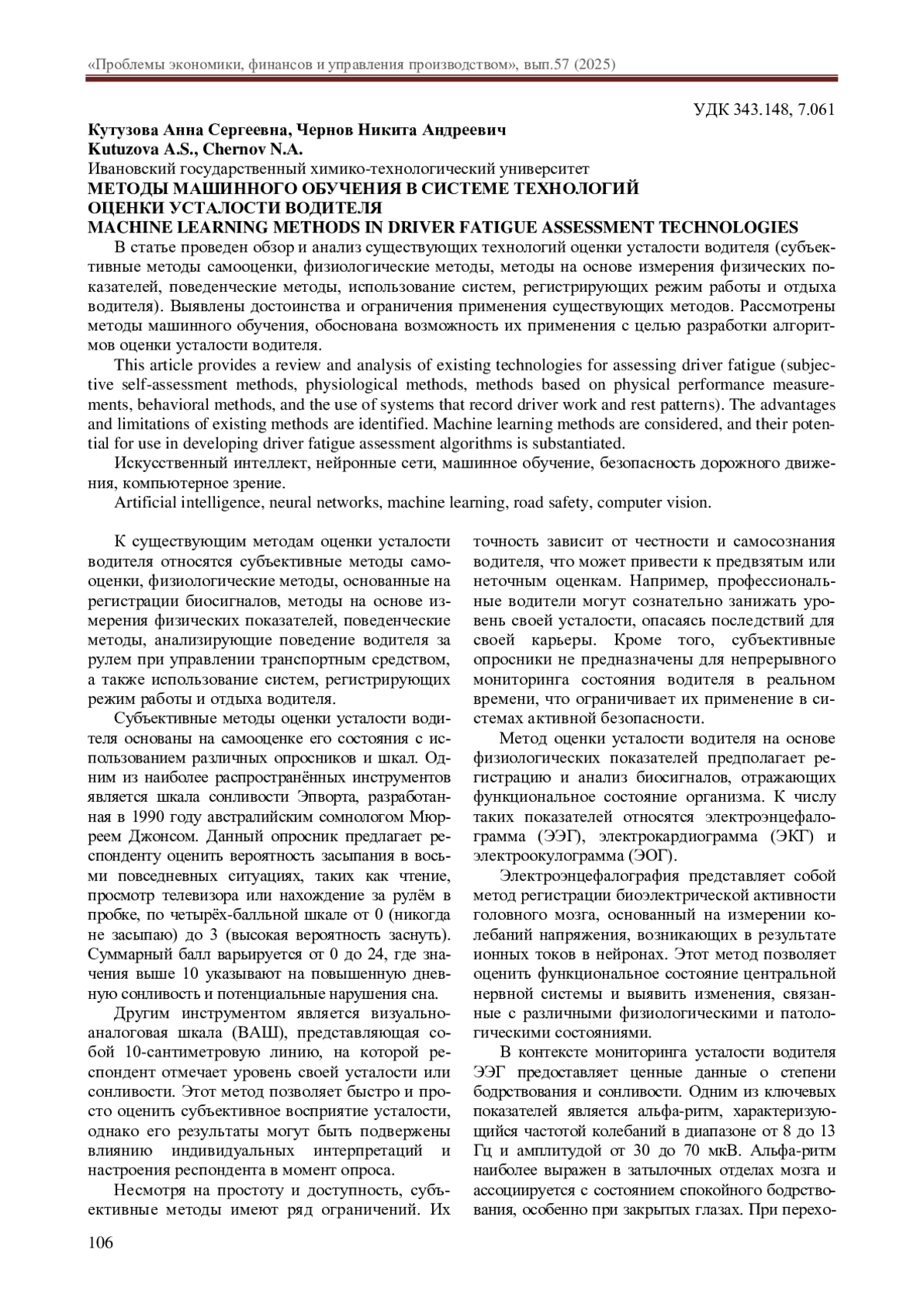 В статье проведен обзор и анализ существующих технологий оценки усталости водителя (субъективные методы самооценки, физиологические методы, методы на основе измерения физических показателей, поведенческие методы, использование систем, регистрирующих режим работы и отдыха водителя). Выявлены достоинства и ограничения применения существующих методов. Рассмотрены методы машинного обучения, обоснована возможность их применения с целью разработки алгоритмов оценки усталости водителя.