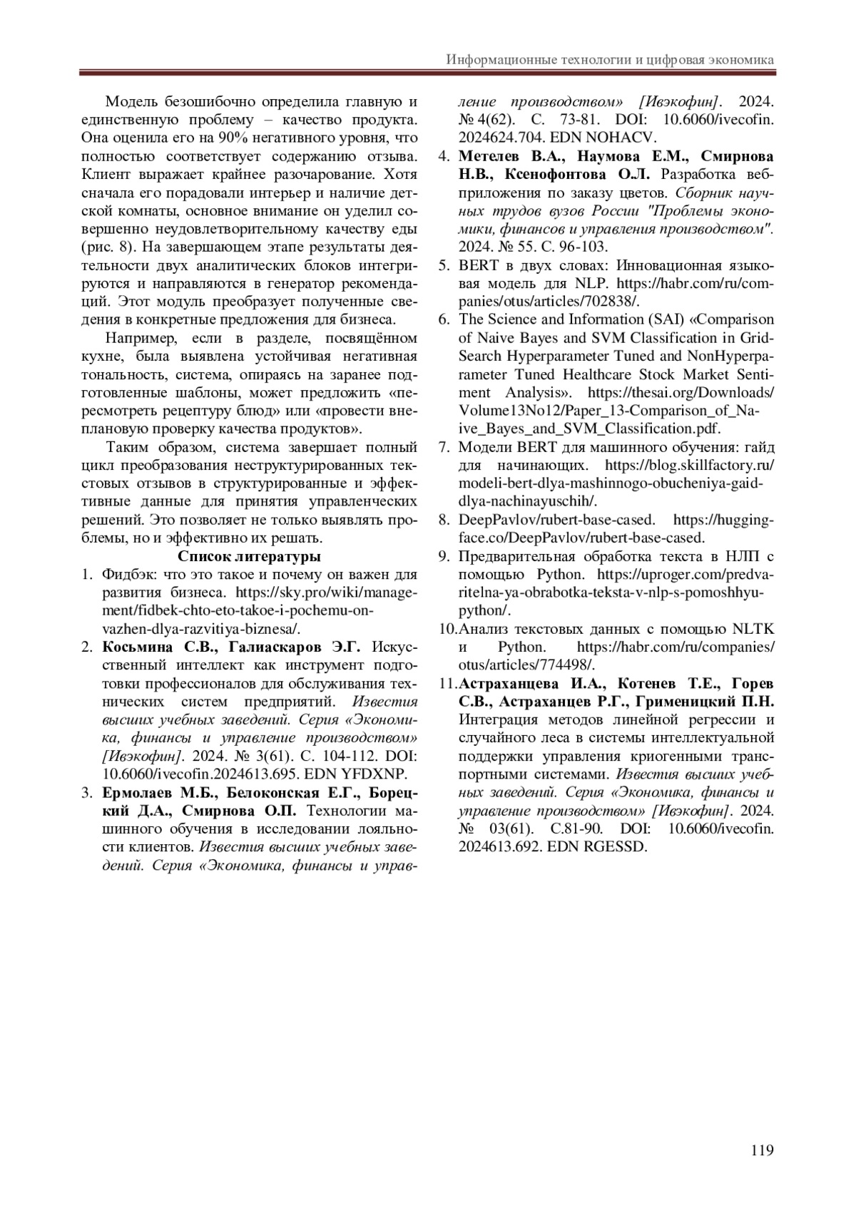 3. Ермолаев М.Б., Белоконская Е.Г., Борецкий Д.А., Смирнова О.П. Технологии машинного обучения в исследовании лояльности клиентов. Известия высших учебных заведений. Серия “Экономика, финансы и управление производством” [Ивэкофин]. 2024. № 4(62). С. 73-81. DOI: 10.6060/ivecofin.2024624.704 EDN: NOHACV