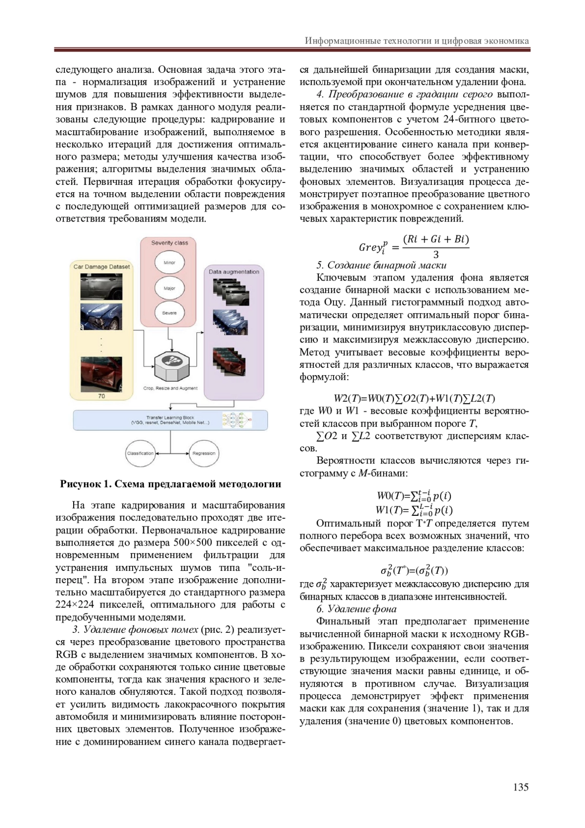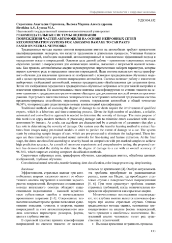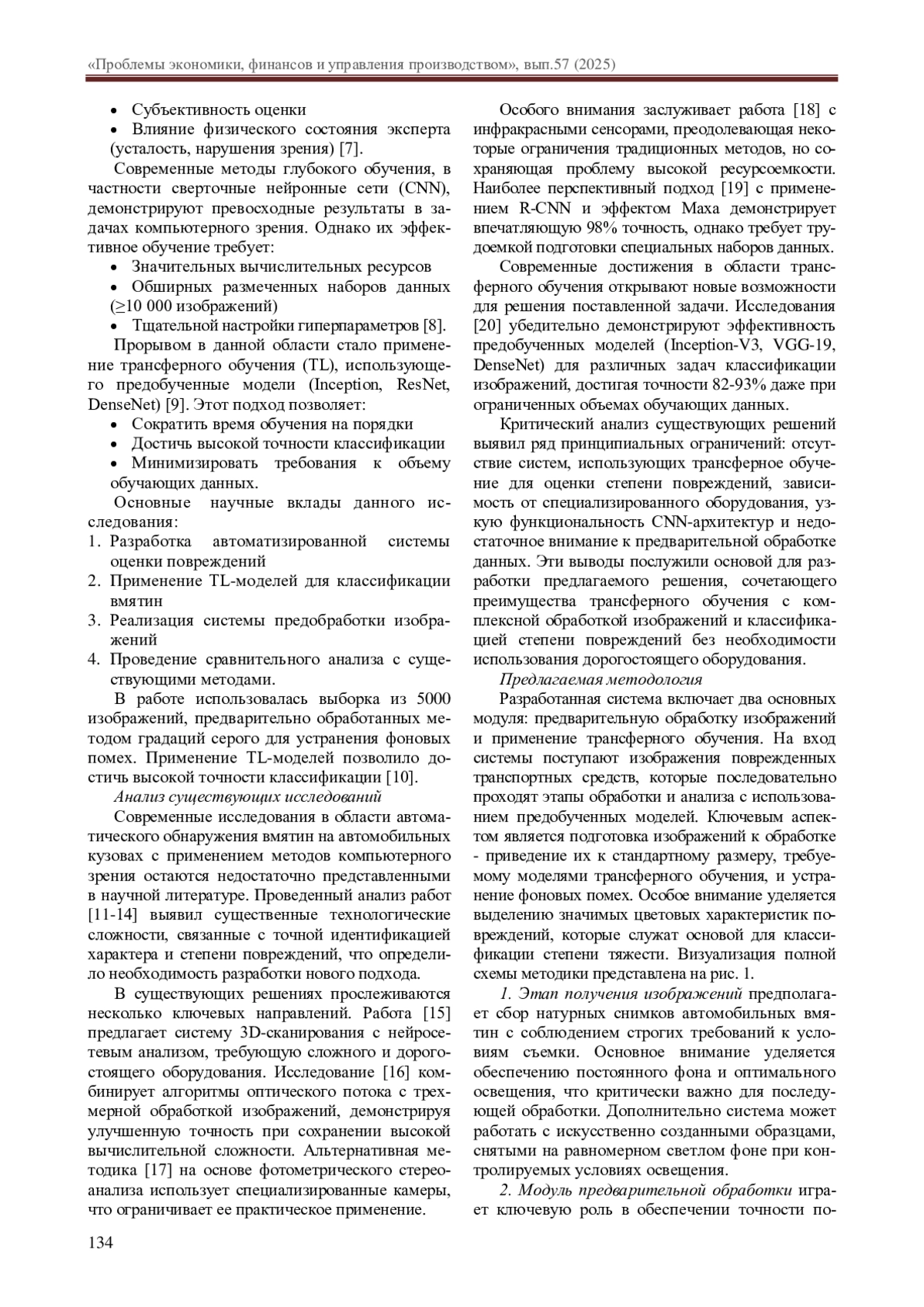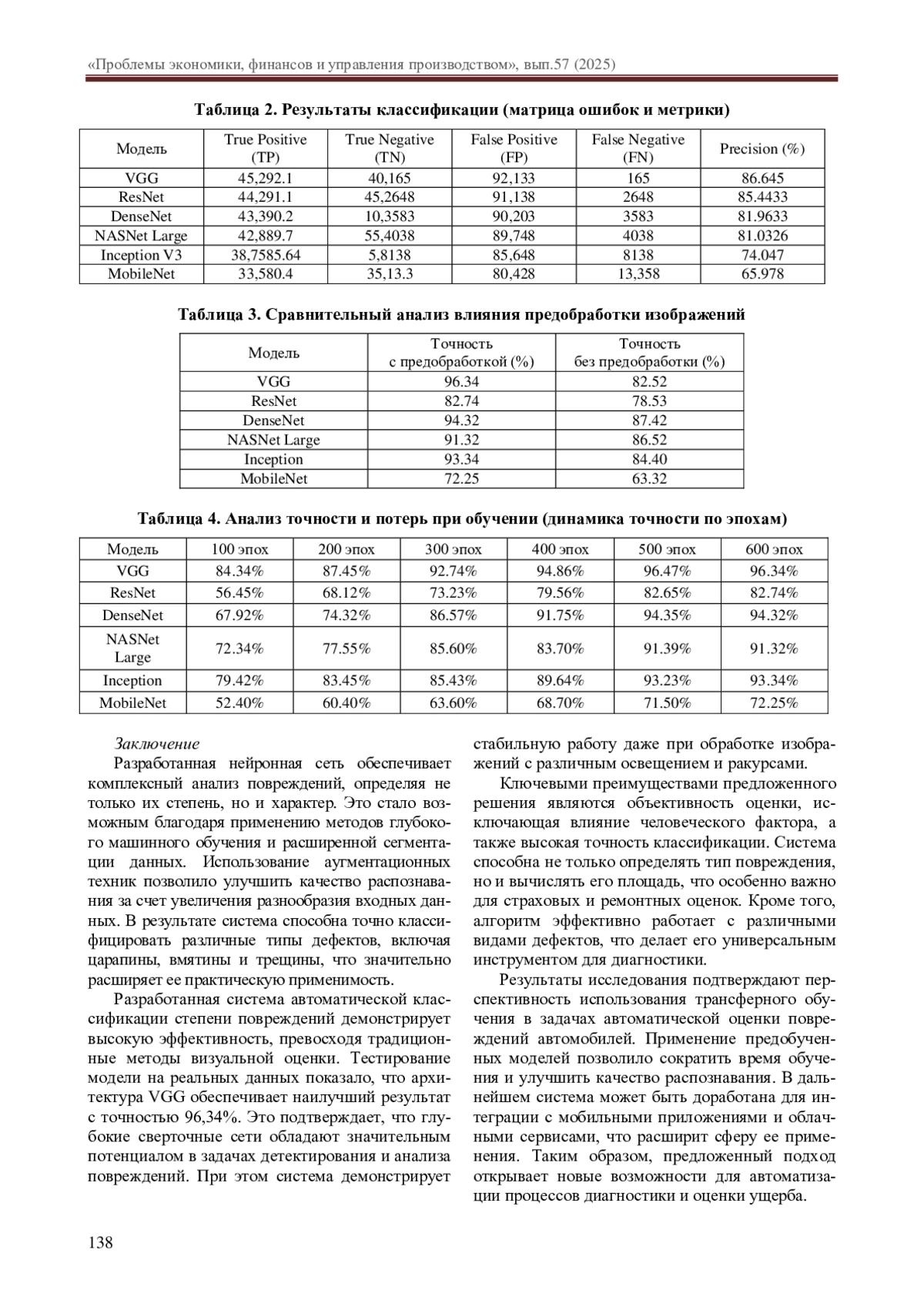Традиционные методы оценки степени повреждения вмятин на автомобилях требуют привлечения квалифицированных экспертов, что является трудоемким и длительным процессом. Учитывая большое количество аварий, необходим надежный, автоматизированный и экономически эффективный подход к определению тяжести повреждений. Основная цель данной работы - применение современных методов обработки данных о повреждениях для минимизации ошибок, связанных с визуальной оценкой человеком. Как правило, автомобильные аварии характеризуются определенным набором параметров, которые играют ключевую роль в определении тяжести повреждений. Наша система использует метод трансферного обучения для извлечения признаков из изображений с помощью предварительно обученных моделей с целью прогнозирования степени повреждения автомобиля. Система начинает работу с извлечения выборочных изображений автомобилей, которые предварительно обрабатываются для устранения фона. Затем эти изображения передаются в предварительно обученные нейронные сети для тонкой настройки и извлечения признаков. На заключительном этапе вмятины классифицируются по степени тяжести на основе сравнения с предварительно размеченными образцами для достижения высокой точности прогнозирования. В результате многочисленных экспериментов и всесторонних испытаний предложенная система продемонстрировала способность определять степень повреждения автомобиля с общей точностью 96,34%, что превосходит существующие методы компьютерной классификации.