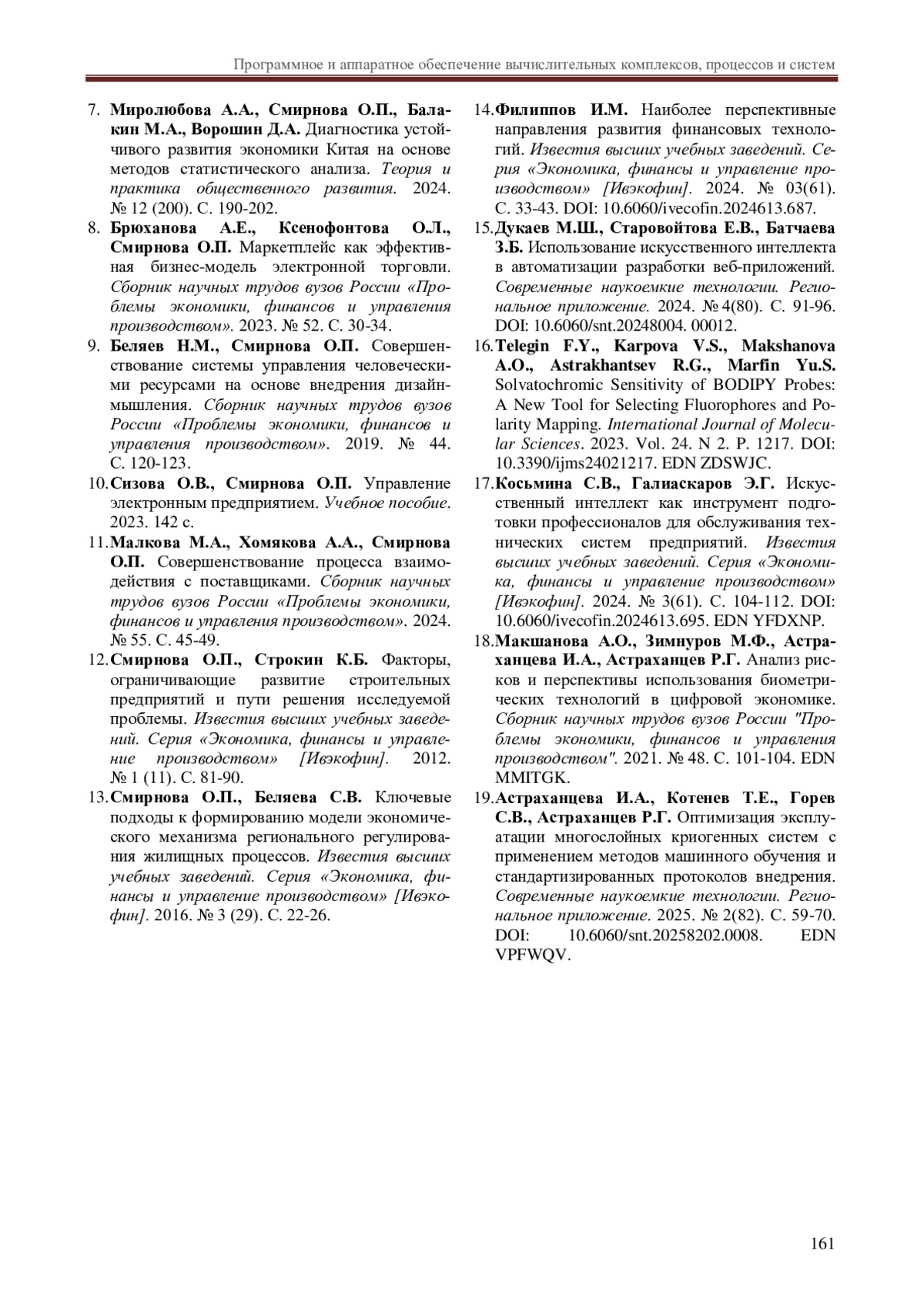 6. Бабина О.И. Механизм организации системы стратегического планирования на мезоуровне с использованием технологии имитационного моделирования. Известия высших учебных заведений. Серия “Экономика, финансы и управление производством” [Ивэкофин]. 2023. № 02(56). С. 45-52. DOI: 10.6060/ivecofin.2023562.642 EDN: QQLEPZ
