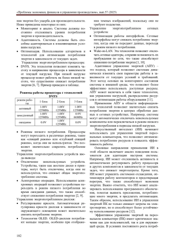 Адаптивное управление энергией (АПУ) – это подход, который позволяет системам динамически изменять свои параметры работы в зависимости от текущих условий и требований. Этот метод основан на мониторинге состояния системы и внешней среды, что позволяет более эффективно использовать доступные ресурсы. АПУ может включать в себя такие технологии, как управление нагрузкой, распределение ресурсов и оптимизация работы оборудования [11]. Применение АПУ в области информационных технологий позволяет значительно снизить потребление энергии в центрах обработки данных и сетевых устройствах. Например, системы могут автоматически отключать неиспользуемые компоненты или переключаться в режим низкого энергопотребления в периоды низкой нагрузки.