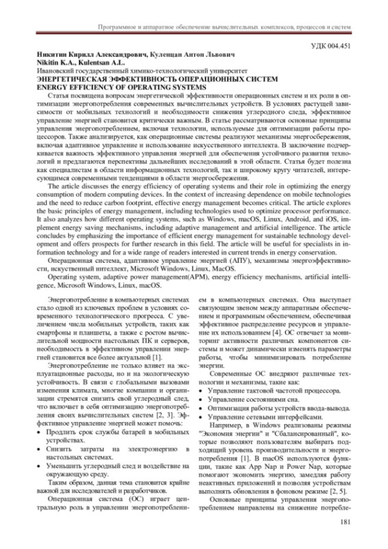 Статья посвящена вопросам энергетической эффективности операционных систем и их роли в оптимизации энергопотребления современных вычислительных устройств. В условиях растущей зависимости от мобильных технологий и необходимости снижения углеродного следа, эффективное управление энергией становится критически важным. В статье рассматриваются основные принципы управления энергопотреблением, включая технологии, используемые для оптимизации работы процессоров. Также анализируется, как операционные системы реализуют механизмы энергосбережения, включая адаптивное управление и использование искусственного интеллекта. В заключение подчеркивается важность эффективного управления энергией для обеспечения устойчивого развития технологий и предлагаются перспективы дальнейших исследований в этой области. Статья будет полезна как специалистам в области информационных технологий, так и широкому кругу читателей, интересующимся современными тенденциями в области энергосбережения.