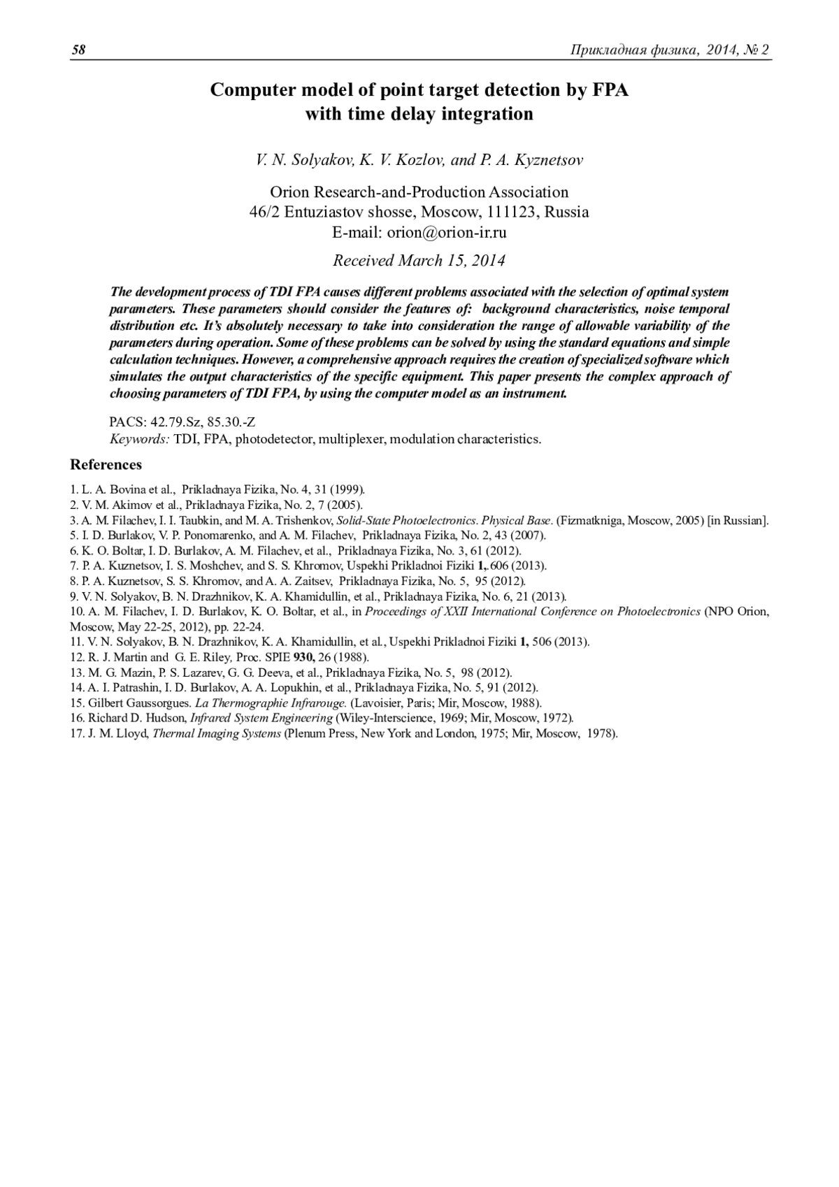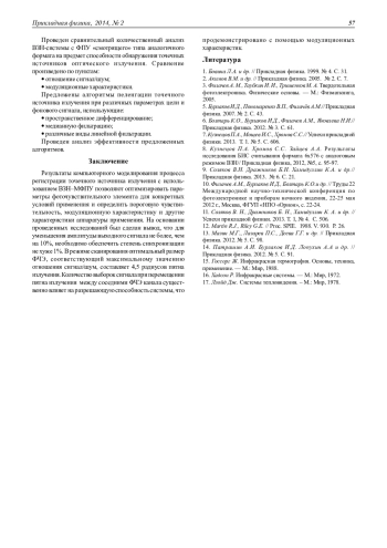 В данной работе предложен подход к решению проблемы выбора оптимальных параметров многорядного фотоприемного устройства (ФПУ) с режимом временной задержки и накопления (ВЗН), предназначенного для регистрации точечных источников оптического излучения в ИК-диапазоне. Суть данного подхода заключается в построении модели рассматриваемого ФПУ с учетом необходимого набора данных, таких как: распределение интенсивности фонового излучения по матрице фоточувствительных элементов (ФЧЭ), параметры источника сигнала, предполагаемая структура ФПУ и т. д. На основании имеющейся информации производится расчет таких параметров ФПУ, как: оптимальный размер ФЧЭ в направлении сканирования и в направлении, перпендикулярном сканированию, допустимое рассогласование частоты опроса и скорости сканирования, необходимая стабильность скорости сканирования и т. д. После получения оптимальных параметров системы, производится расчет модуляционных характеристик матрицы ФЧЭ, осуществляется оценка разрешающей способности и т. д. В работе рассматриваются алгоритмы пеленгации точечных источников излучения многорядными ФПУ с ВЗН.