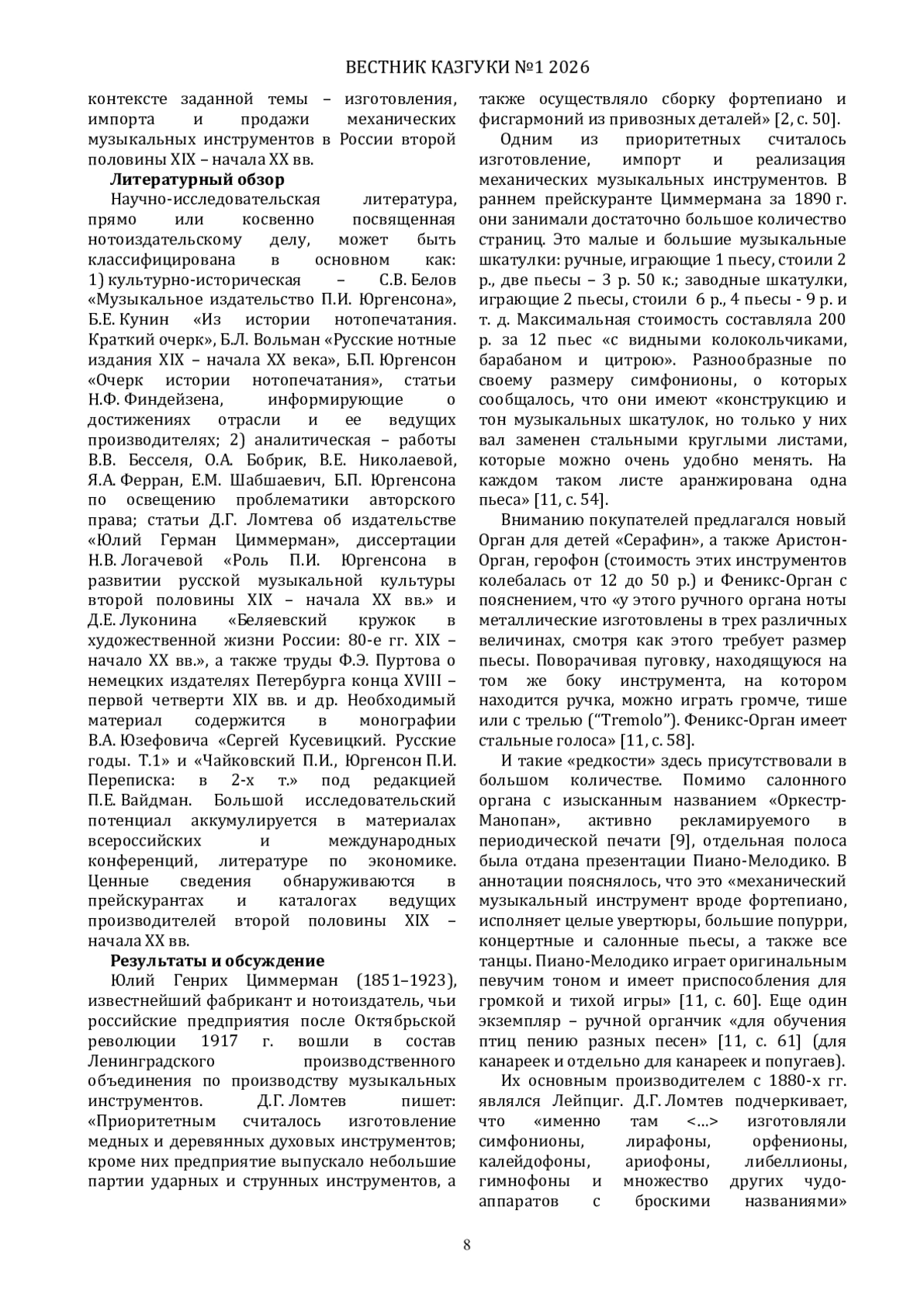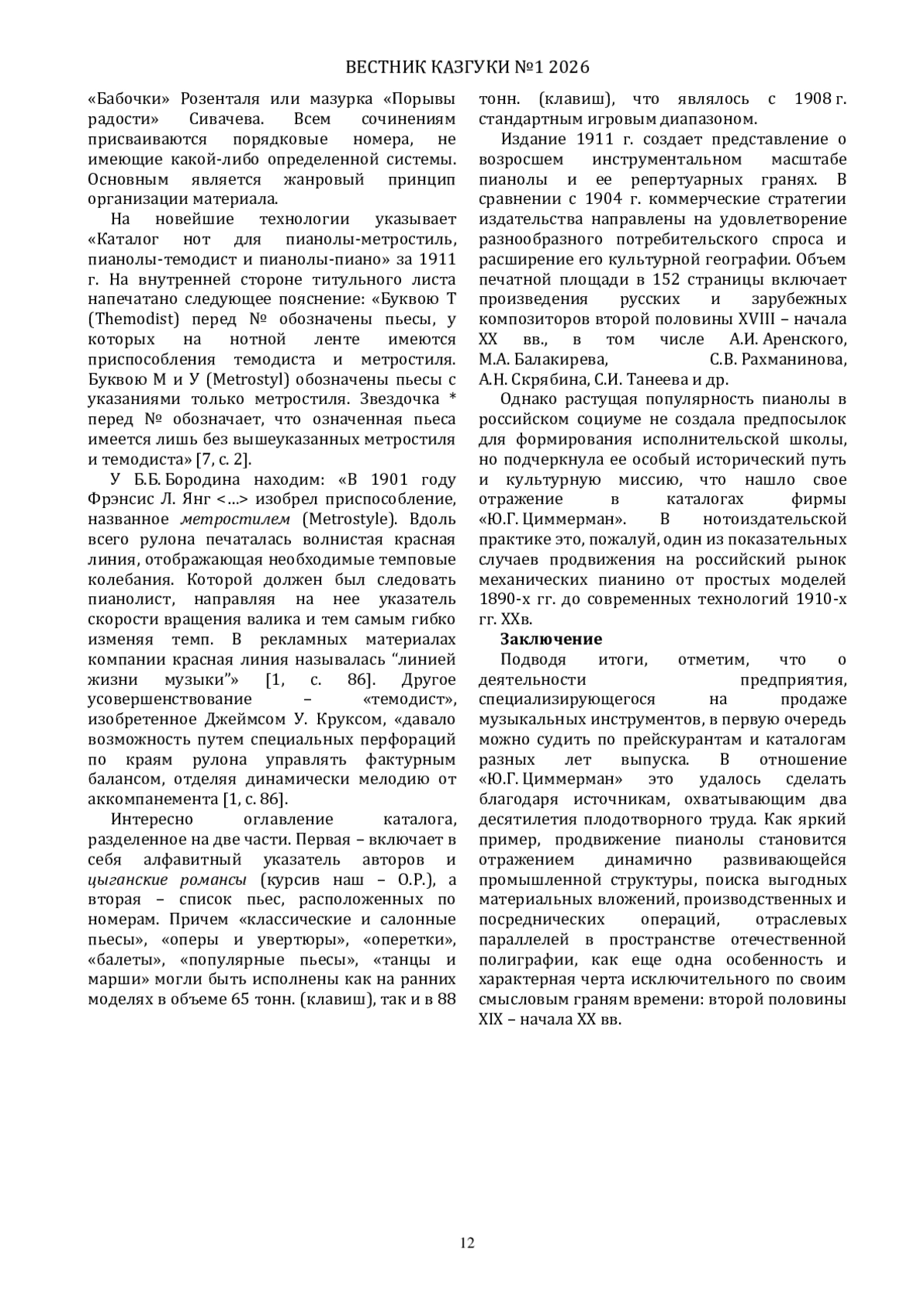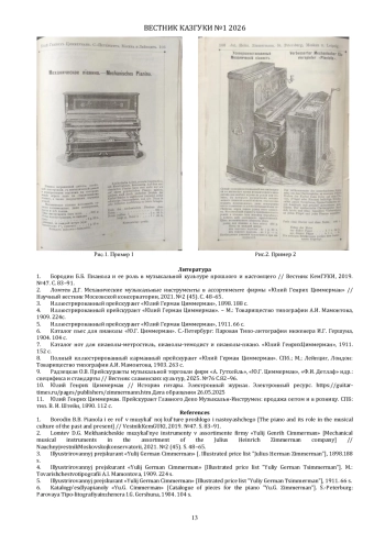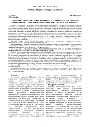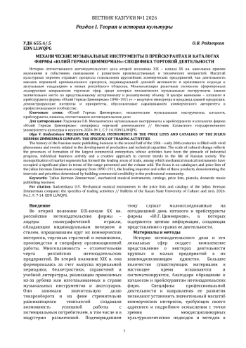 История отечественного нотоиздательского дела второй половины XIX - начала XX вв. наполнена яркими явлениями и событиями, связанными с развитием производственных и технических мощностей. Масштаб культурных перемен отражает процессы становления крупнейших коммерческих предприятий, чья деятельность явилась вершиной промышленного прогресса, индивидуальной деловой активности и креативного подхода к актуальным тенденциям в жизни российского общества. Монополизация рыночных сегментов сформировала лидирующие направления торговых сфер, среди которых механические музыкальные инструменты заняли значительное место по представленному ассортименту и реализуемому объему. В центре внимания - каталоги и прейскуранты фирмы «Юлий Герман Циммерман» 1890-1911 гг. - ведущего импортера и продавца данной продукции, демонстрирующие интересы и приоритеты, обусловленные наращиванием коммерческого авторитета в профессиональном сообществе.
