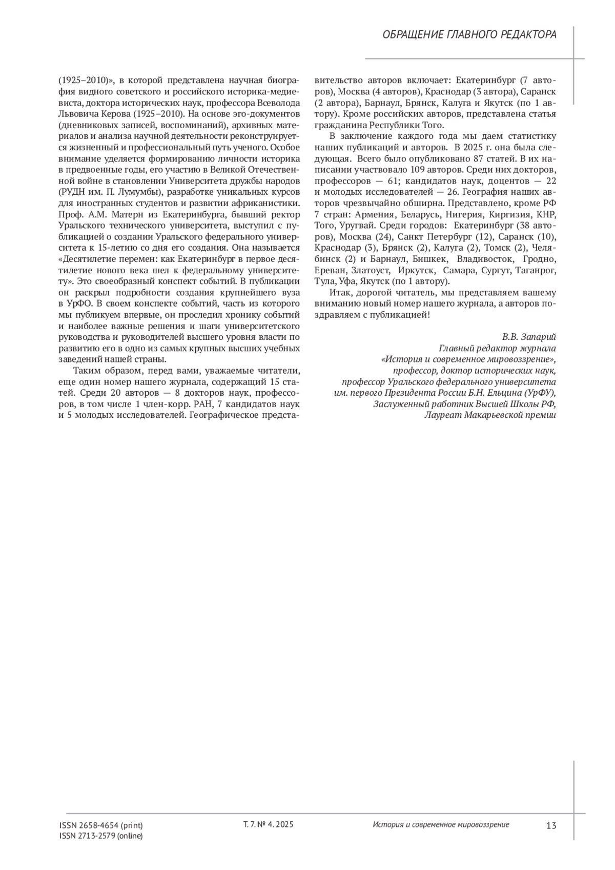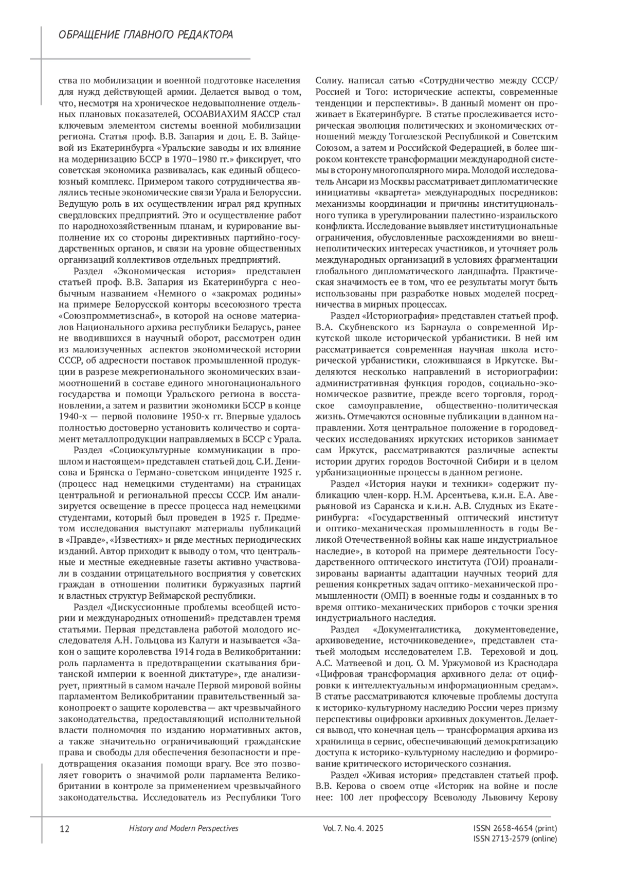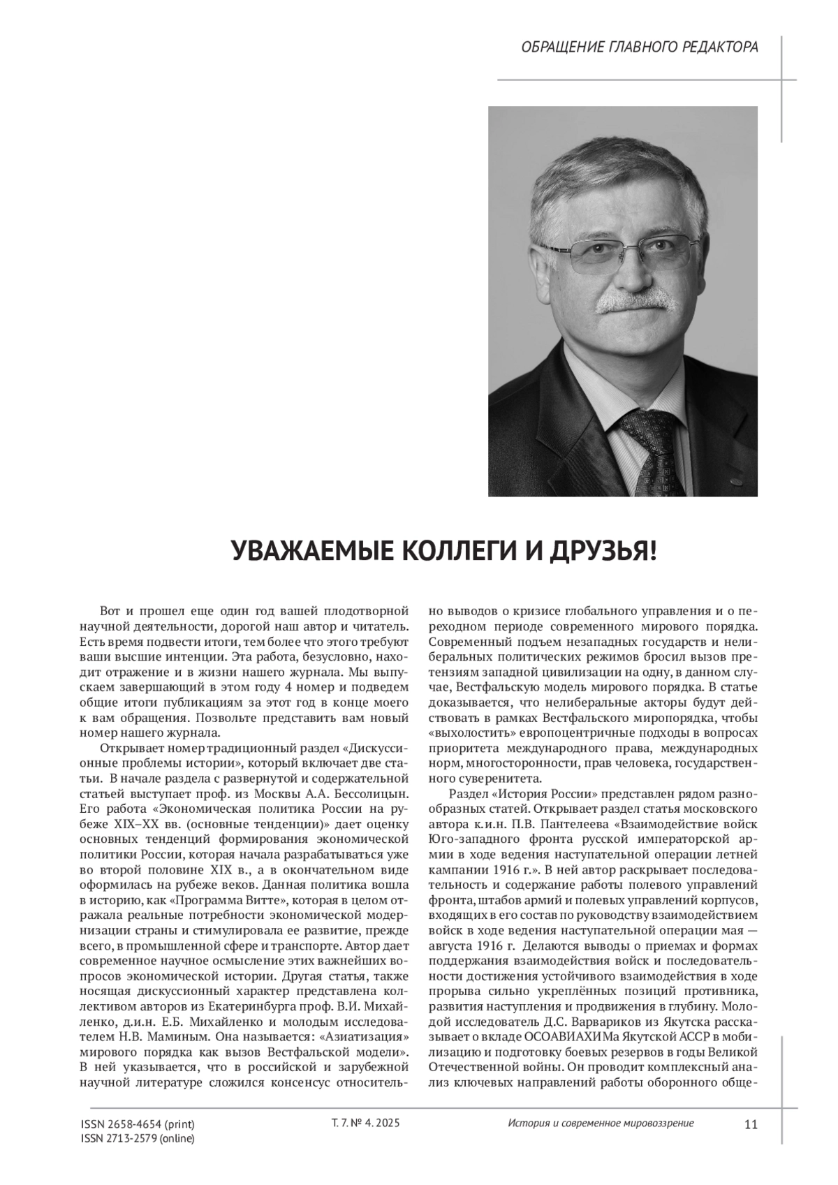 Вот и прошел еще один год вашей плодотворной научной деятельности, дорогой наш автор и читатель. Есть время подвести итоги, тем более что этого требуют ваши высшие интенции. Эта работа, безусловно, находит отражение и в жизни нашего журнала. Мы выпускаем завершающий в этом году 4 номер и подведем общие итоги публикациям за этот год в конце моего к вам обращения. Позвольте представить вам новый номер нашего журнала.