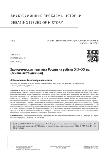 В статье рассмотрены основные тенденции формирования экономической политики России, которая начала разрабатываться уже во второй половине XIX века, а в окончательном виде оформилась на рубеже веков. Этот процесс оказался длительным и противоречивым. В основных чертах эта политика была намечена и частично оформлена министрами финансов: М. Х. Рейтерном, Н. Х. Бунге и И. А. Вышнеградским, а в законченном виде представлена в период министерства С. Ю. Витте (1892–1903 гг.) и в целом продолжена в период министерства В. Н. Коковцова (1904–1914 гг.). Данная политика вошла в историю, как «Программа Витте», которая в целом отражала реальные потребности экономической модернизации страны и стимулировала ее развитие, прежде всего, в промышленной сфере и транспорте. Слабым звеном политики Витте оставалось сельское хозяйство. Хотя реализация Столыпинской аграрной реформы (1906–1912) способствовала его частичной интенсификации, однако, окончательно перевести аграрный сектор на интенсивный лад, так и не удалось, а после отставки В. Н. Коковцова в конце 1913 г. экономическая политика правительства подверглась резкой критике со стороны Государственной Думы и особенно — деятелей торгово-промышленного мира, что способствовало ослаблению политического авторитета монархии в буржуазных кругах.