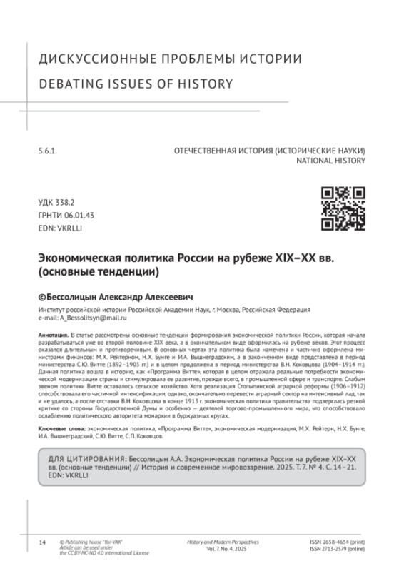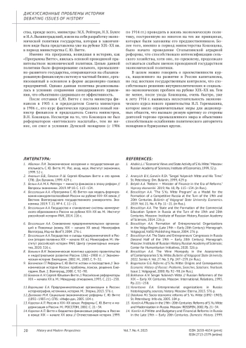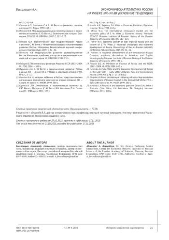 4. Бессолицын А.А. “Программа С. Ю. Витте” как модель формирования конкурентоспособной России на рубеже XIX-XX веков // Вестник Волгоградского государственного университета. Экономика. 2019. Т. 21. № 4. С. 11-21.