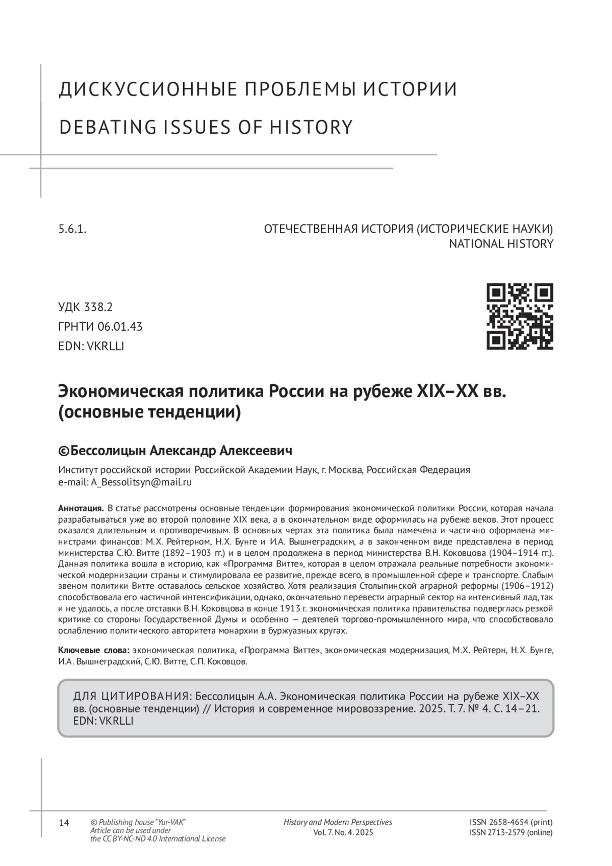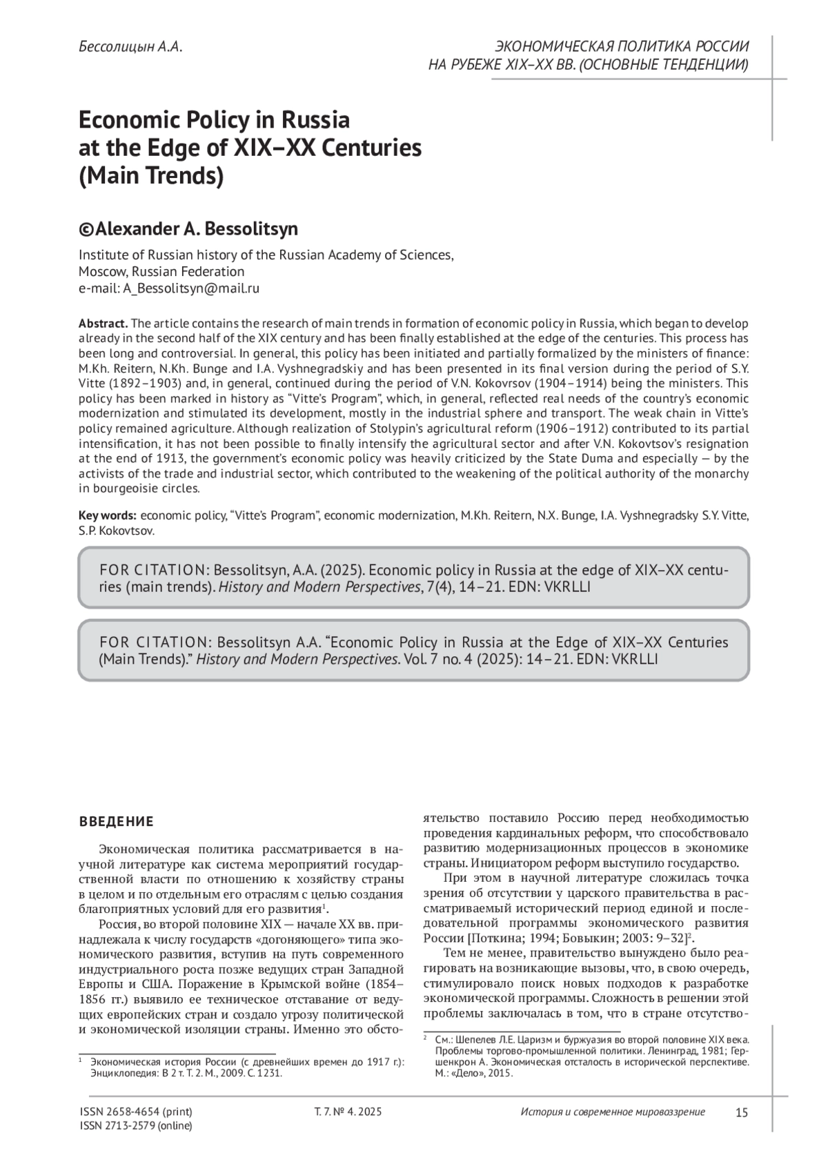 Bessolitsyn A.A. “The S.Yu. Witte Program” as a Model for the Formation of a Competitive Russia at the Turn of the 19th and 20th Centuries. Bulletin of Volgograd State University. Economics. 2019. Vol. 21. No. 4. Pp. 11-21. (in Rus.).