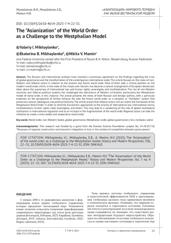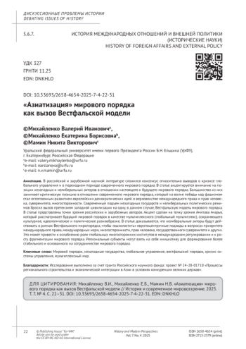 В российской и зарубежной научной литературе сложился консенсус относительно выводов о кризисе глобального управления и о переходном периоде современного мирового порядка. В статье акцентируется внимание на позиции незападных и нелиберальных акторов в отношении настоящего и будущего мирового порядка. Большинство из них занимают критическую позицию в отношении современного мирового порядка, который на волне победы над фашизмом стал естественным развитием европейских демократических идей о верховенстве международного права и прав человека, суверенитета, многосторонности. Современный подъем незападных государств и нелиберальных политических режимов бросил вызов претензиям западной цивилизации на одну, в данном случае, Вестфальскую модель мирового порядка. В статье представлены точки зрения российских и зарубежных авторов. Акцент сделан на точку зрения Амитава Ачарья, который рассматривает будущий мировой порядок в качестве мультиплексного (глобальный мультиплекс), сохраняющего культурное, идеологическое и политическое разнообразие. В статье доказывается, что нелиберальные акторы будут действовать в рамках Вестфальского миропорядка, чтобы «выхолостить» европоцентричные подходы в вопросах приоритета международного права, международных норм, многосторонности, прав человека, государственного суверенитета и других. Это может привести к ослаблению роли глобальных многосторонних институтов в международном регулировании и к росту фрагментации мирового порядка. Региональные субъекты могут взять на себя инициативу для формирования более стабильного и основанного на сотрудничестве мирового порядка.