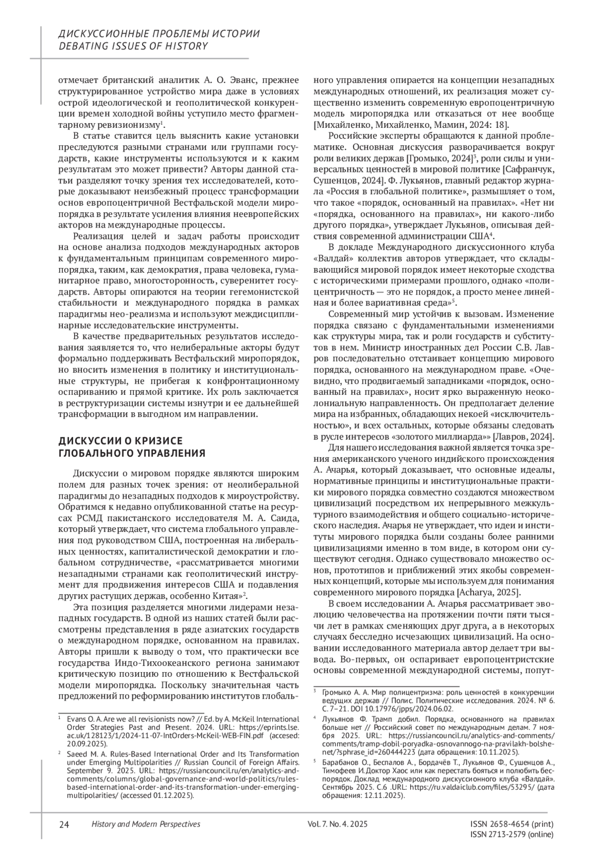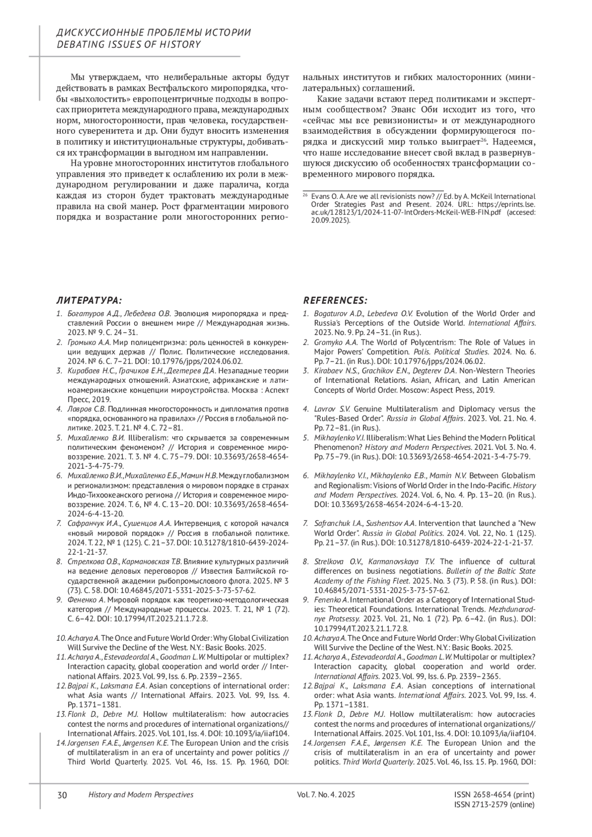 4. Лавров С.В. Подлинная многосторонность и дипломатия против “порядка, основанного на правилах” // Россия в глобальной политике. 2023. Т. 21. № 4. С. 72-81.