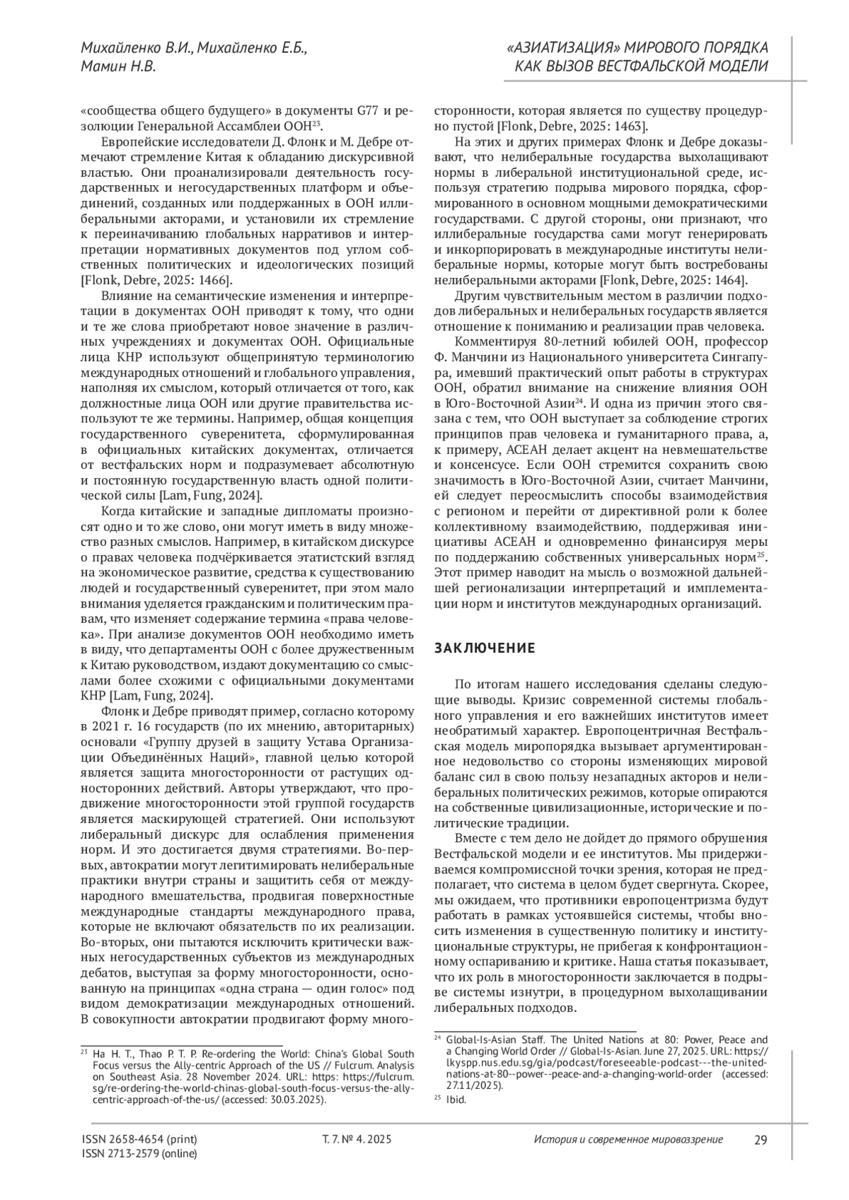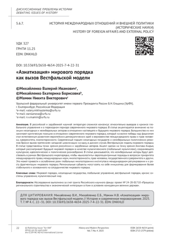 6. Михайленко В.И., Михайленко Е.Б., Мамин Н.В. Между глобализмом и регионализмом: представления о мировом порядке в странах Индо-Тихоокеанского региона // История и современное мировоззрение. 2024. Т. 6, № 4. С. 13-20. DOI: 10.33693/2658-4654-2024-6-4-13-20