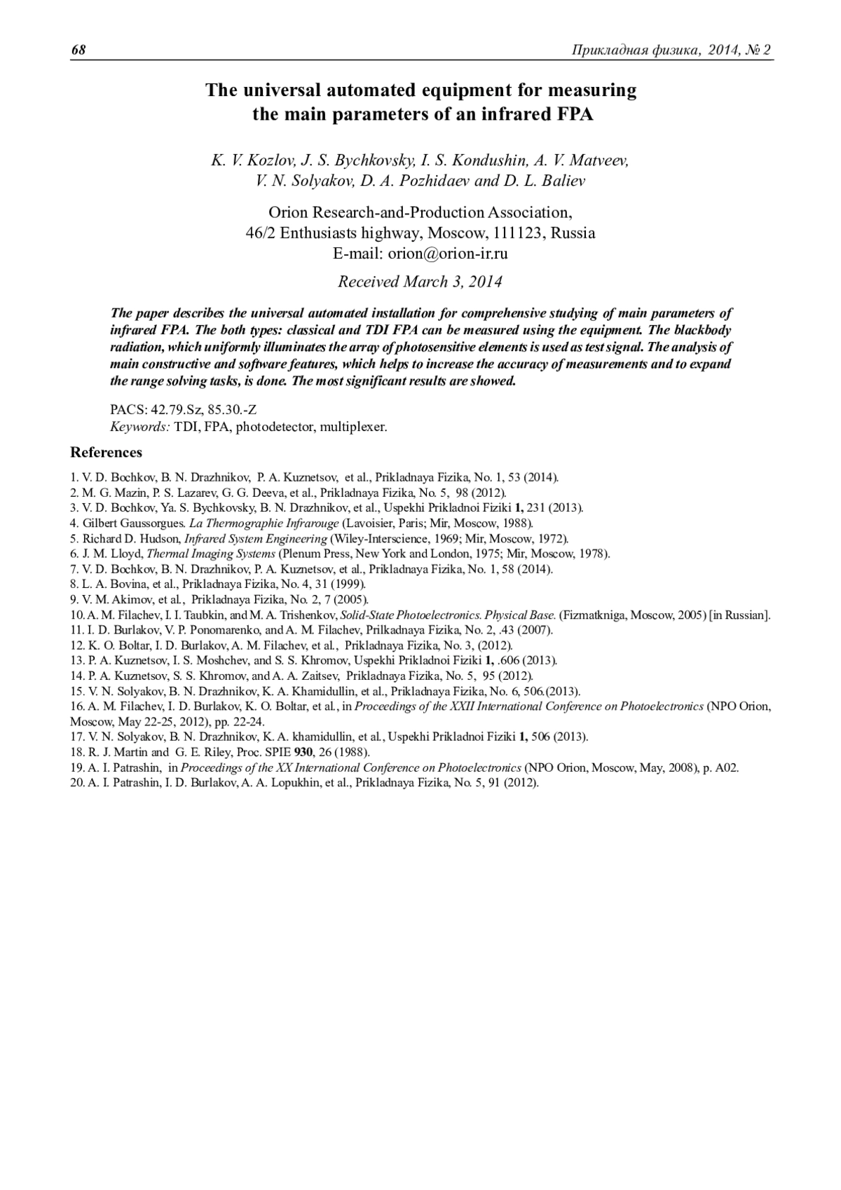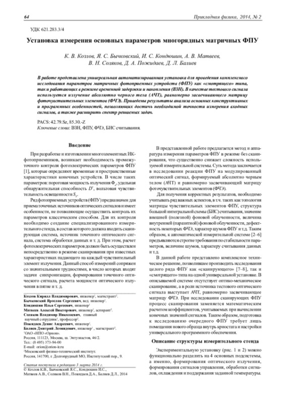 В работе представлена универсальная автоматизированная установка для проведения комплексного исследования параметров матричных фотоприемных устройств (ФПУ) как «смотрящего» типа, так и работающих в режиме временной задержки и накопления (ВЗН). В качестве тестового сигнала используется излучение абсолютно черного тела (АЧТ), равномерно засвечивающего матрицу фоточувствительных элементов (ФЧЭ). Приведены результаты анализа основных конструктивных и программных особенностей, позволяющих достичь необходимой точности измерения входных сигналов, а также расширить спектр решаемых задач.