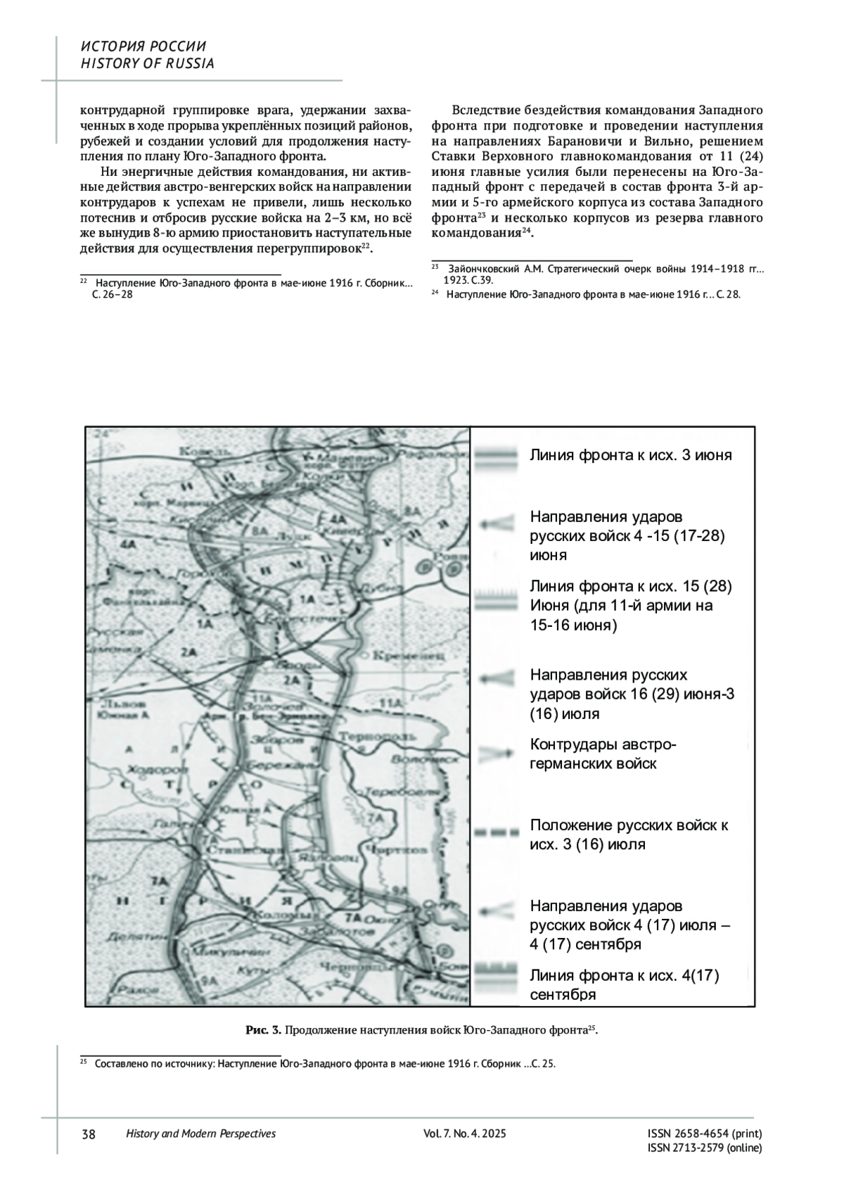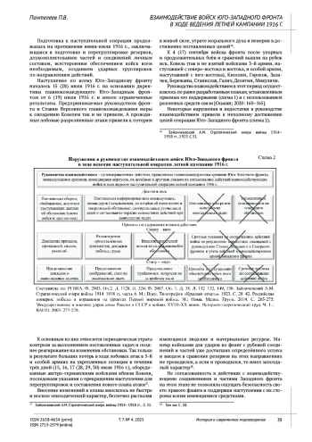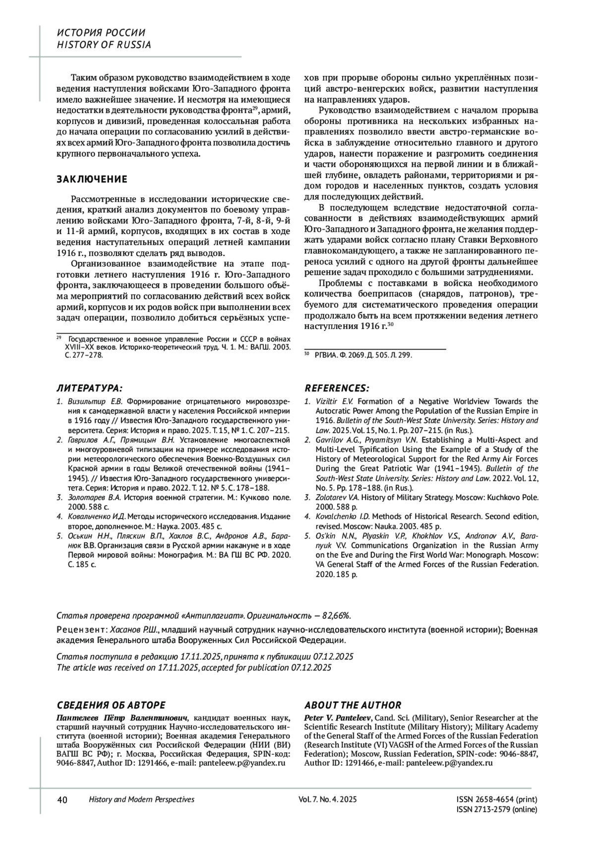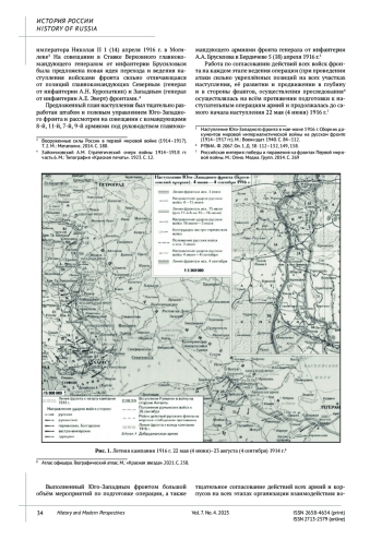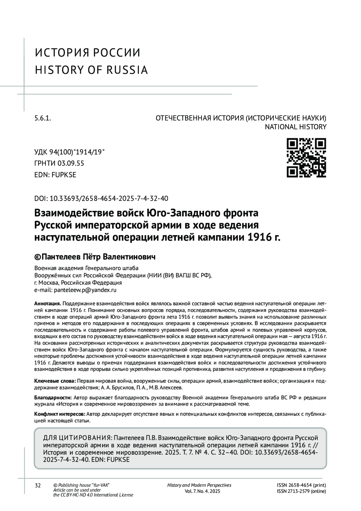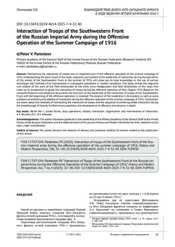 Поддержание взаимодействия войск являлось важной составной частью ведения наступательной операции летней кампании 1916 г. Понимание основных вопросов порядка, последовательности, содержания руководства взаимодействием в ходе операций армий Юго-Западного фронта лета 1916 г. позволит выявить знания на использование различных приемов и методов его поддержания в последующих операциях в современных условиях. В исследовании раскрывается последовательность и содержание работы полевого управлений фронта, штабов армий и полевых управлений корпусов, входящих в его состав по руководству взаимодействием войск в ходе ведения наступательной операции мая — августа 1916 г. На основании рассмотренных исторических и аналитических документах раскрывается структура руководства взаимодействием войск Юго-Западного фронта с началом наступательной операции. Формулируется сущность руководства, а также некоторые проблемы достижения устойчивости взаимодействия в ходе ведения наступательной операции летней кампании 1916 г. Делаются выводы о приемах поддержания взаимодействия войск и последовательности достижения устойчивого взаимодействия в ходе прорыва сильно укреплённых позиций противника, развития наступления и продвижения в глубину.