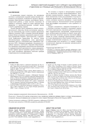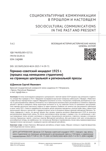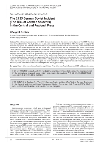 В статье анализируется освещение в центральной и местной прессе СССР процесса над немецкими студентами, который был проведен в 1925 г. Предметом исследования выступают материалы публикаций в «Правде», «Известиях» и ряде местных периодических изданий. Обращается внимание на стиль и тональность материалов, размещенных в газетах по рассматриваемому событию. Отмечается, что в публикациях возможны были расхождения в изложении отдельных деталей и фактов в освещении. Автор акцентирует внимание на то, что советская печать на протяжении рассматриваемого периода достаточно пристально следила за ходом процесса. Особенно это заметно при рассмотрении публикаций в июне–июле 1925 г. Газеты в подробностях описывали детали допросов подсудимых, отмечая особо связь с фашистской организацией «Консул», причастной к террористическим актам в отношении видных деятелей веймарской Германии. Читатель подводился к мысли, что данный процесс был призван привлечь внимание общественности СССР на опасность распространения фашистской угрозы. По итогам рассмотрения автор приходит к выводу о том, что центральные и местные ежедневные газеты активно участвовали в создании отрицательного восприятия у советских граждан в отношении политики буржуазных партий и властных структур Веймарской республики. Для достижения этой цели использовались разнообразные методы, как вербальные, так и визуальные. Всемерно подчёркивалась тесная связь правоконсервативных террористических организаций с правящими кругами веймарской республики.
