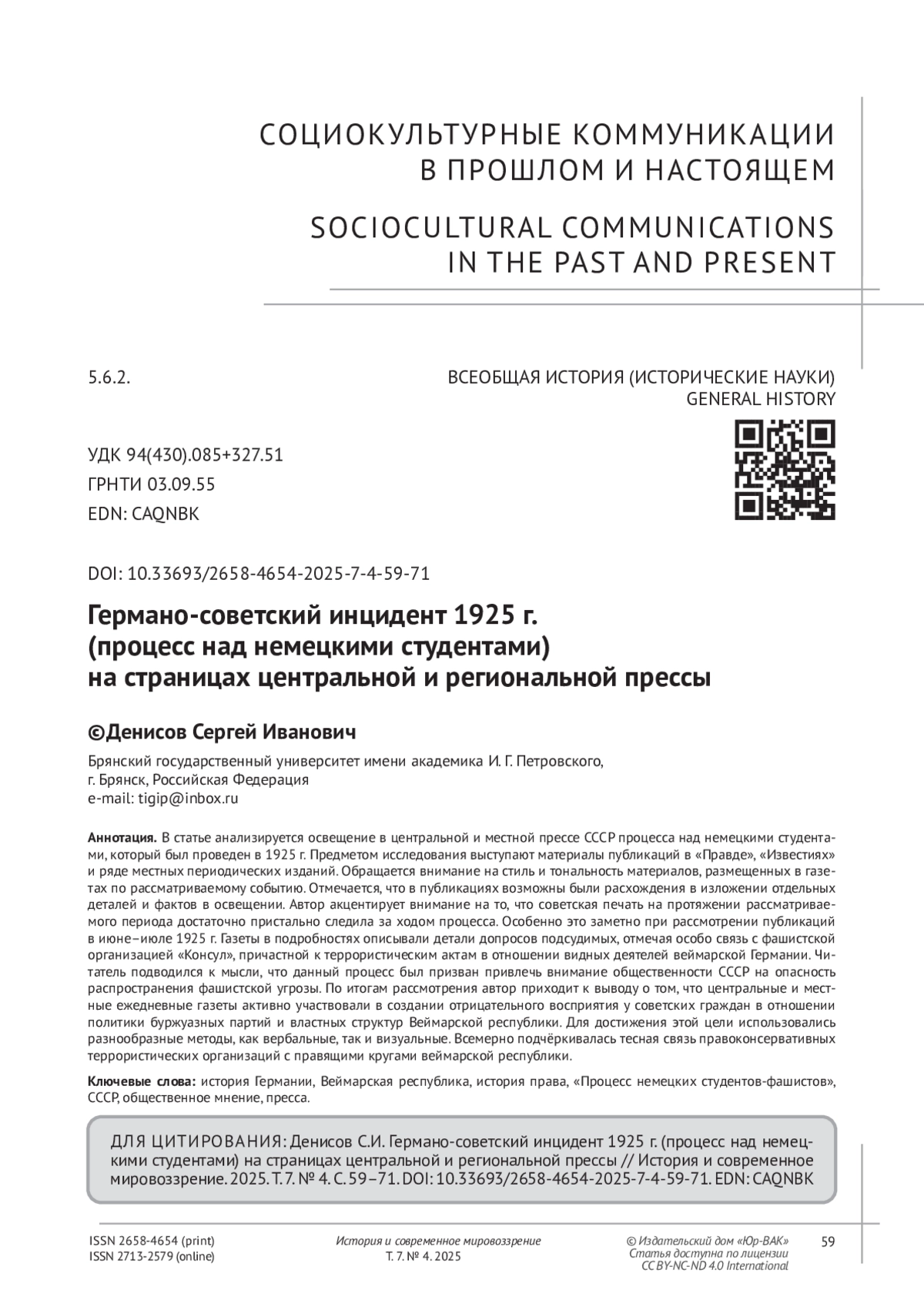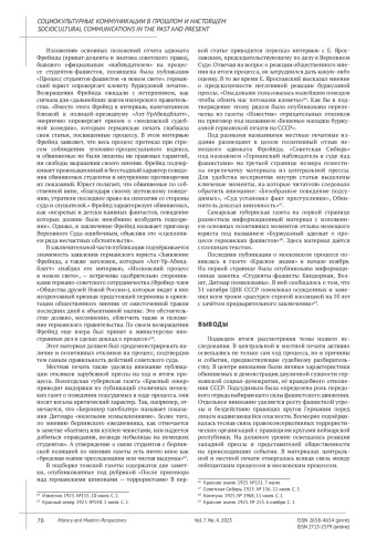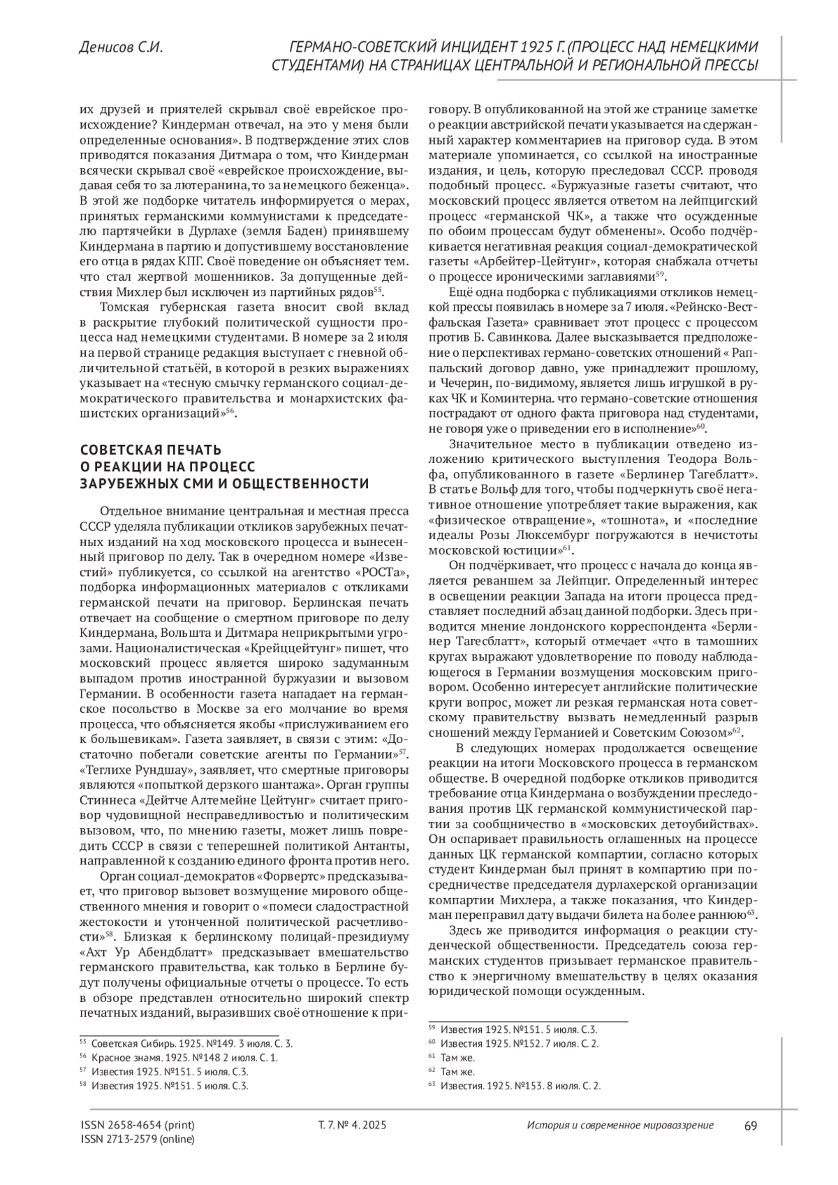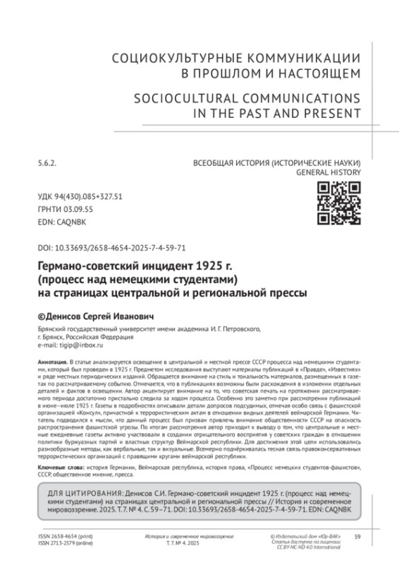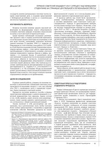 4. Денисов С.И. Лейпцигский процесс 1925 г. (дело о германской ЧК) на страницах советской региональной прессы // История и современное мировоззрение. 2024. Т. 6, № 3. С. 119-127.