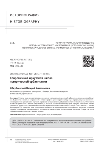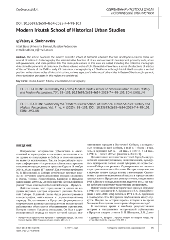 В статье рассматривается современная научная школа исторической урбанистики, сложившаяся в Иркутске. Выделяются несколько направлений в историографии: административная функция городов, социально-экономическое развитие, прежде всего торговля, городское самоуправление, общественно-политическая жизнь. Отмечаются основные публикации в данном направлении, в их числе коллективная монография «Иркутск в панораме веков», трёхтомник трудов Л. М. Дамешека «Избранное», серия сборников статей «Города Сибири XVIII — начала ХХ веков», монографии В. П. Шахерова. Хотя центральное положение в городоведческих исследованиях иркутских историков занимает сам Иркутск, рассматриваются различные аспекты истории других городов Восточной Сибири и в целом урбанизационные процессы в данном регионе.