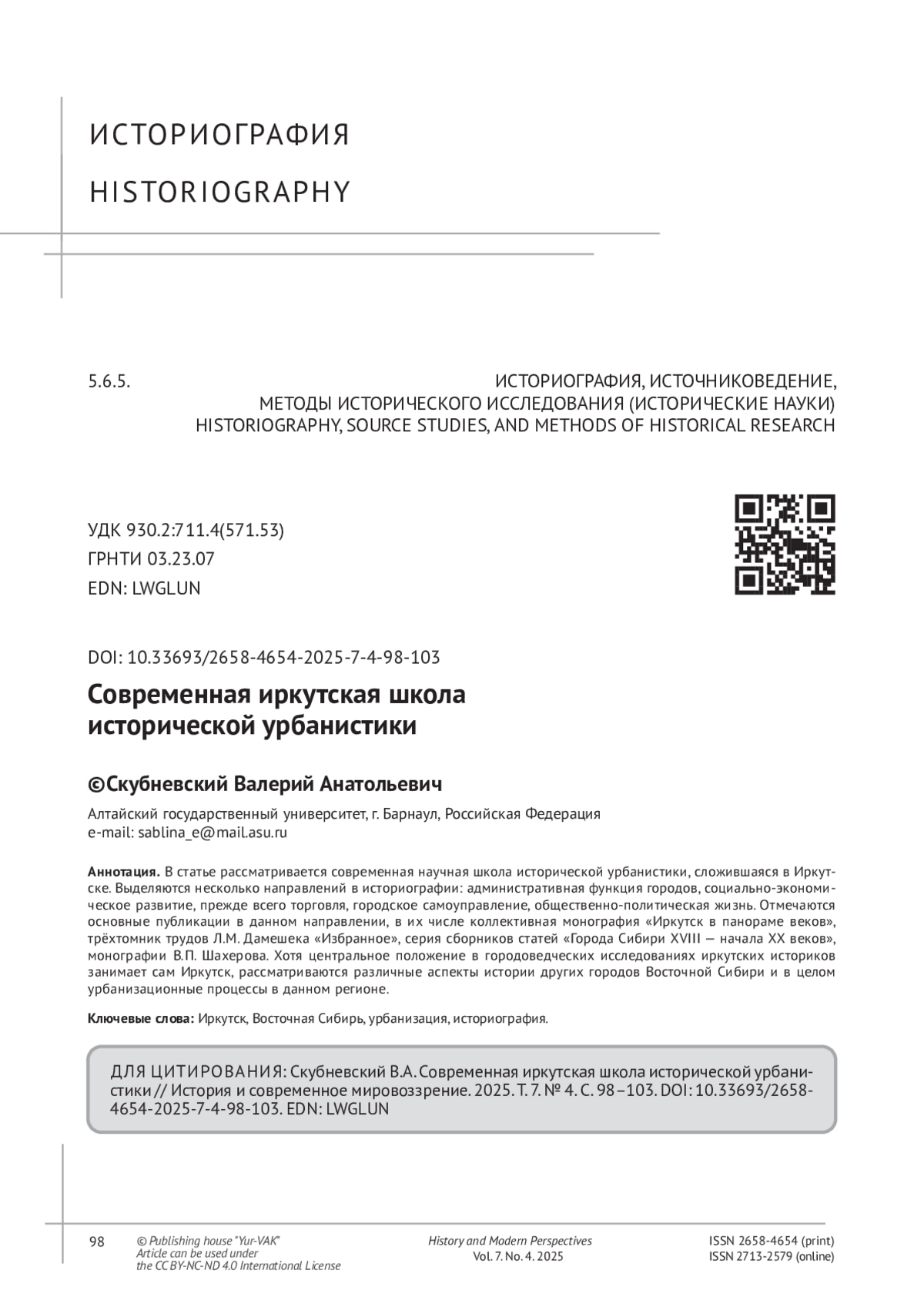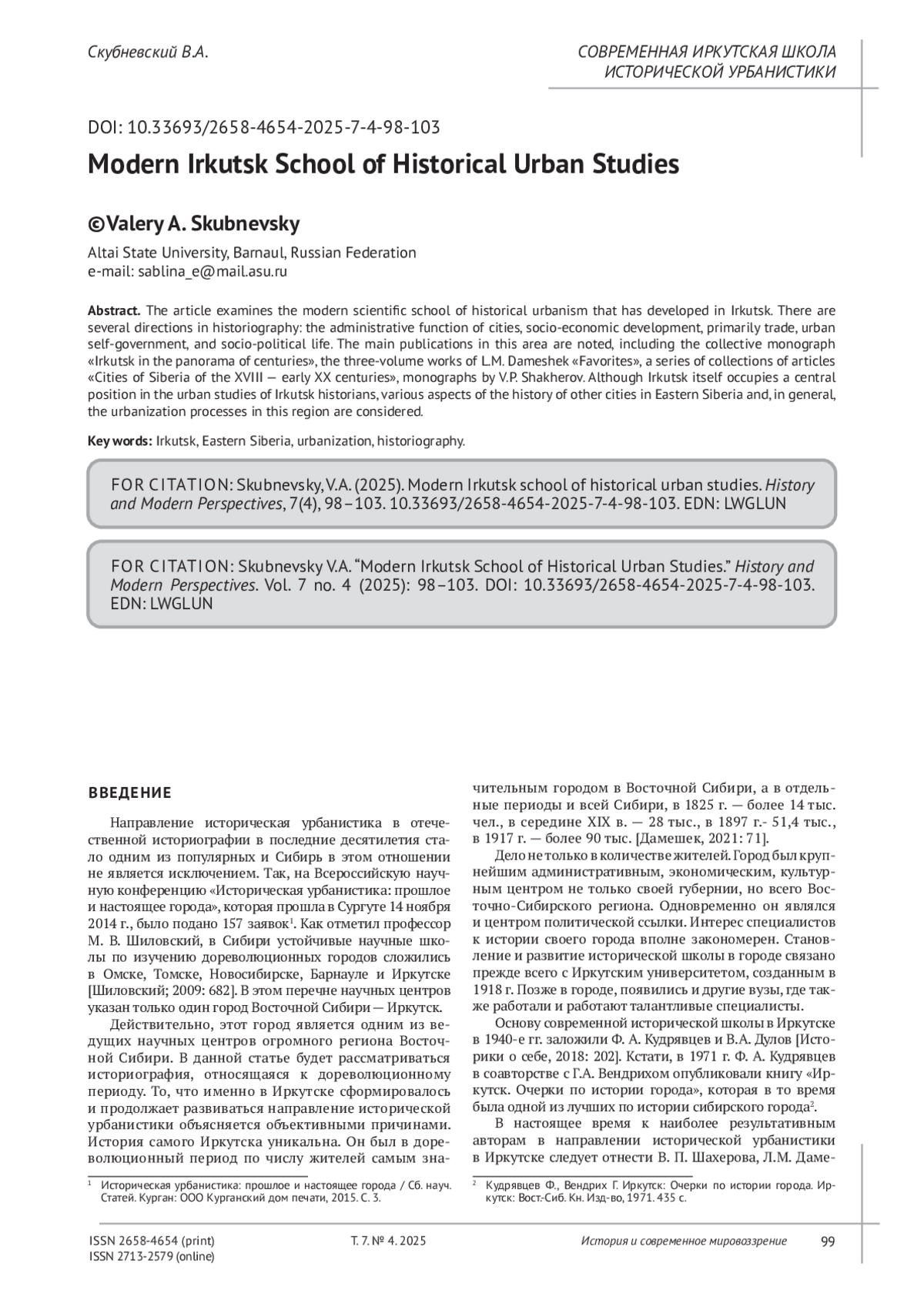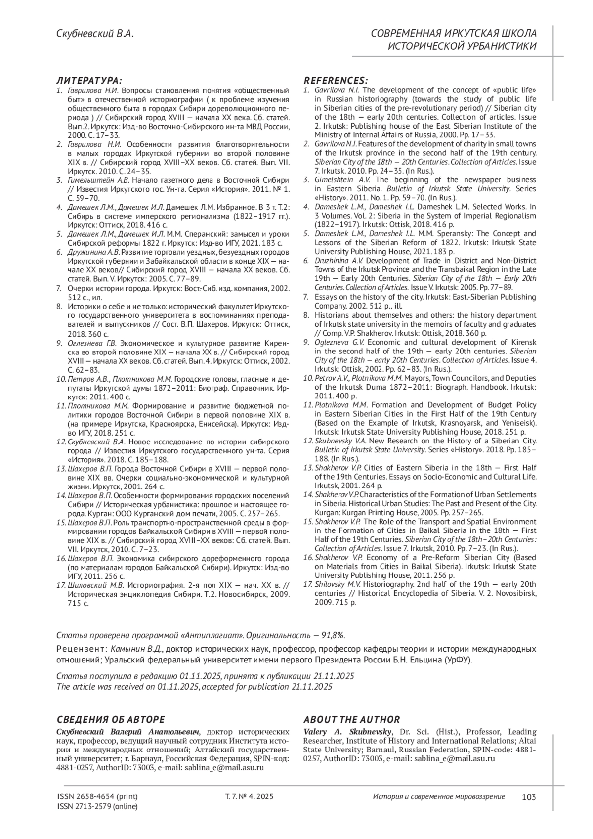 12. Скубневский В.А. Новое исследование по истории сибирского города // Известия Иркутского государственного ун-та. Серия “История”. 2018. С. 185-188.