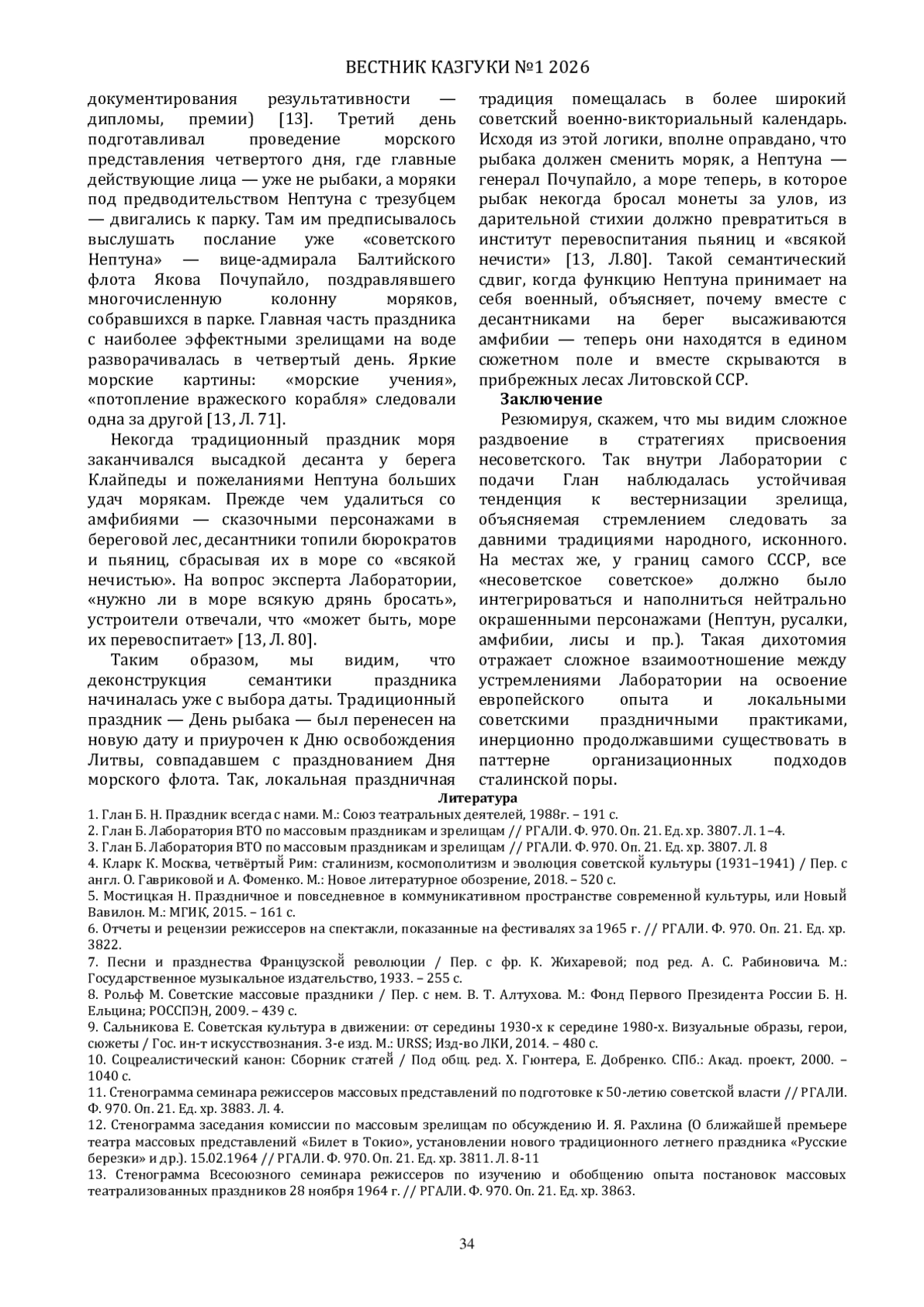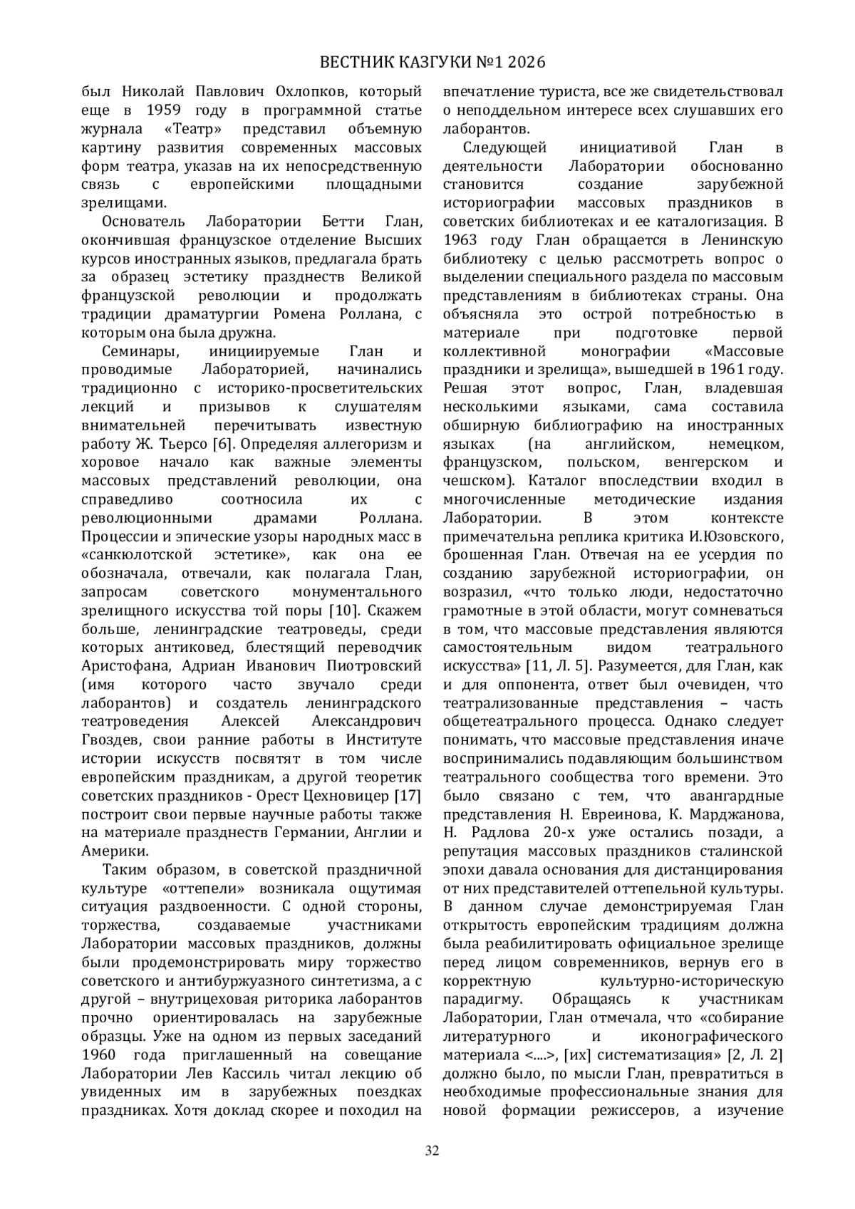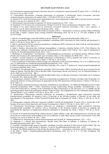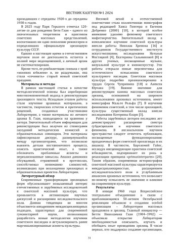 Настоящая работа посвящена исследованию феномена «оттепельных» трансформаций советской праздничной культуры и опыта интеграции в нее элементов, не вписывающихся в каноны сталинского ритуализма. Актуальность обусловлена необходимостью переосмысления советской зрелищности в контексте социально-культурных изменений 1950-х годов. В фокусе анализа - деятельность Бетти Глан, ключевой фигуры в обновлении массовых представлений и руководителя ЦПКиО им. Горького, чья биография отражает противоречия эпохи. Исследование, опирающееся на мемуарные источники и историко-культурный анализ, демонстрирует стремление Глан к возрождению авангардных практик 1920-х годов, противопоставленных регламентированному эстетическому дискурсу 1930-х. Работа выявляет механизмы и формы включения «несоветского» опыта в ткань праздничных зрелищ, а также роль Парка Горького как экспериментальной «лаборатории» массовых представлений. Полученные результаты позволяют расширить представление о советской зрелищной культуре как сложном и неоднородном явлении.